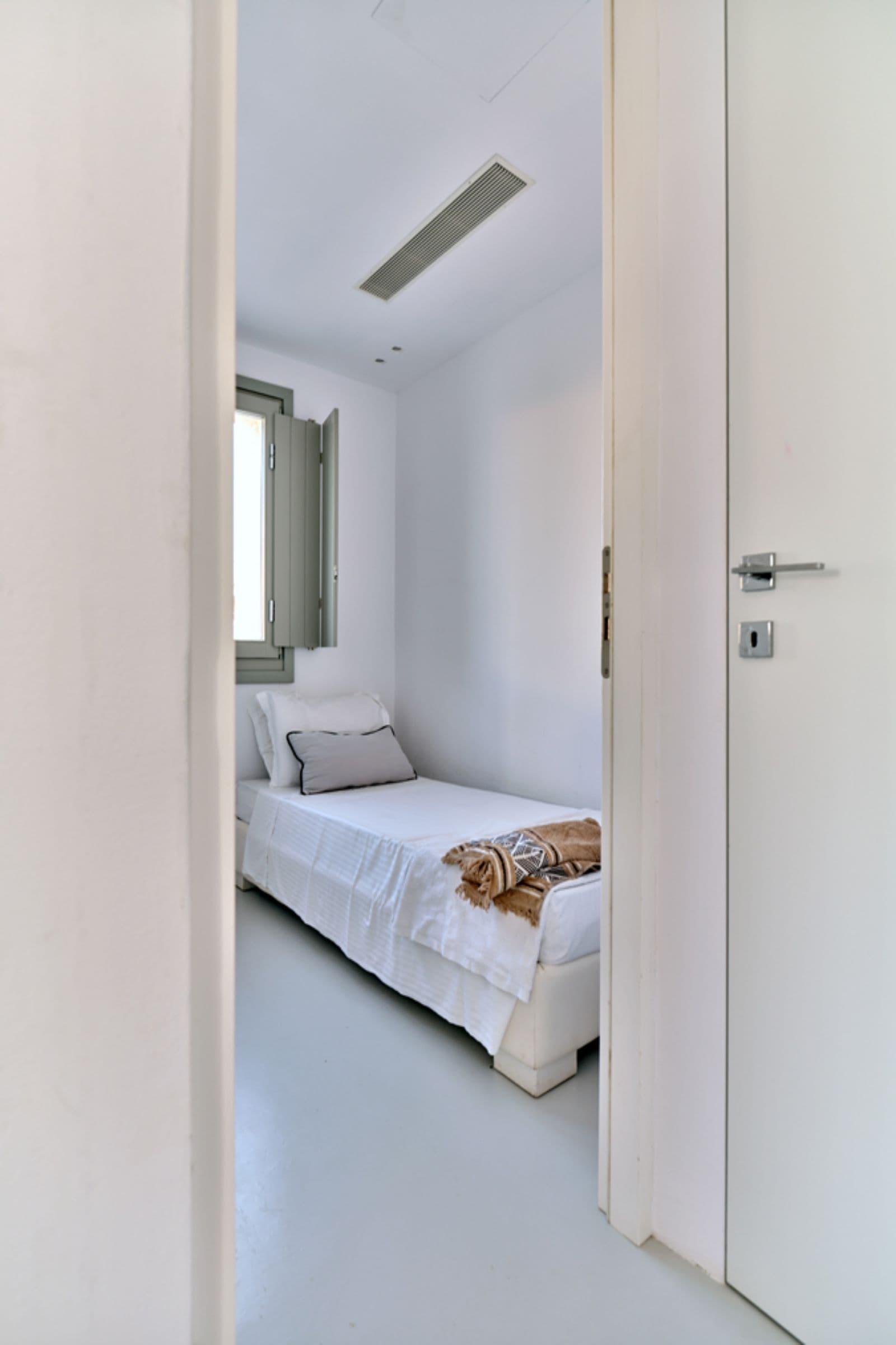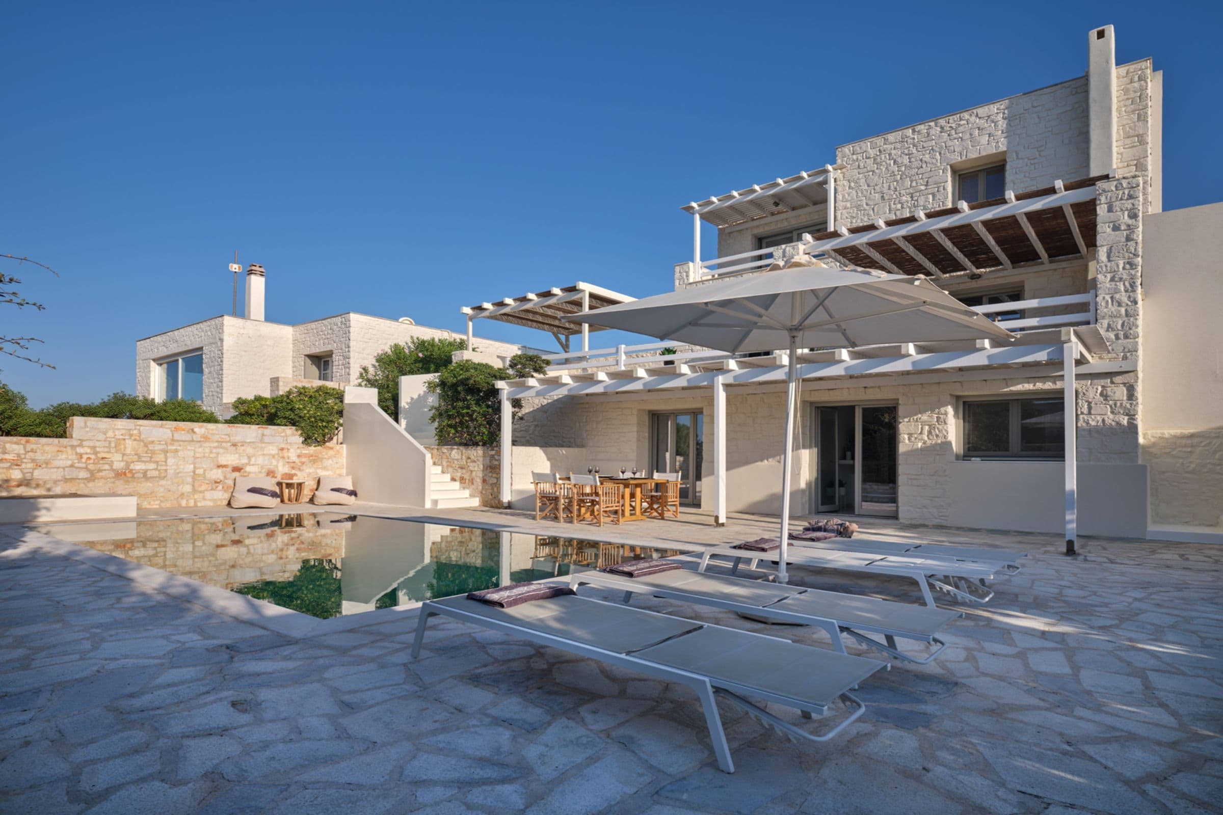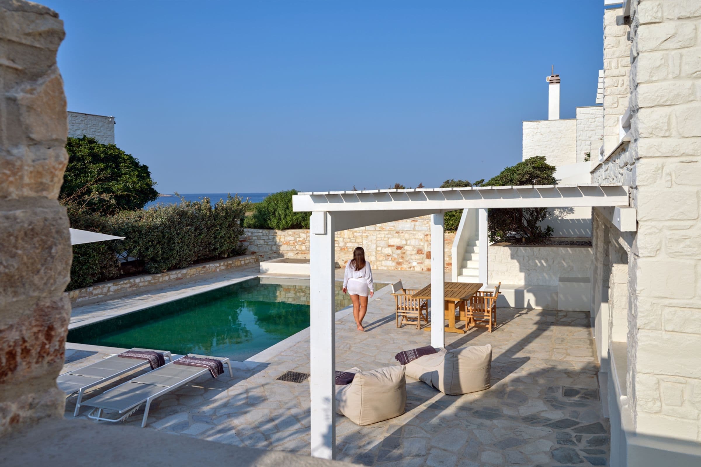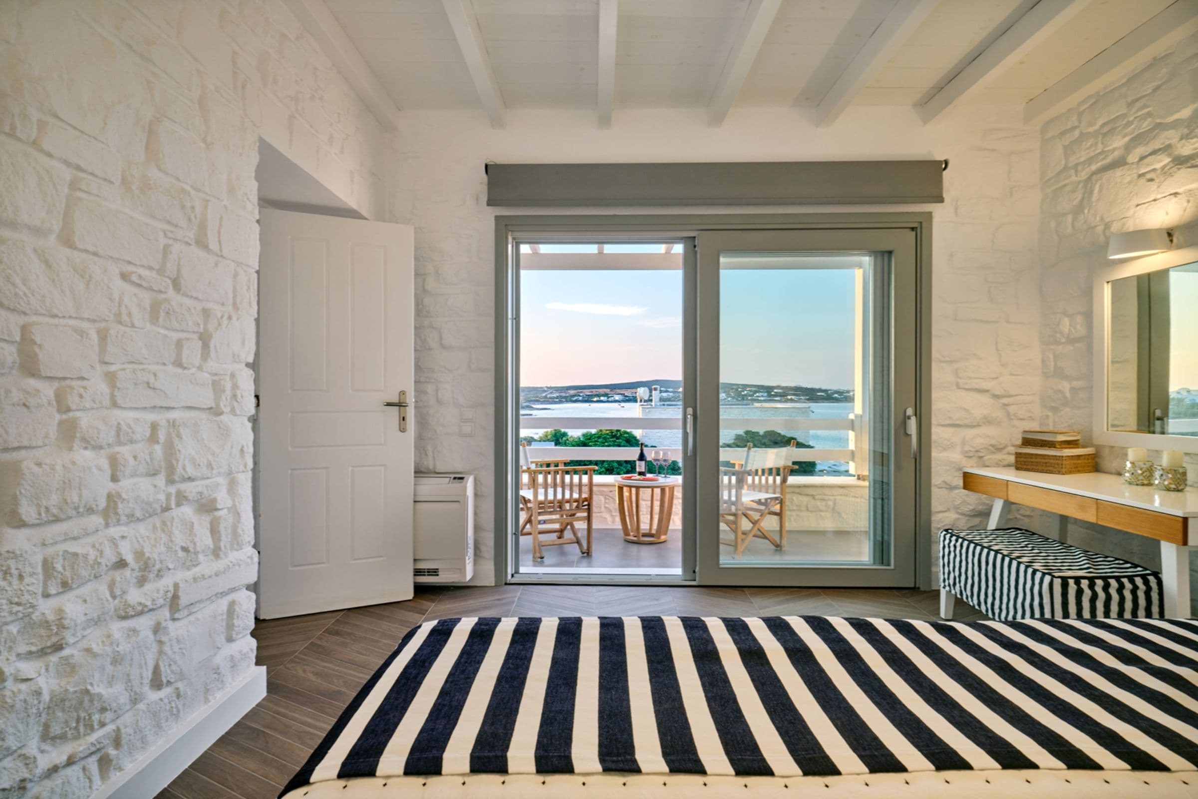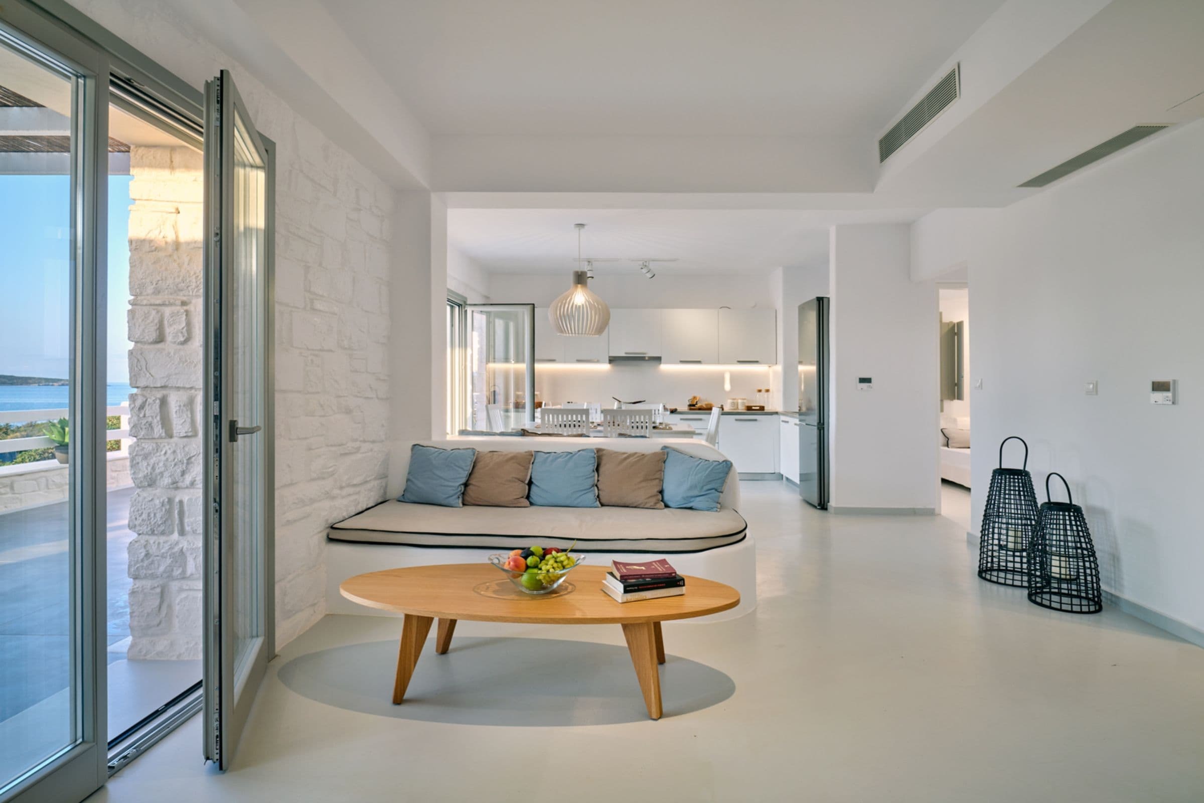 Open, light-filled living areas designed to frame uninterrupted views across Santa Maria Bay and toward Naxos. The main lounge flows seamlessly onto the shaded veranda and pool terrace, creating a natural indoor-outdoor environment where the landscape becomes part of the experience. Soft, minimal interiors and clean architectural lines create a calm, effortless atmosphere throughout.