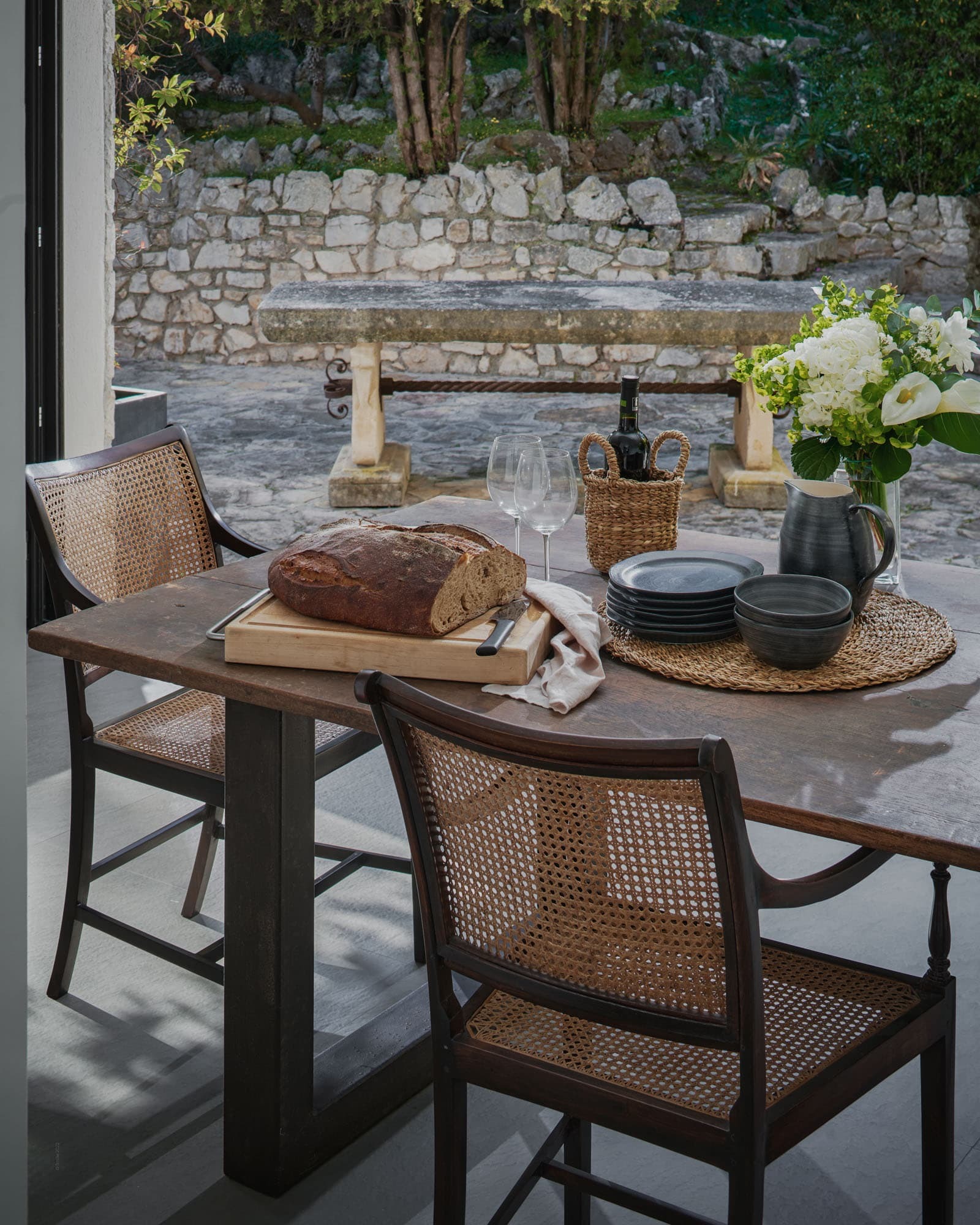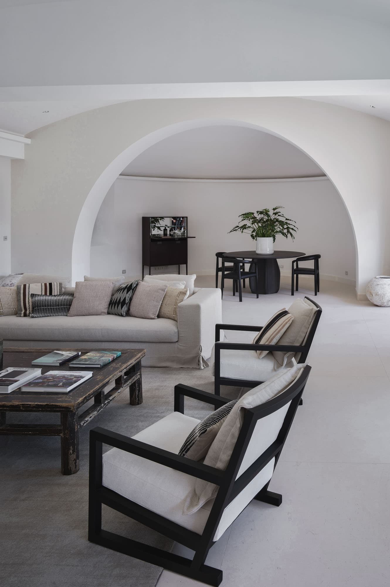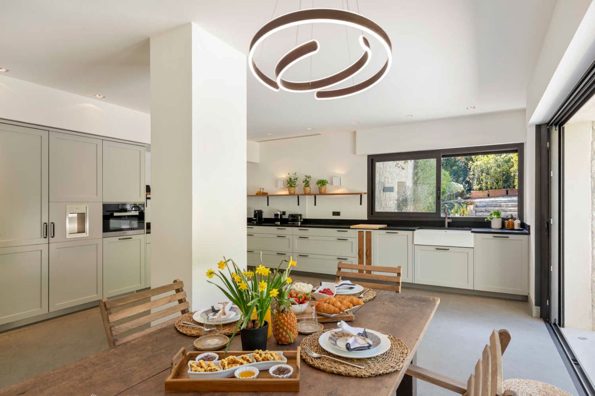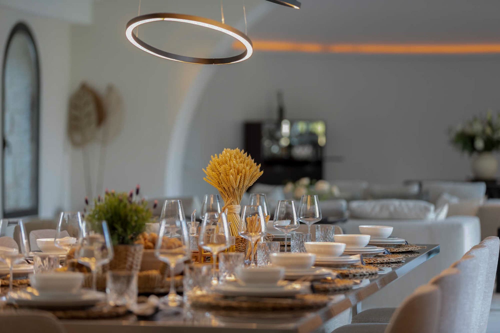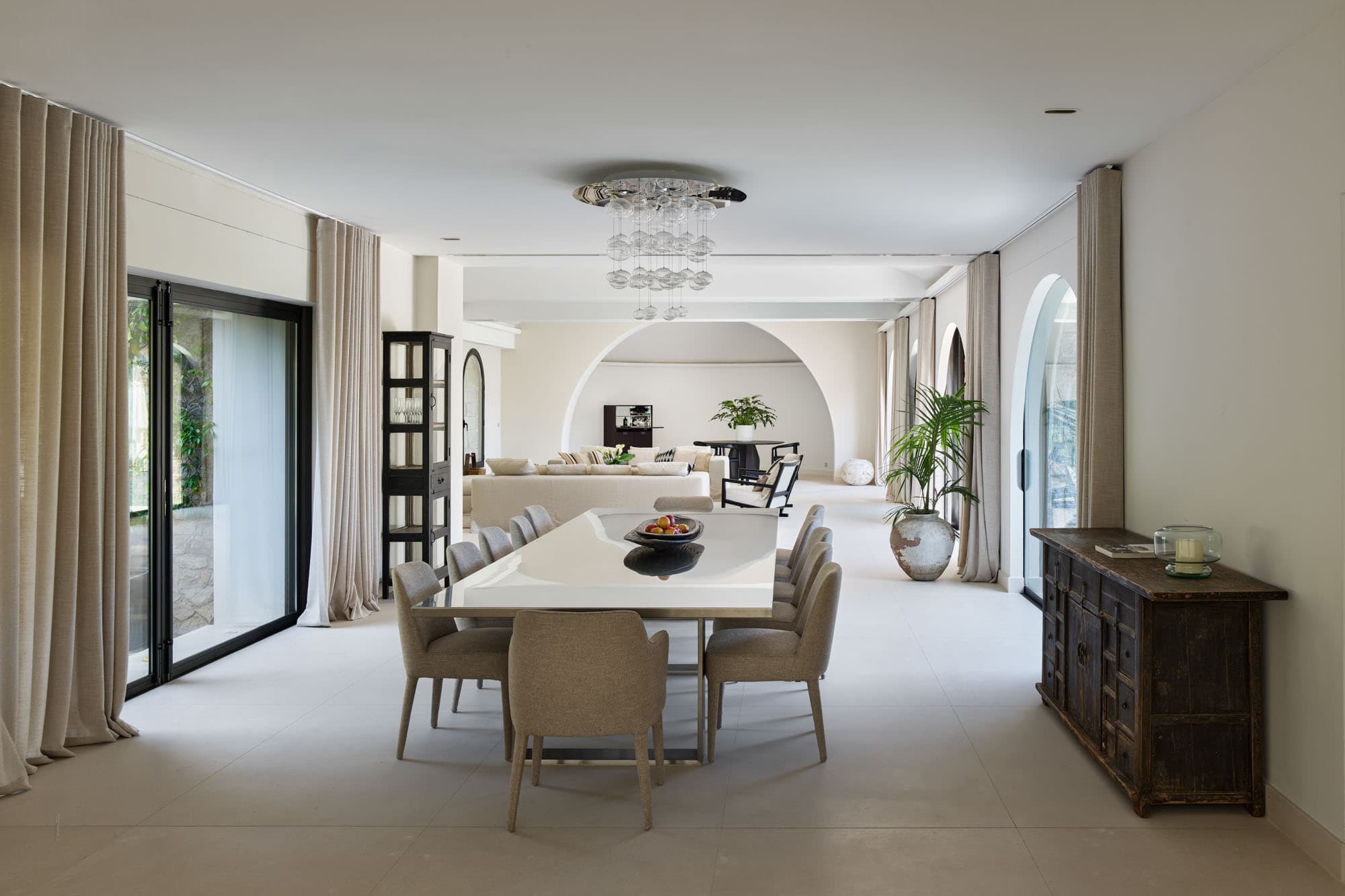 A fully equipped modern kitchen balances functionality with understated elegance, suitable for both self-catering and private chef service. Indoor dining is complemented by shaded outdoor terraces designed for long Mediterranean lunches and candlelit dinners beneath the open sky. The estate’s scale allows for refined private dining experiences within a truly secluded setting.