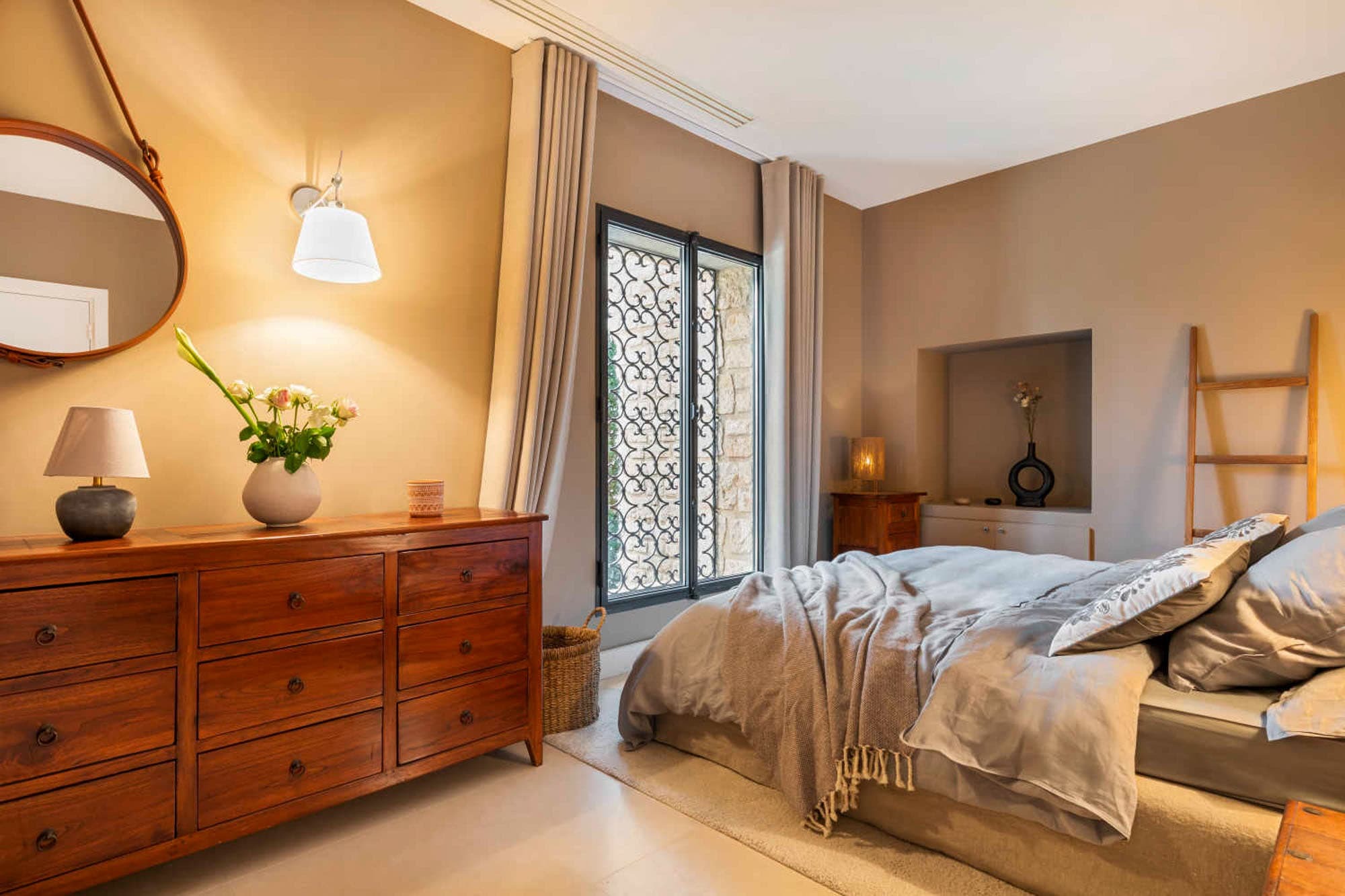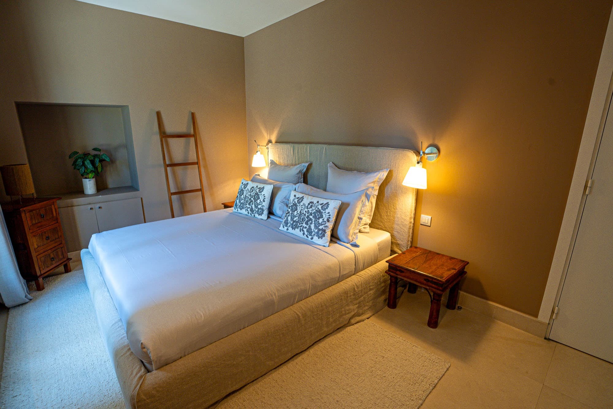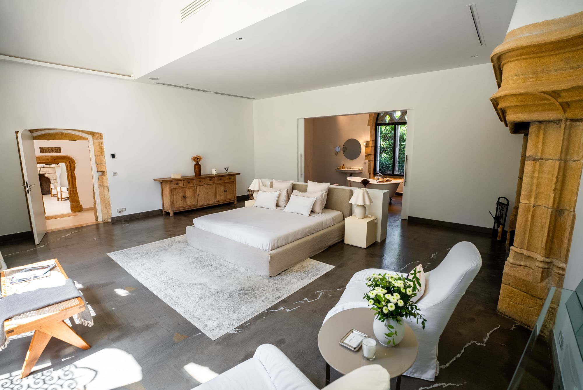 Six private suites accommodate up to 12 guests, each conceived as a tranquil retreat. Bedrooms feature king-size beds, curated furnishings, and views across gardens or distant sea horizons. En suite bathrooms ensure privacy and comfort for every guest. Professional housekeeping services are included, and laundry facilities are managed discreetly by the villa team to support longer stays.