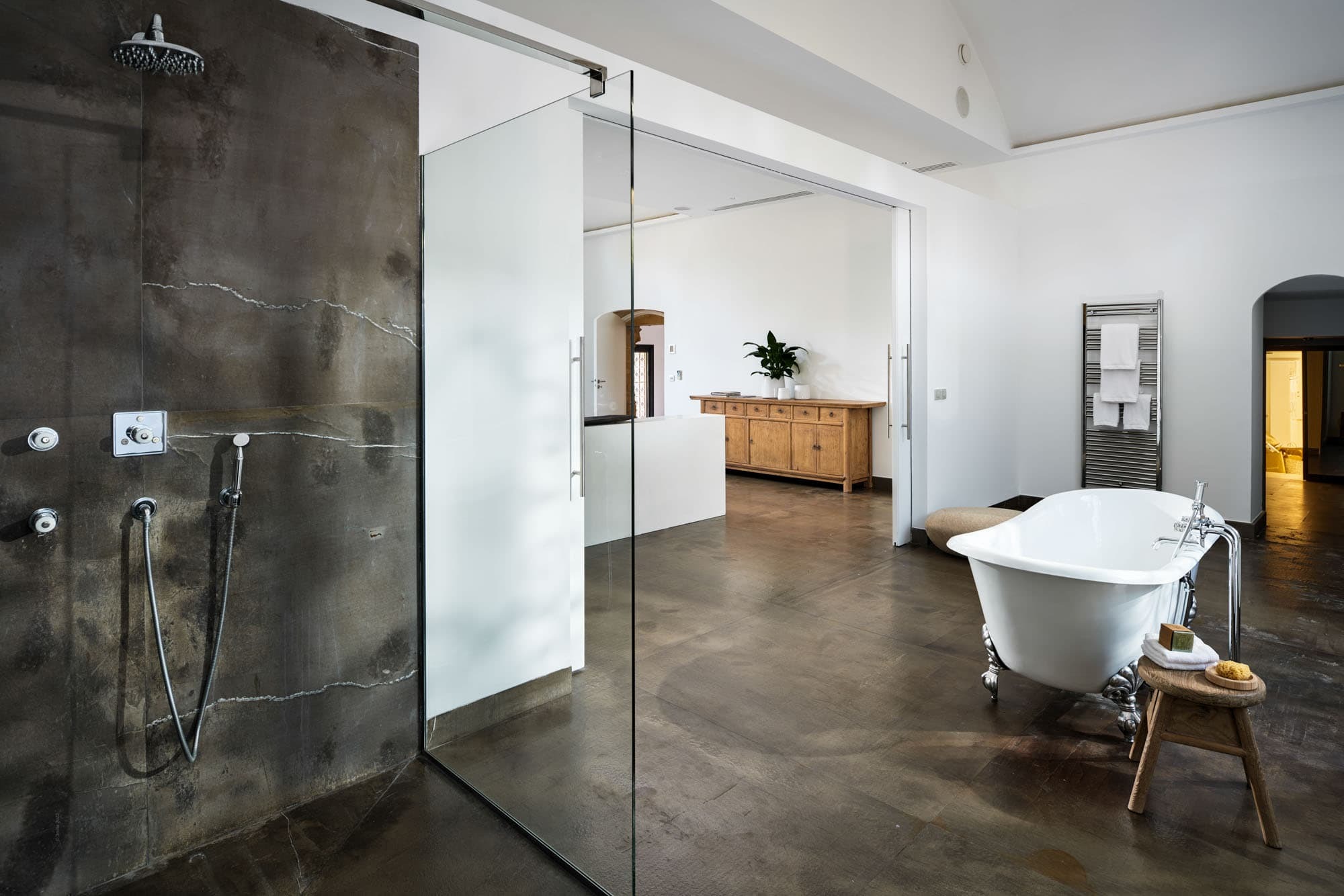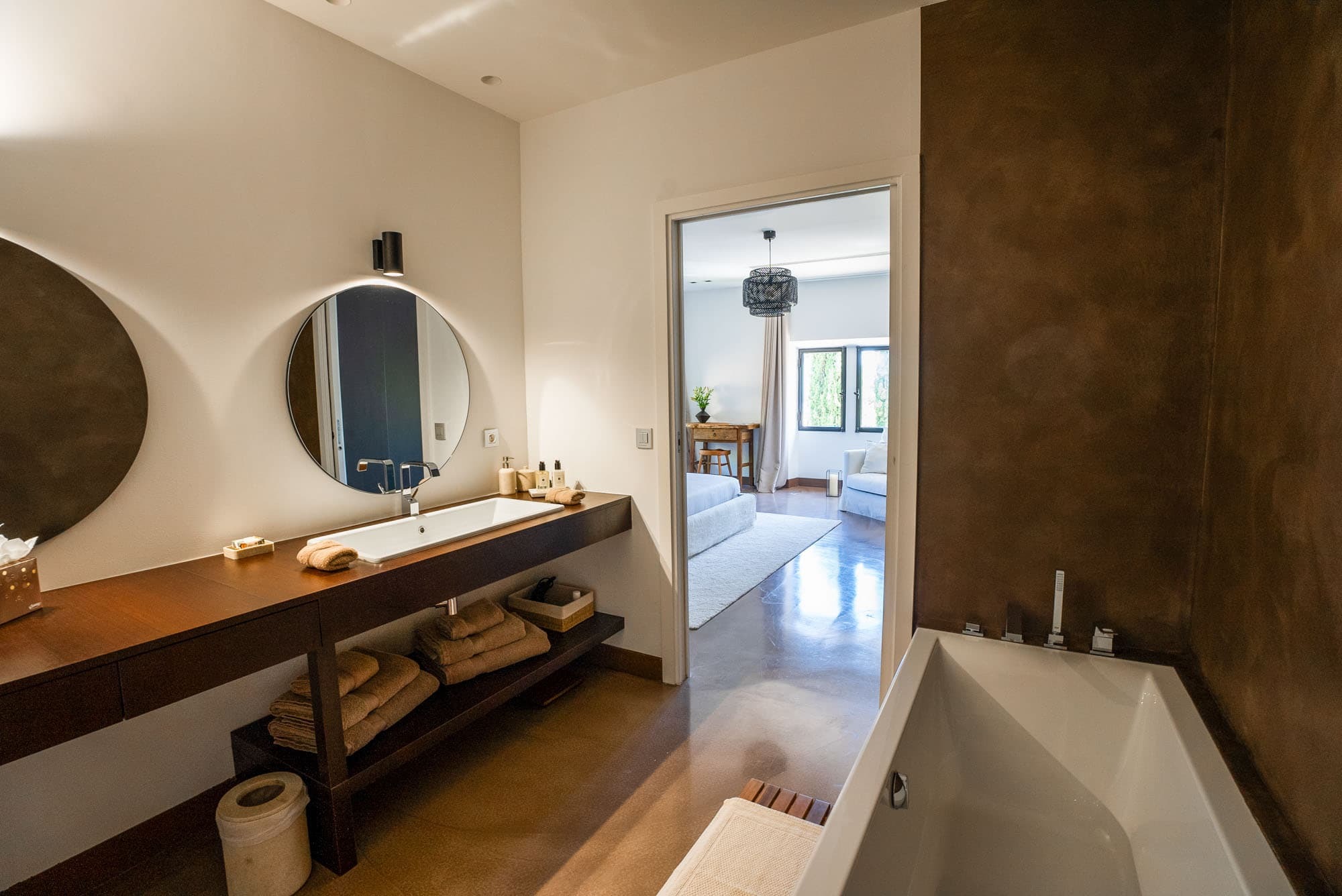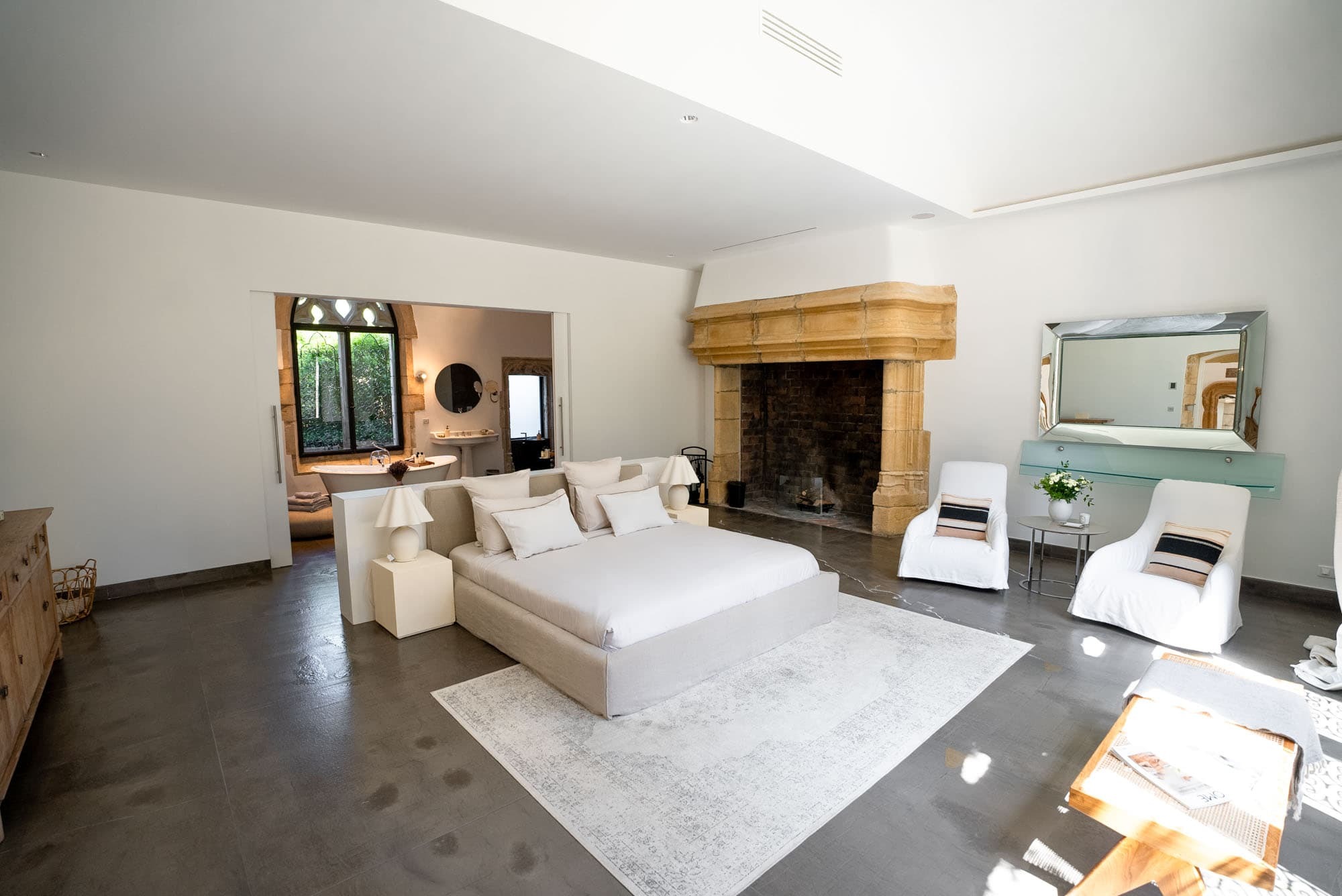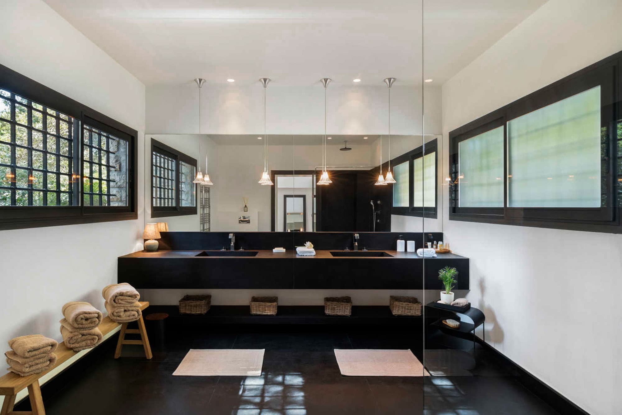 Each of the six suites includes a private en suite bathroom, finished in natural stone with walk-in showers and high-quality fittings. Clean architectural lines and neutral tones create a spa-like atmosphere, reflecting the villa’s overall minimalist aesthetic.