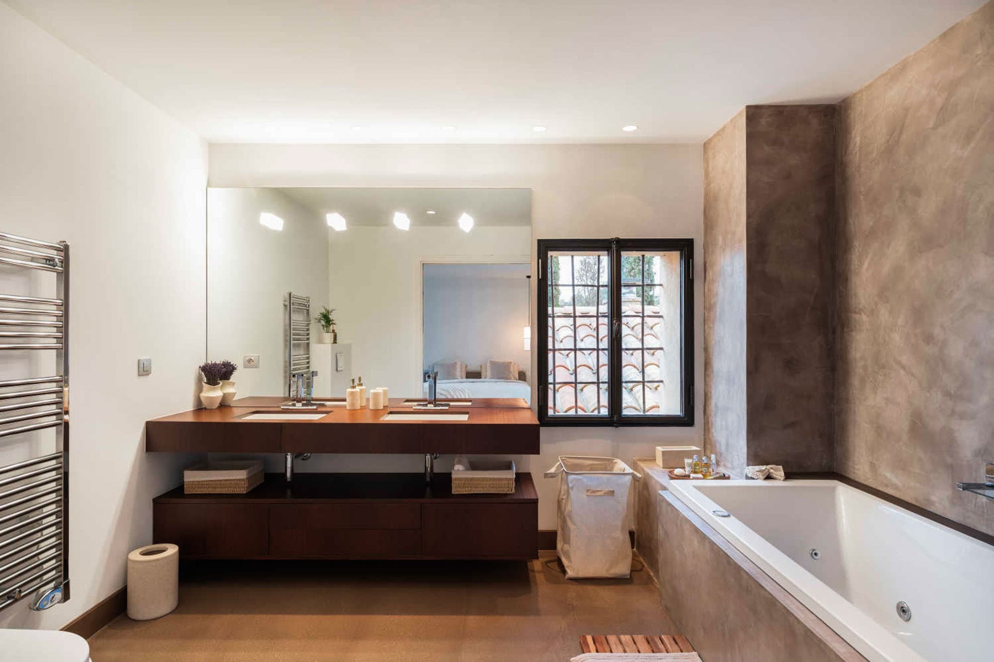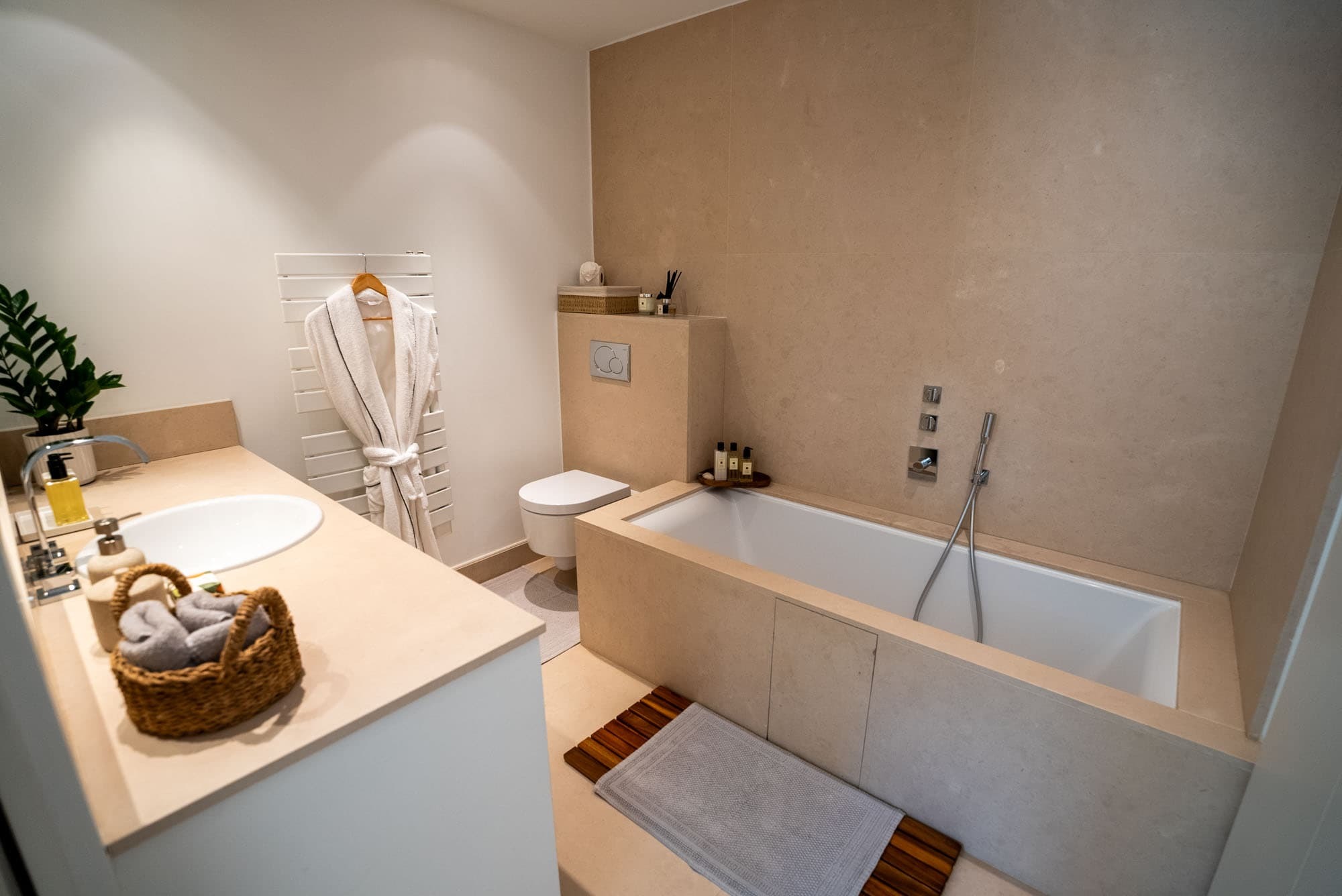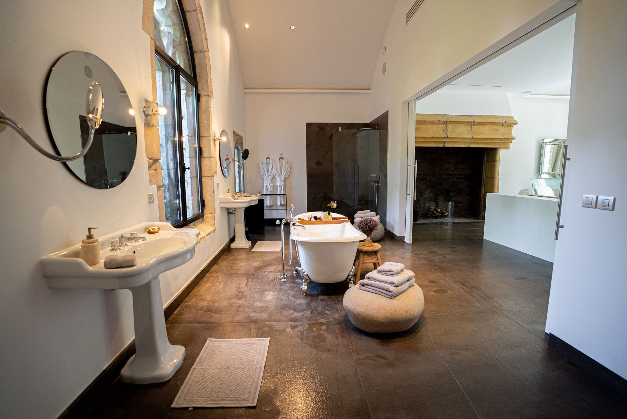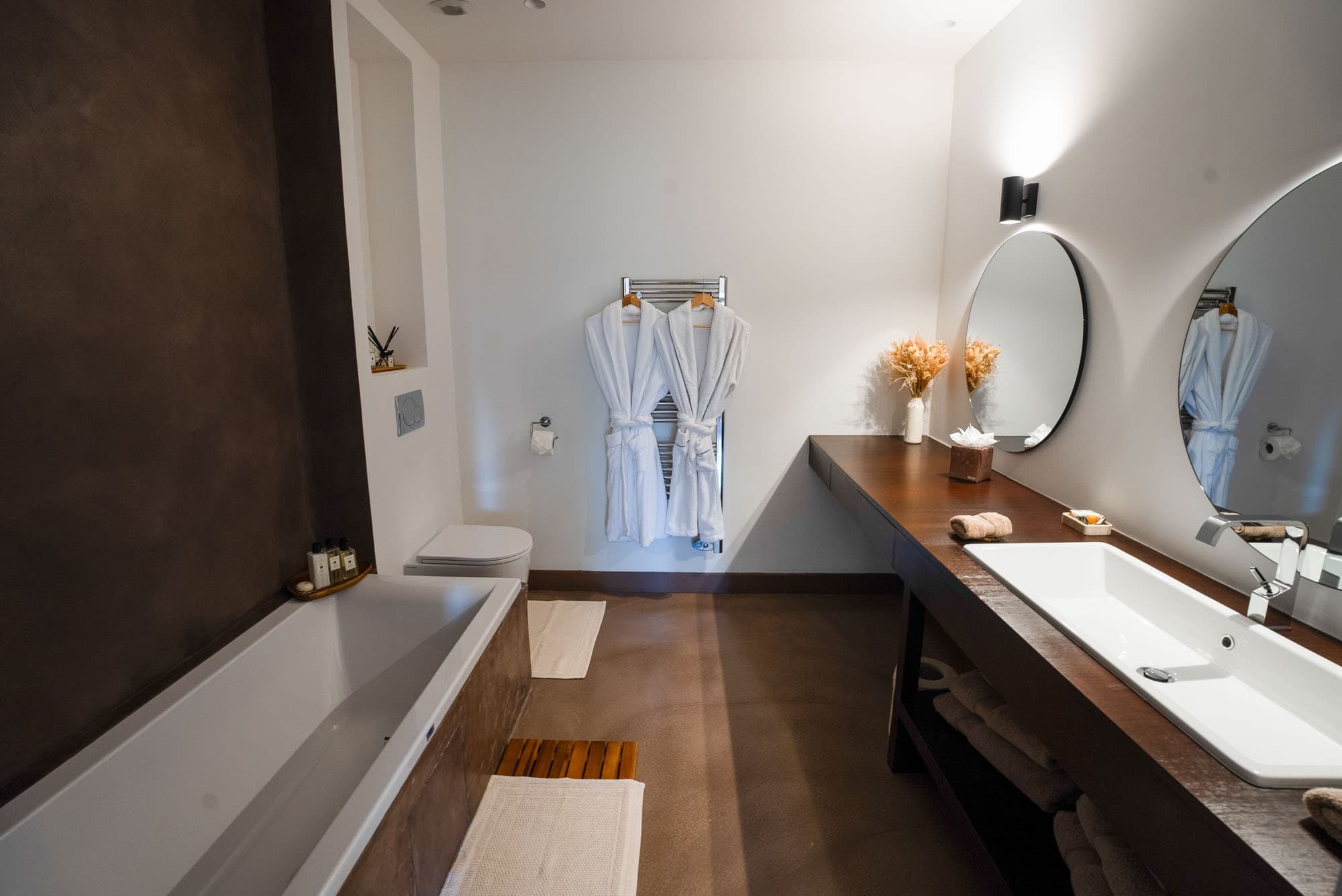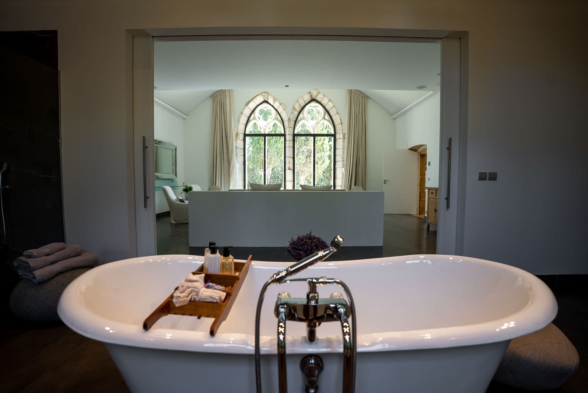 Each of the six suites includes a private en suite bathroom, finished in natural stone with walk-in showers and high-quality fittings. Clean architectural lines and neutral tones create a spa-like atmosphere, reflecting the villa’s overall minimalist aesthetic.