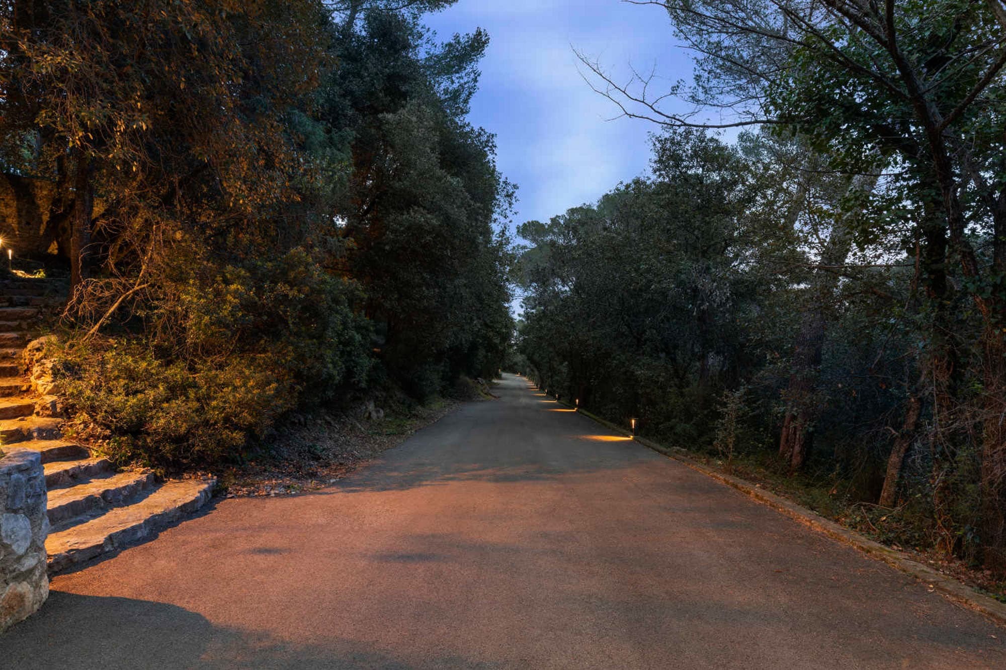 The estate prioritises outdoor lifestyle and active leisure. A private tennis court, multisports ground, basketball area, and five-a-side football space provide ample recreation. A 2 km woodland trail winds through the 45,000 sqm domain, encouraging nature walks and morning runs. The glass sauna offers a striking wellness focal point, blending modern design with panoramic surroundings.