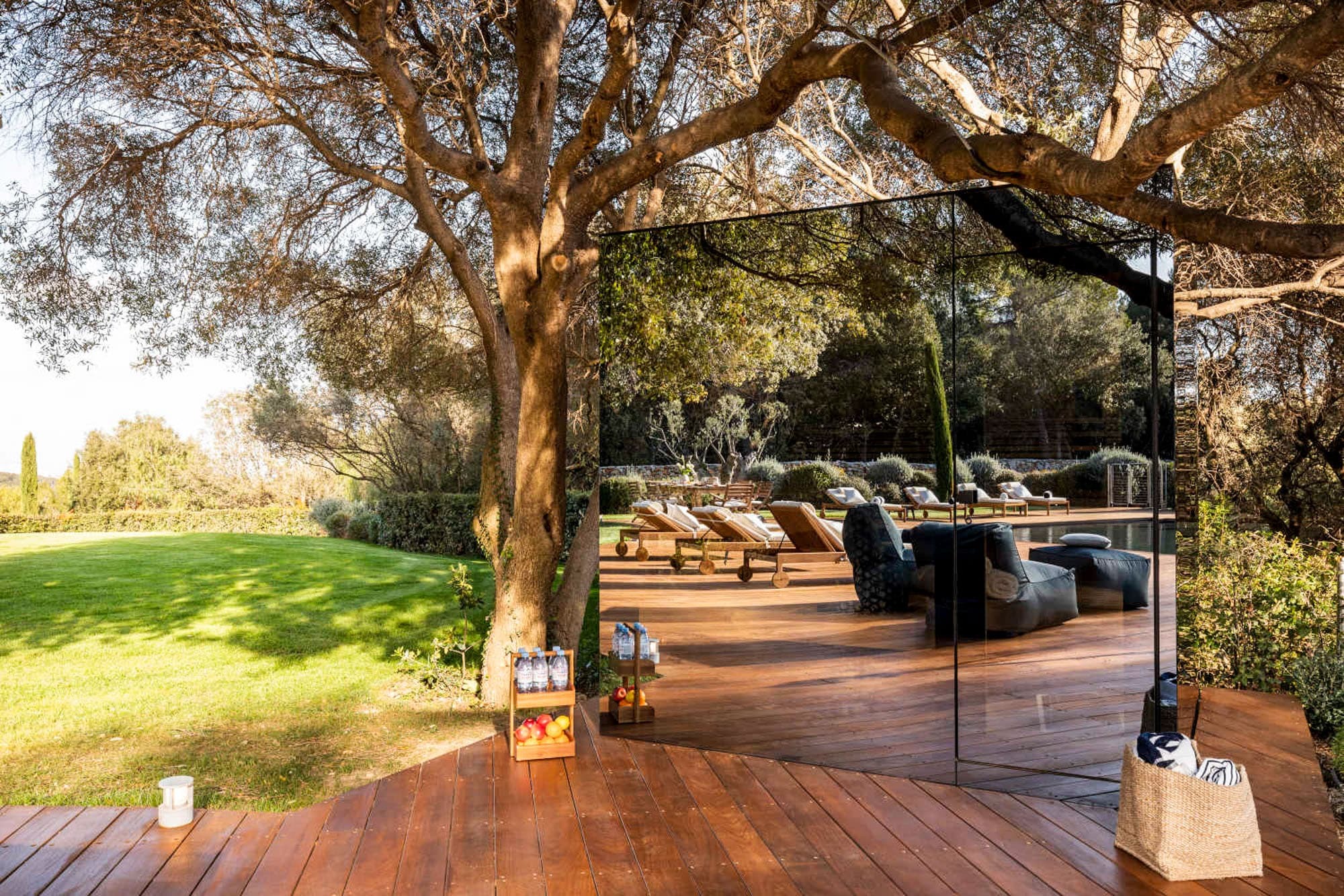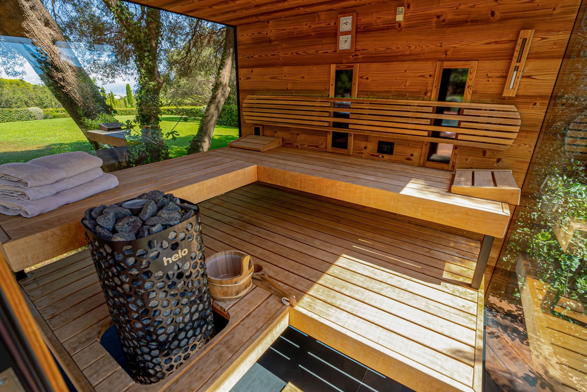Expansive sundecks frame the outdoor swimming pool, offering panoramic views across the surrounding countryside toward the coast. Provincial vegetation, mature trees, and landscaped terraces create natural privacy throughout the 45,000 sqm grounds. The glass sauna, sports facilities, and woodland trails extend the experience beyond traditional villa living, transforming the estate into a private Riviera sanctuary.