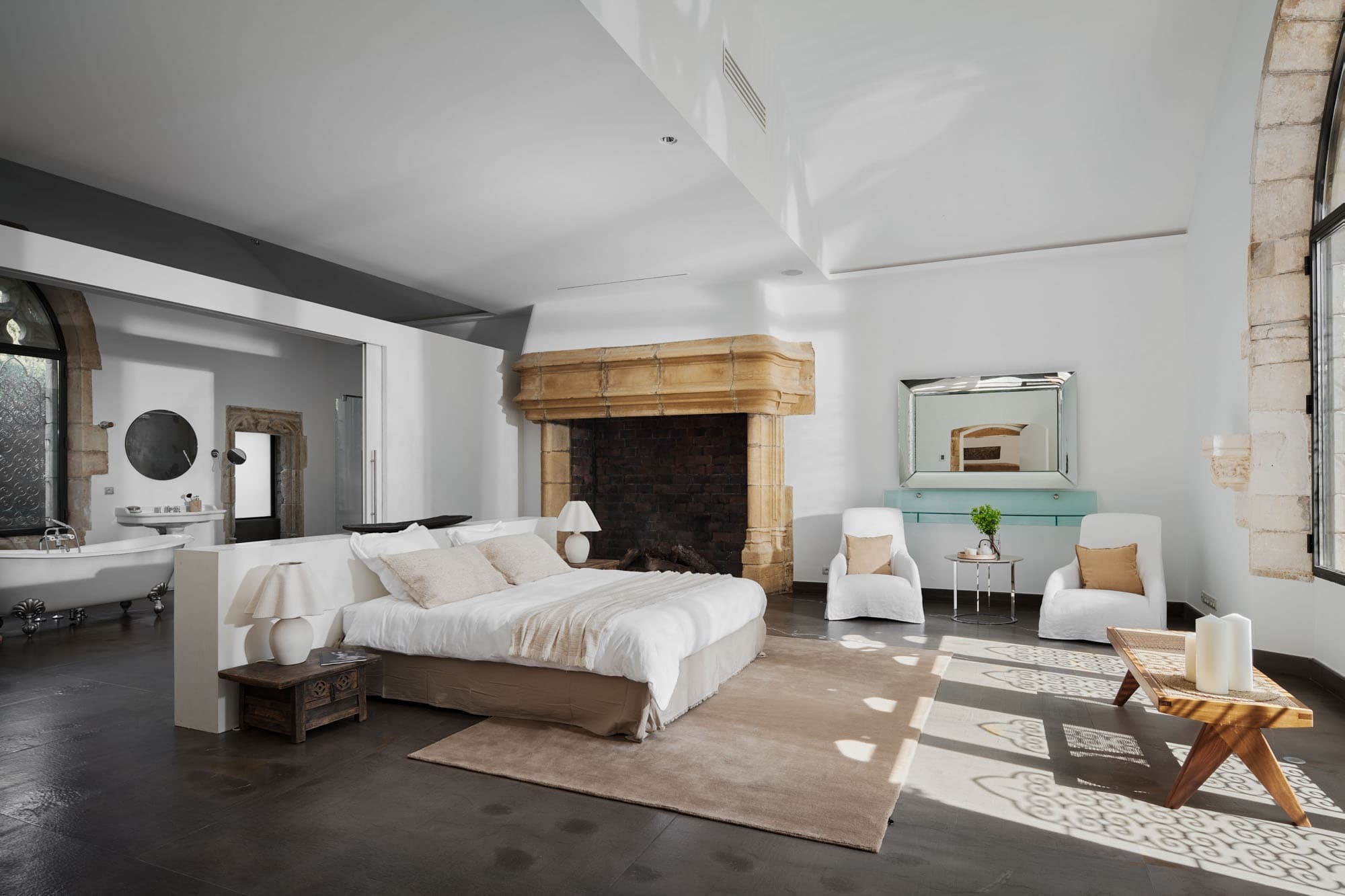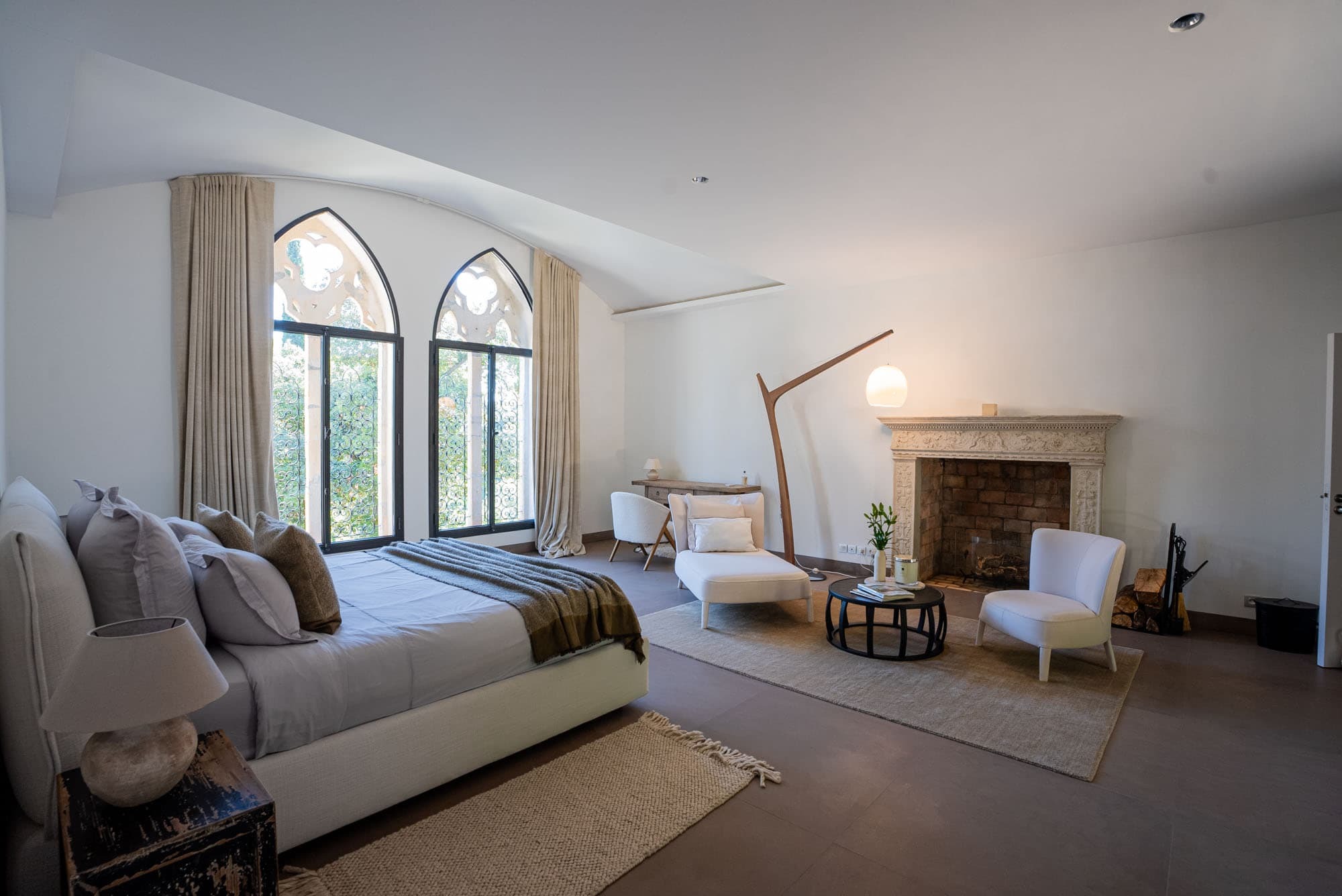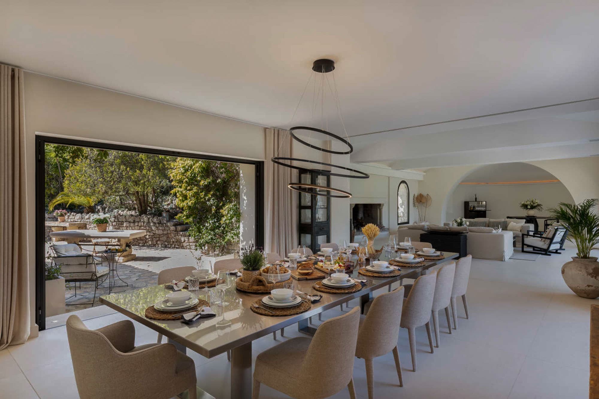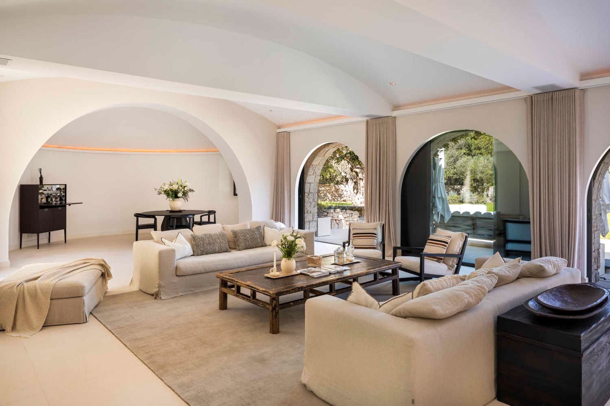 The villa unfolds across approximately 600 sqm of thoughtfully restored interiors, where ancient stone walls meet refined contemporary minimalism. Vaulted ceilings, expansive openings, and soft natural textures create a calm, light-filled atmosphere throughout the main reception areas. A generous central salon anchors the home, designed for both intimate evenings and relaxed gatherings, with seamless flow onto terraces overlooking the surrounding Riviera landscape.