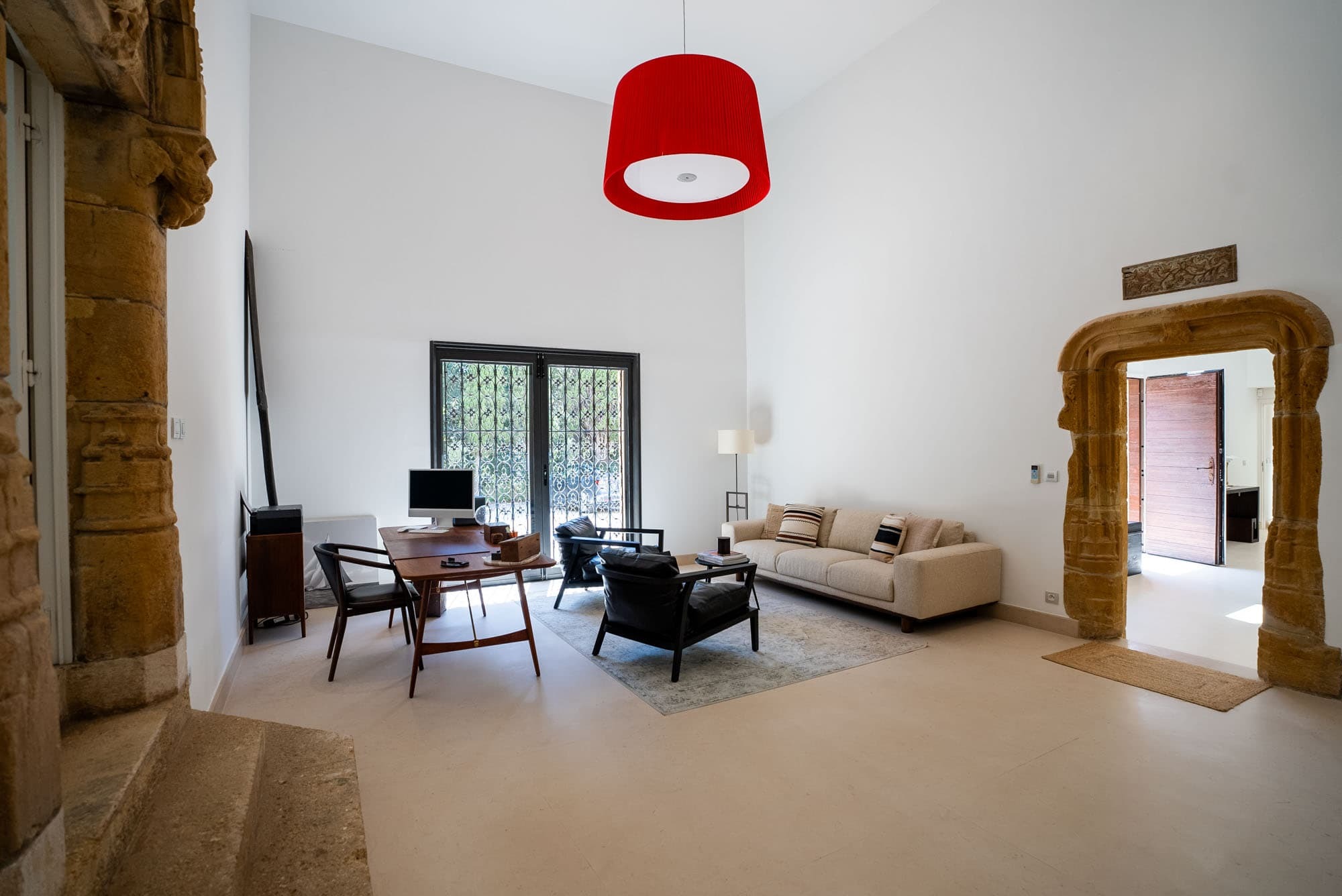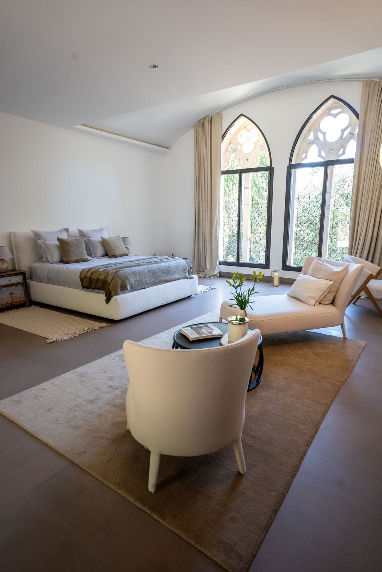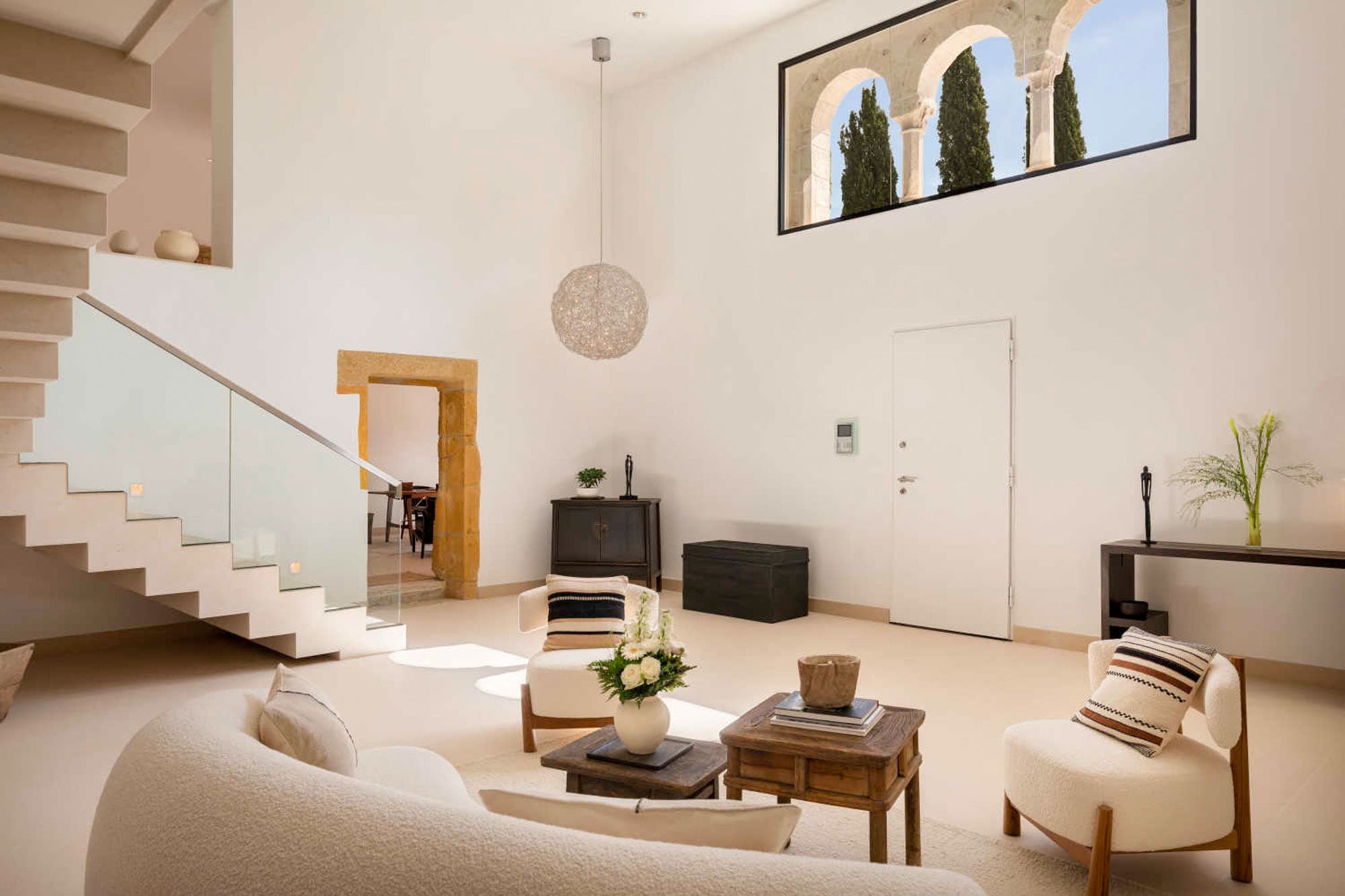 The villa unfolds across approximately 600 sqm of thoughtfully restored interiors, where ancient stone walls meet refined contemporary minimalism. Vaulted ceilings, expansive openings, and soft natural textures create a calm, light-filled atmosphere throughout the main reception areas. A generous central salon anchors the home, designed for both intimate evenings and relaxed gatherings, with seamless flow onto terraces overlooking the surrounding Riviera landscape.