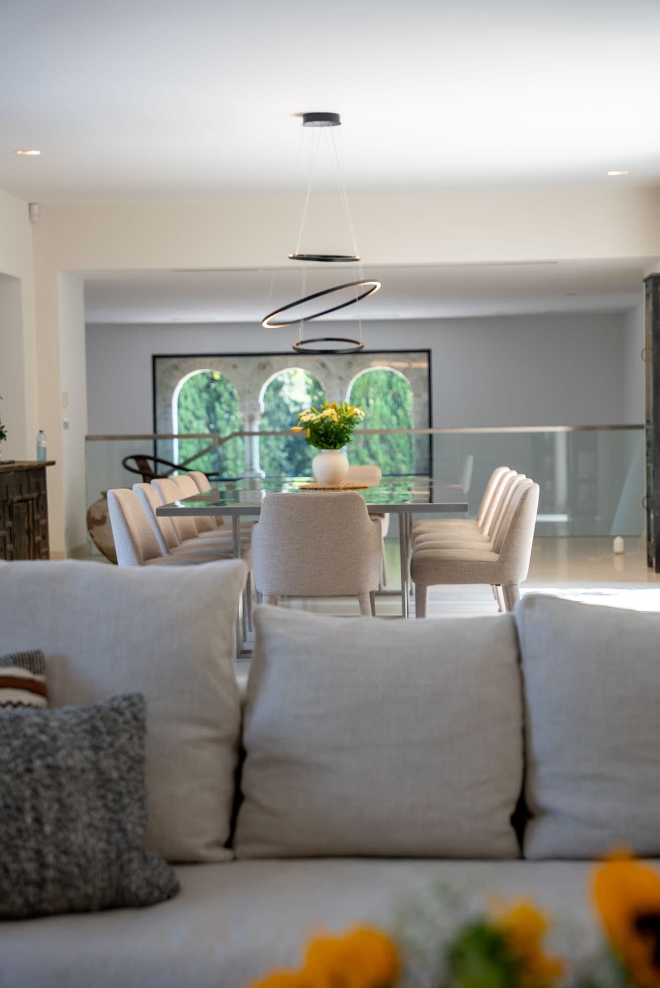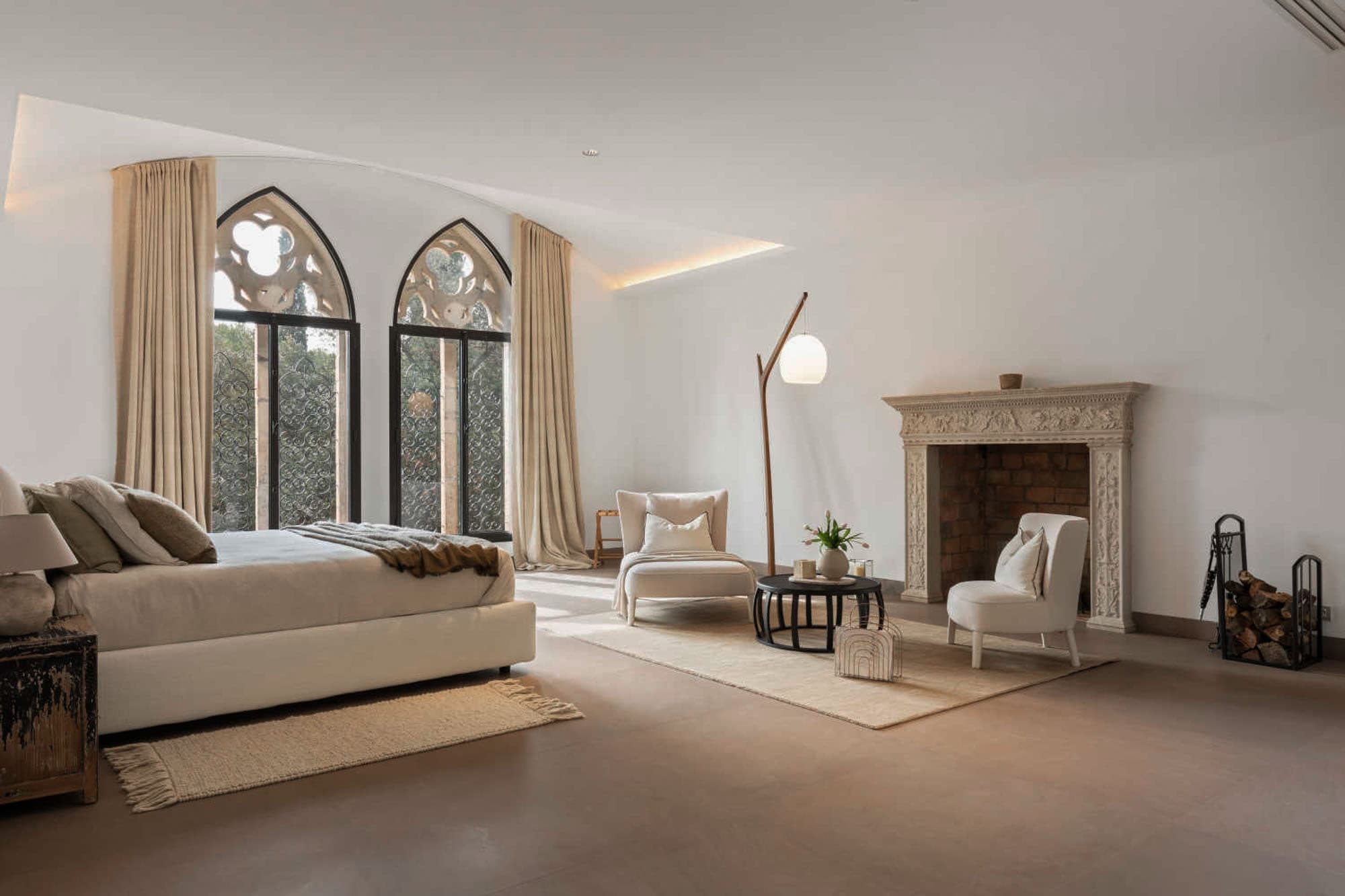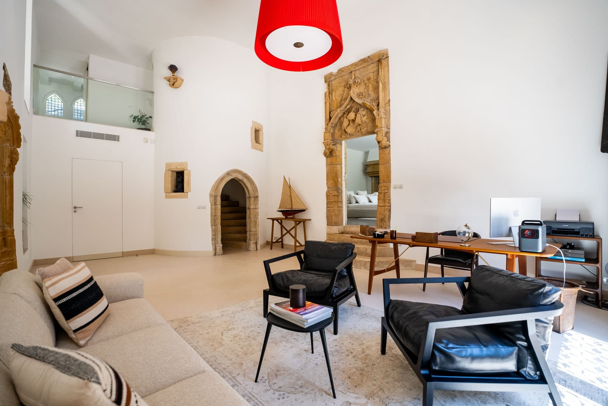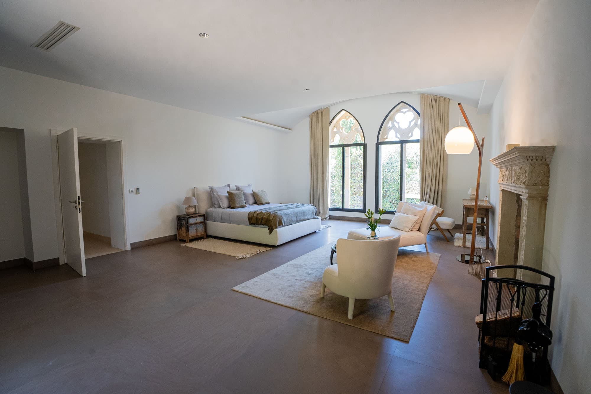 The villa unfolds across approximately 600 sqm of thoughtfully restored interiors, where ancient stone walls meet refined contemporary minimalism. Vaulted ceilings, expansive openings, and soft natural textures create a calm, light-filled atmosphere throughout the main reception areas. A generous central salon anchors the home, designed for both intimate evenings and relaxed gatherings, with seamless flow onto terraces overlooking the surrounding Riviera landscape.
