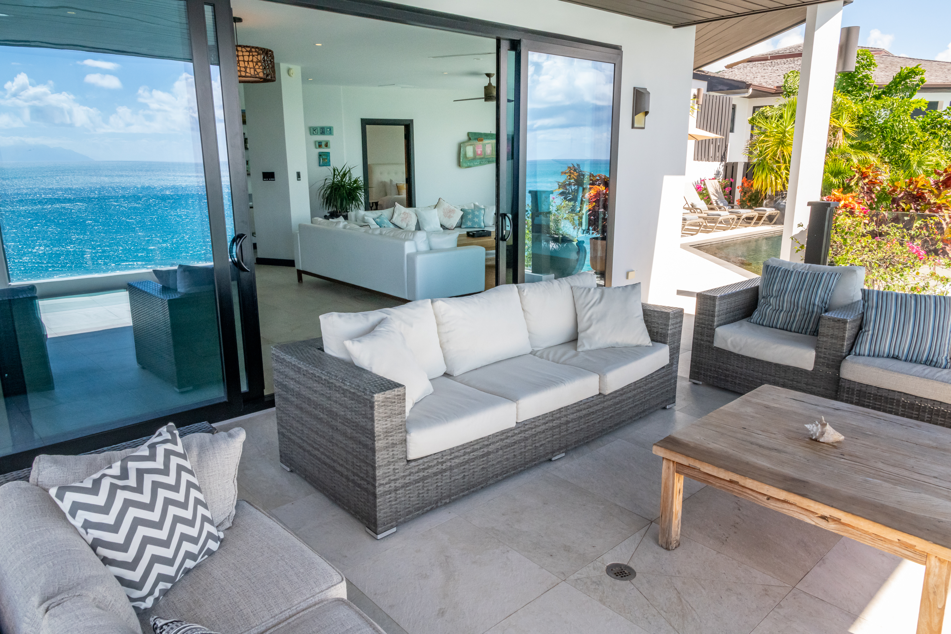 The villa accommodates up to eight guests across four ensuite bedrooms. Three bedrooms are located on the first floor, including the master suite, and all open onto a wide wraparound balcony with a covered and furnished lounge overlooking the ocean. A fourth ensuite bedroom is positioned just off the main living area, offering convenience and privacy with views toward the pool and sea. A fitted laundry room with washer and dryer is available for guest use, with housekeeping provided every other day