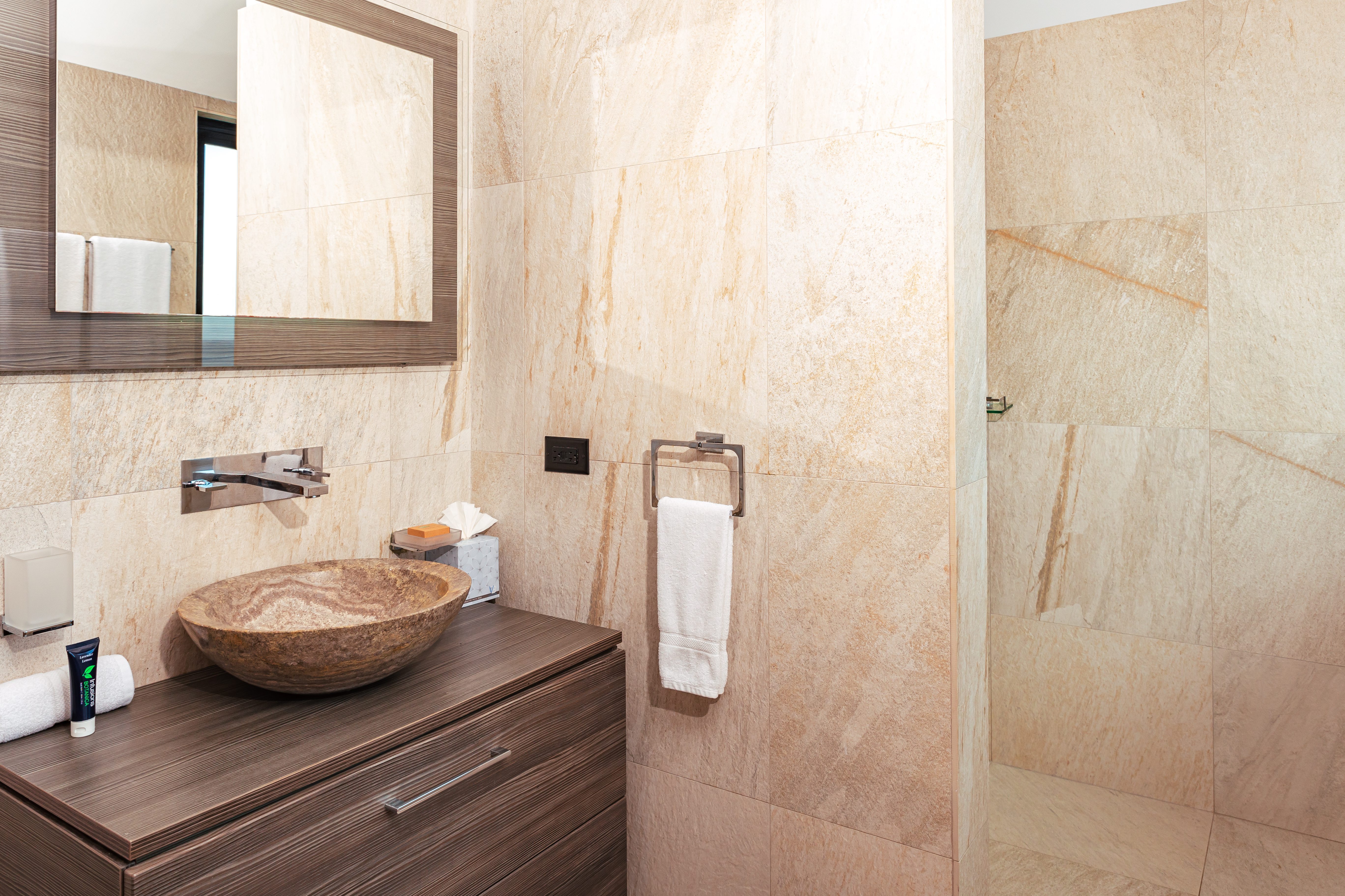 Each bedroom features its own private ensuite bathroom, finished in a clean, contemporary style. A separate guest WC and an outdoor shower add convenience, particularly after time spent at the beach or by the pool.