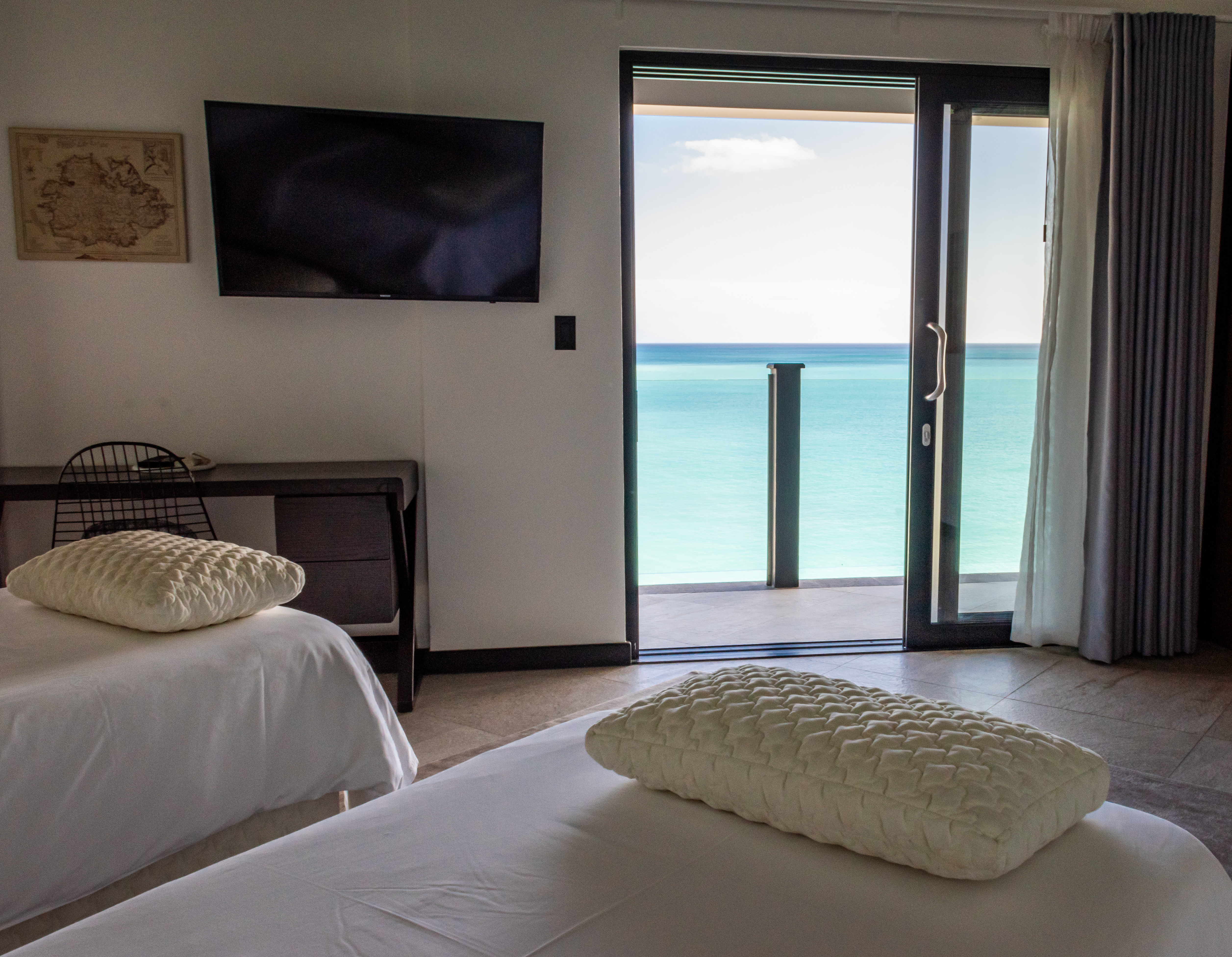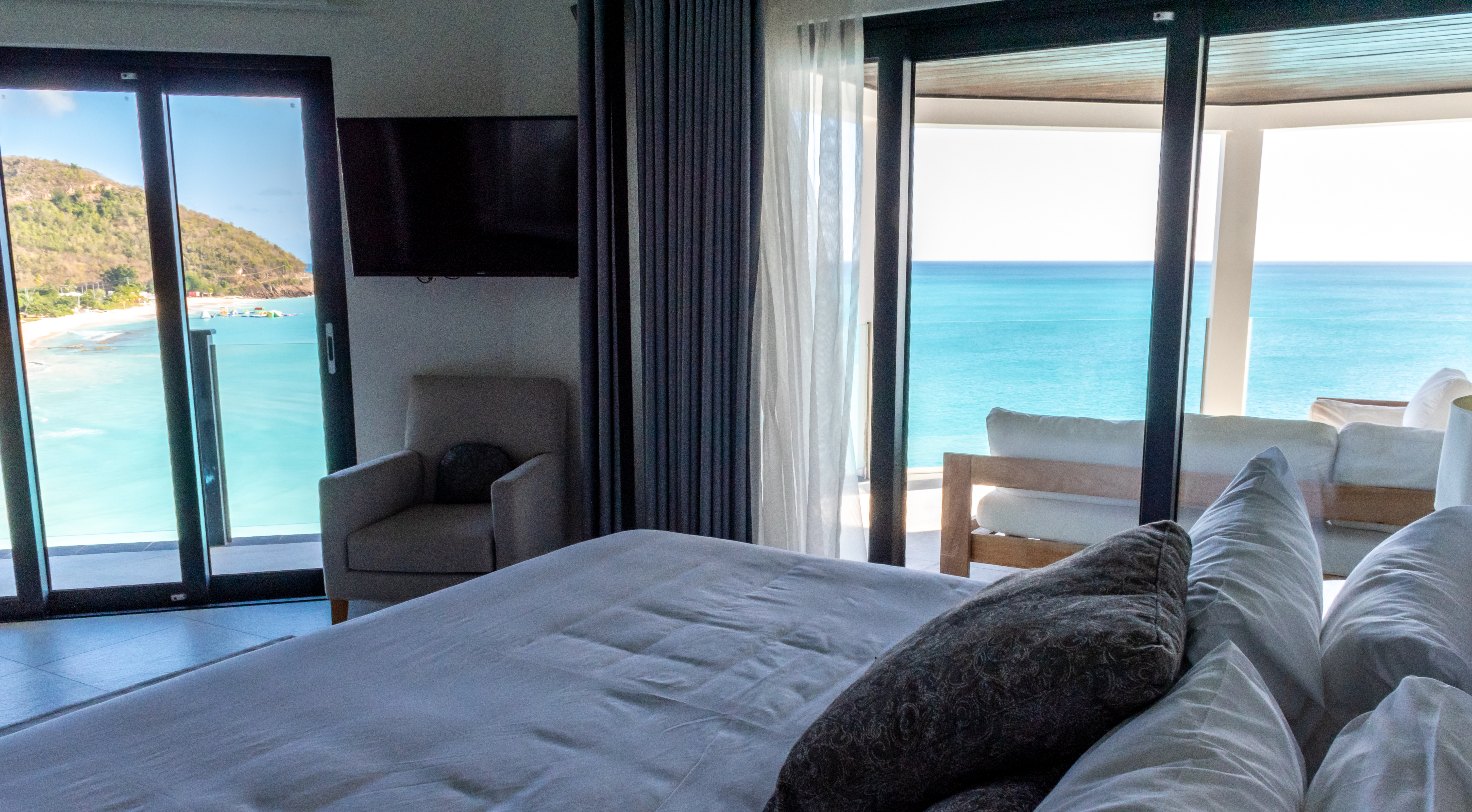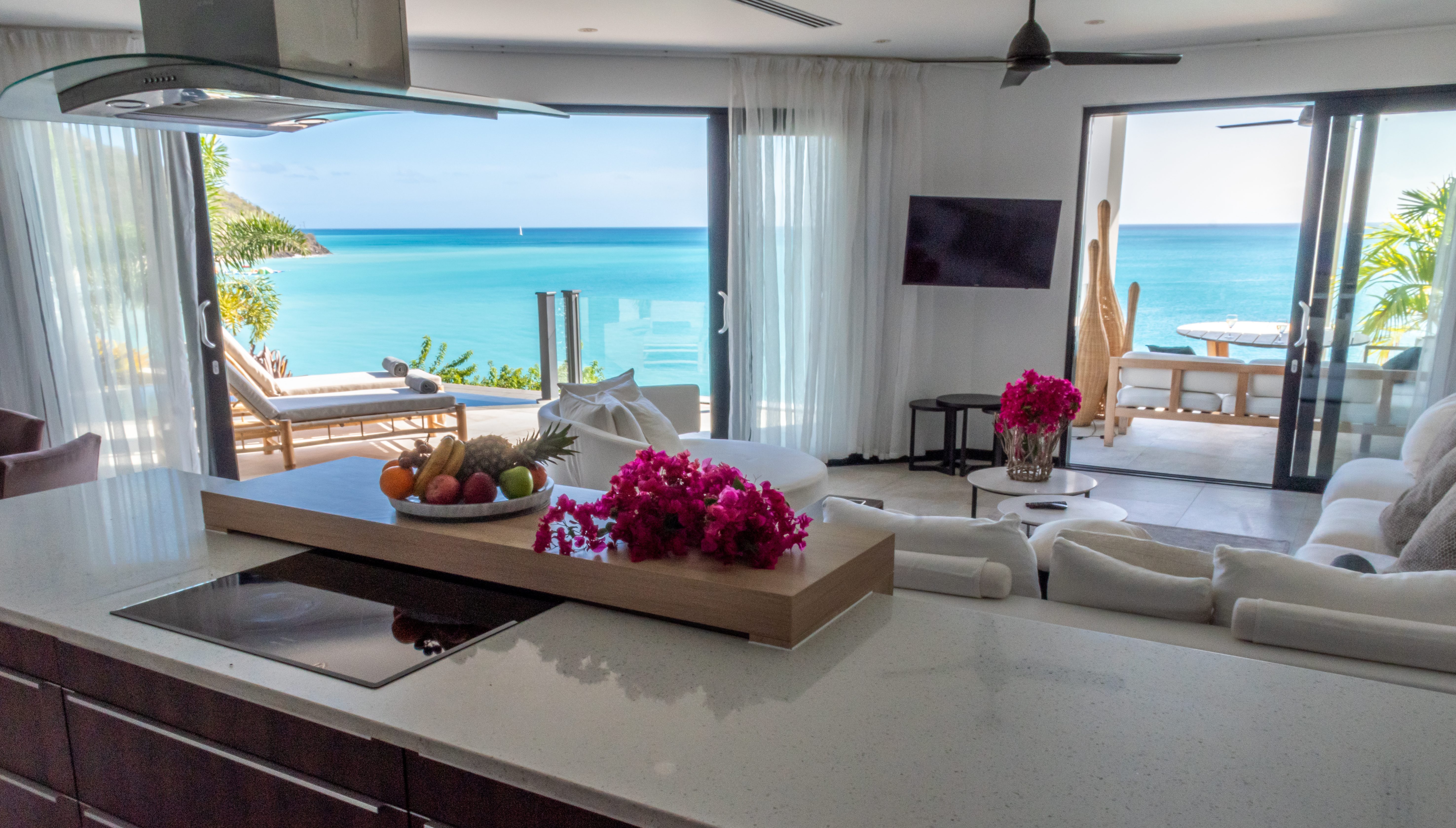 Ocean Azul is arranged around a bright, open plan living area designed to maximise light and uninterrupted sea views. Fully opening glass walls allow the lounge, kitchen, and dining space to flow directly onto the sun deck and infinity edge pool, creating a seamless indoor outdoor lifestyle. The atmosphere is calm and contemporary, with the Caribbean Sea forming a constant, tranquil backdrop.