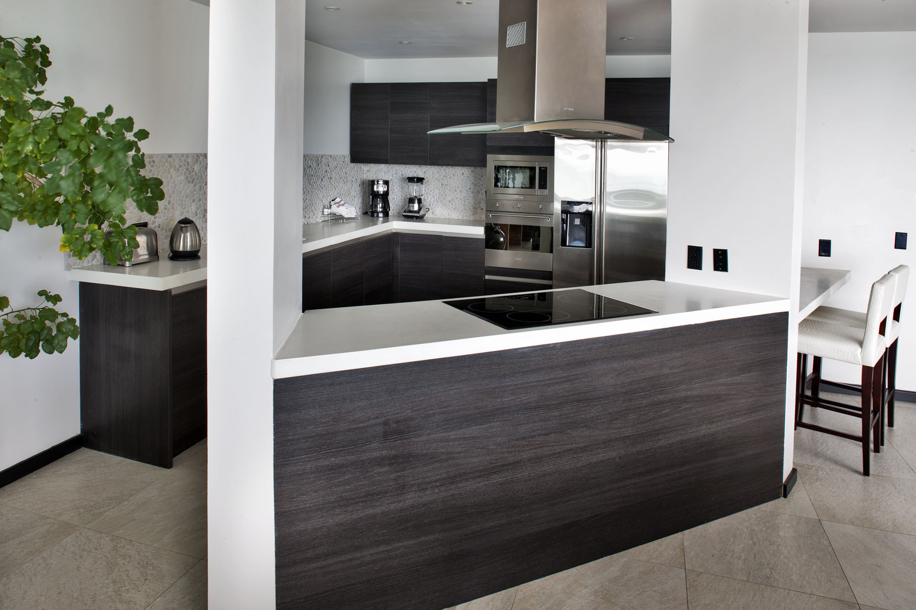 The villa sleeps up to four guests across two ensuite bedrooms, both located on the upper level for privacy and views. Each bedroom opens onto its own private balcony, offering panoramic ocean views and quiet moments above the shoreline. The master suite features both a bathtub and a walk in shower. A washer and dryer are available for guest use, with housekeeping provided every other day.