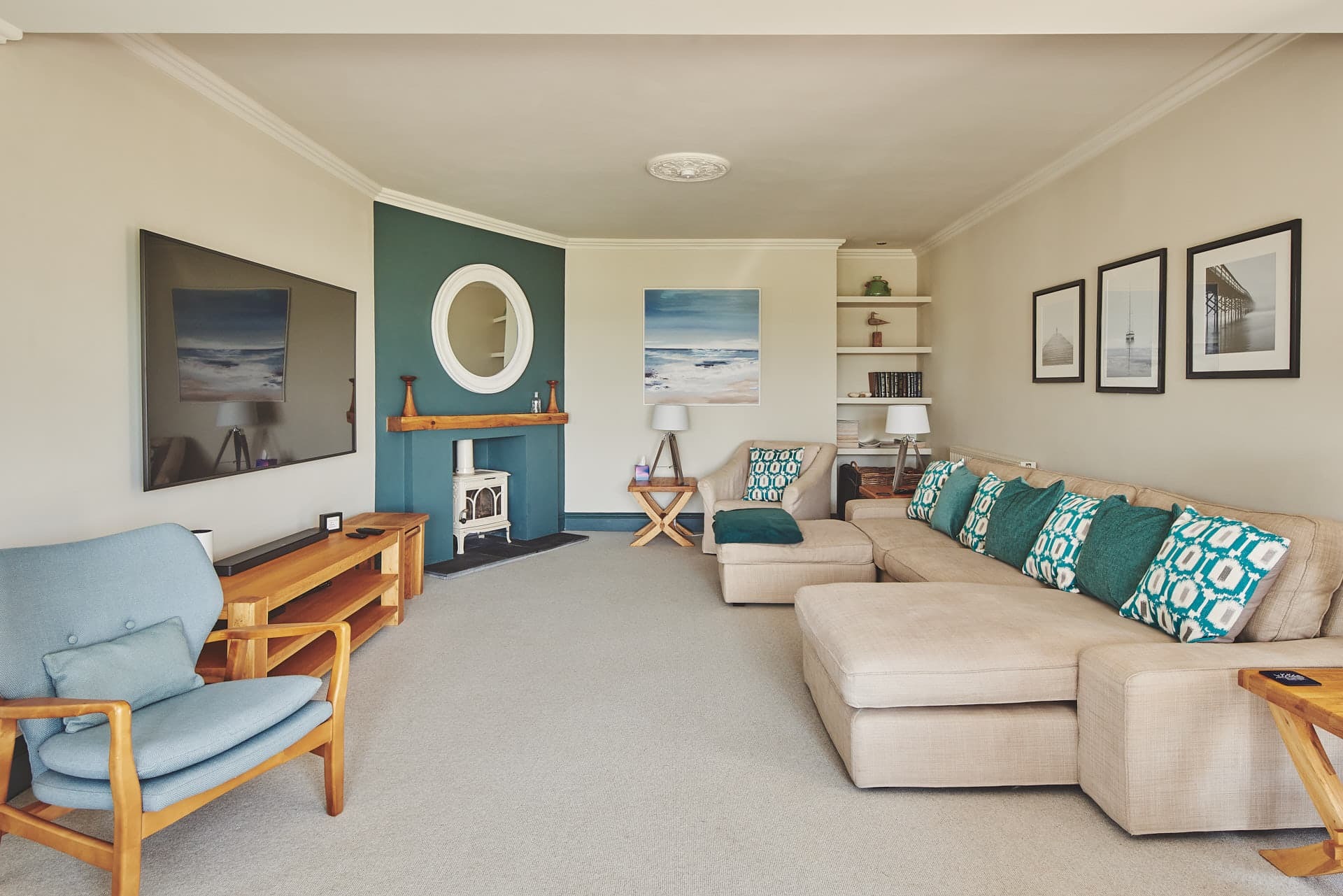 At the heart of the house lies a light filled open plan living space where bi fold doors open onto a full width balcony overlooking the sea. Mornings begin with coffee against a backdrop of waves, while evenings unfold beside the log burner or in the private hot tub as the sun sinks below the horizon. An 85 inch Smart TV with full Sky package ensures cosy film nights, while generous seating and clean modern interiors create a relaxed, social atmosphere.