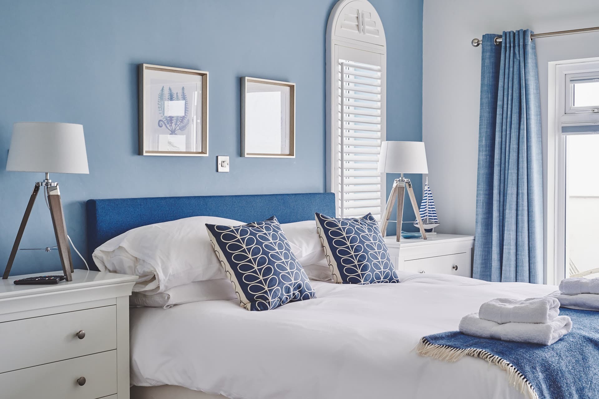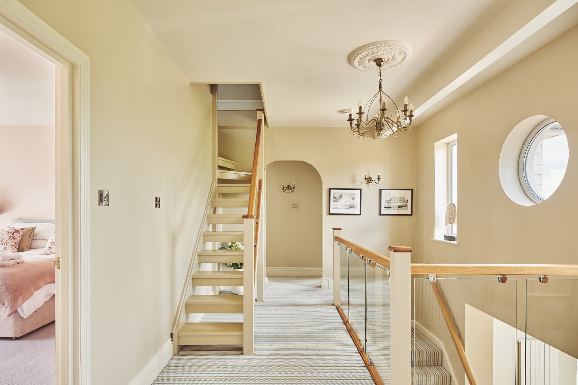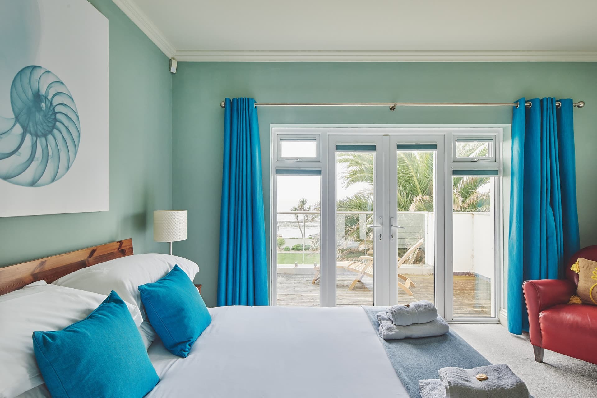 Five beautifully appointed bedrooms sleep up to ten guests in calm coastal comfort. Three open directly onto the sweeping sea-view balcony, allowing the rhythm of the tide to shape your mornings. The Crow’s Nest suite sits at the top of the house, elevated above it all, with panoramic views and its own private ensuite. Crisp linens, soft textures, and thoughtful details ensure deep rest after days spent by the water. A dedicated utility and boot room, with washer, dryer, and storage space, adds practicality for sandy toes and longer stays.