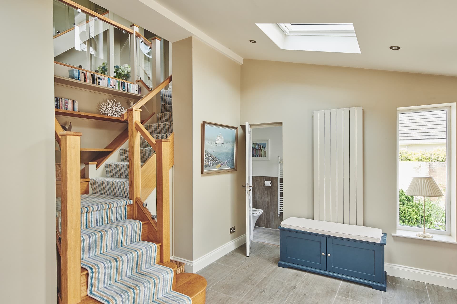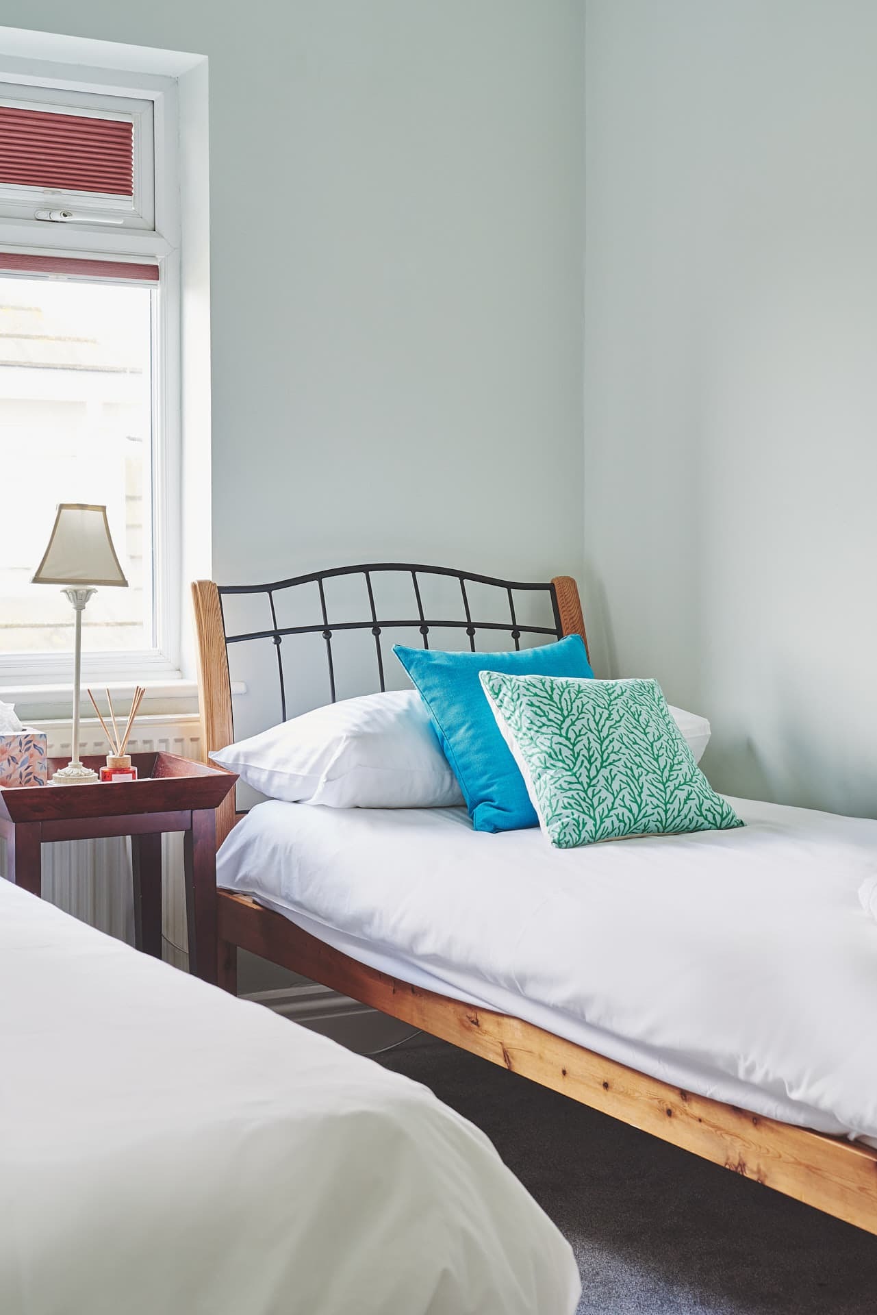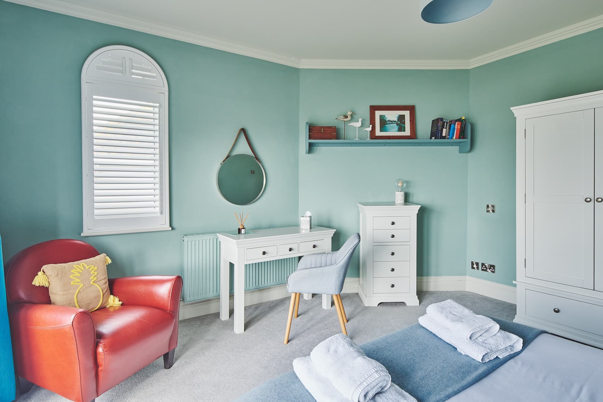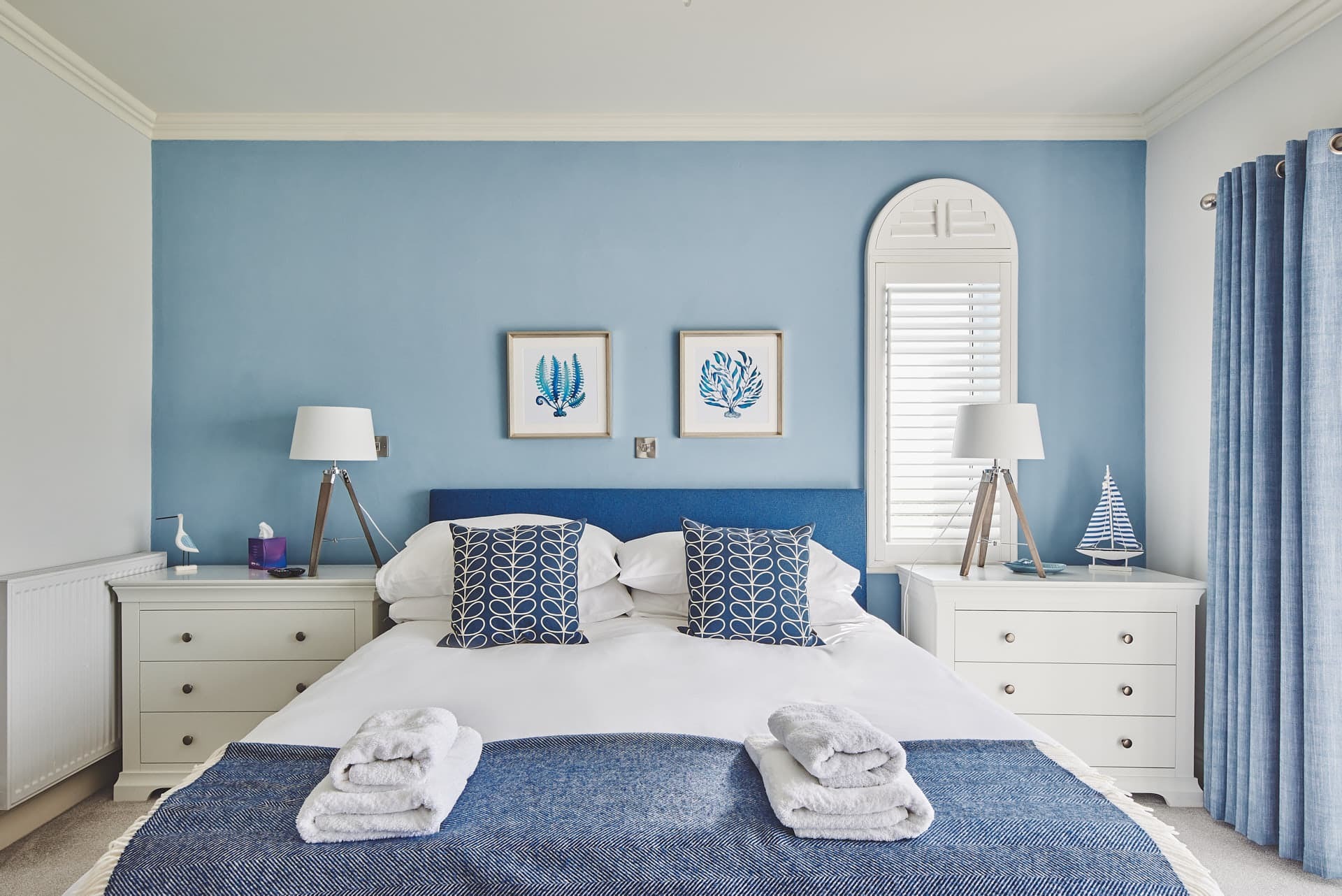 Five beautifully appointed bedrooms sleep up to ten guests in calm coastal comfort. Three open directly onto the sweeping sea-view balcony, allowing the rhythm of the tide to shape your mornings. The Crow’s Nest suite sits at the top of the house, elevated above it all, with panoramic views and its own private ensuite. Crisp linens, soft textures, and thoughtful details ensure deep rest after days spent by the water. A dedicated utility and boot room, with washer, dryer, and storage space, adds practicality for sandy toes and longer stays.