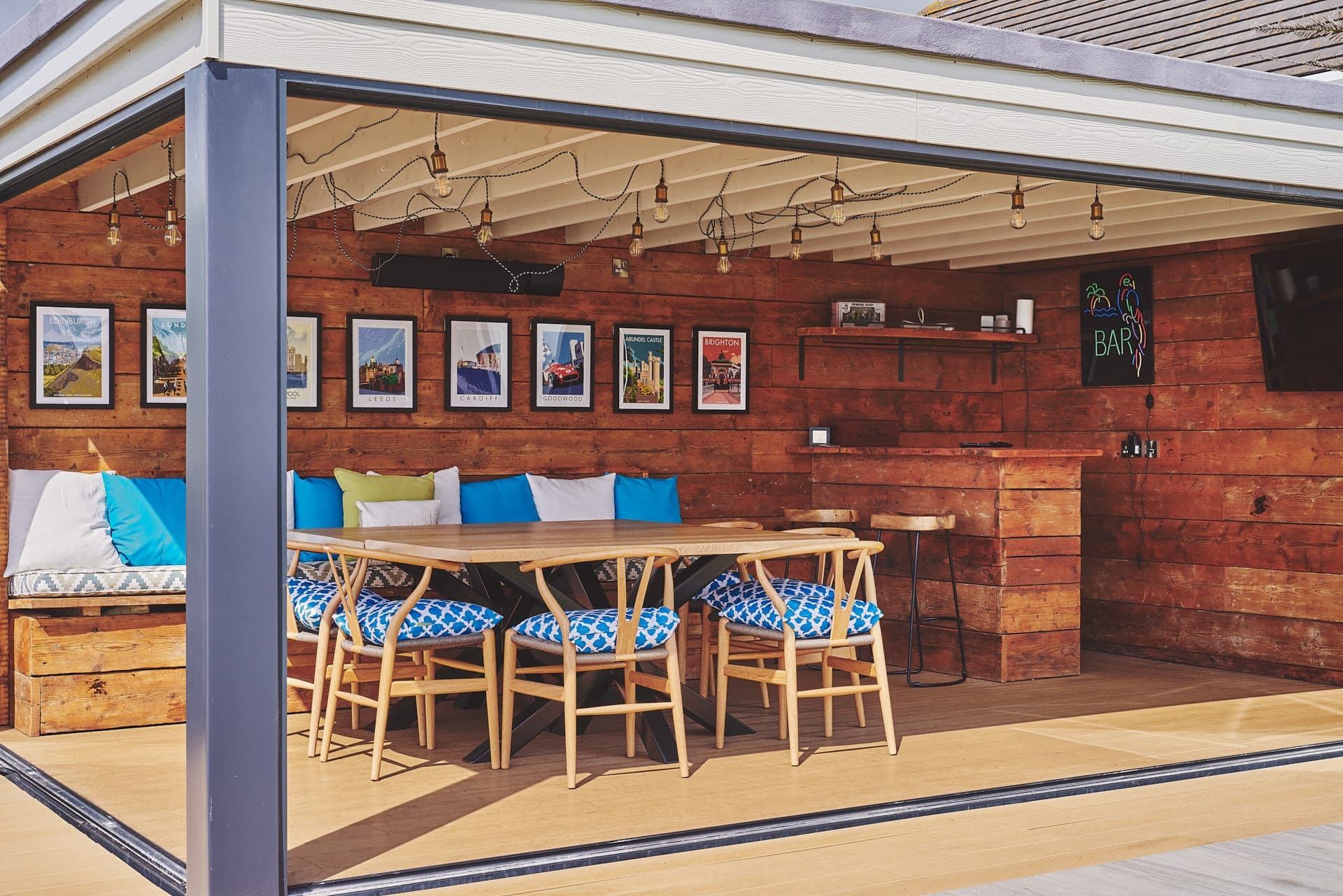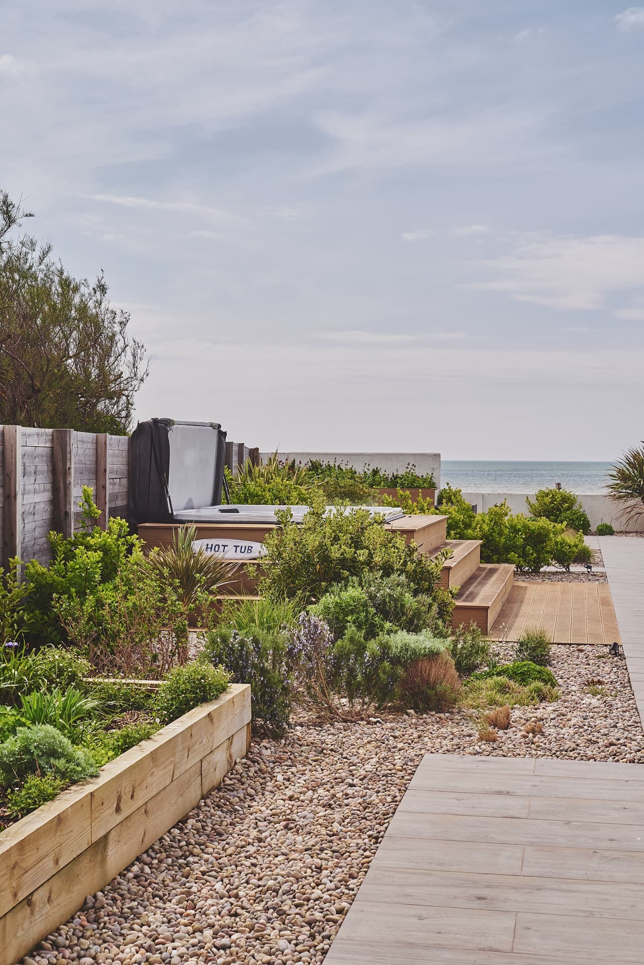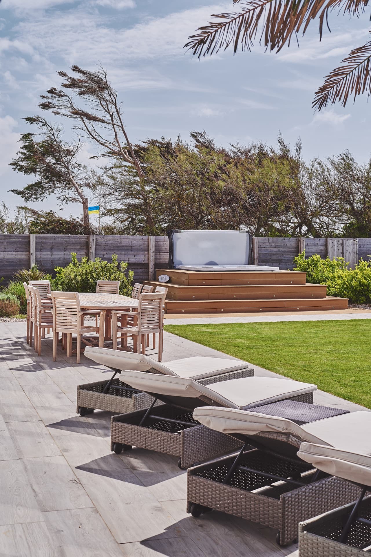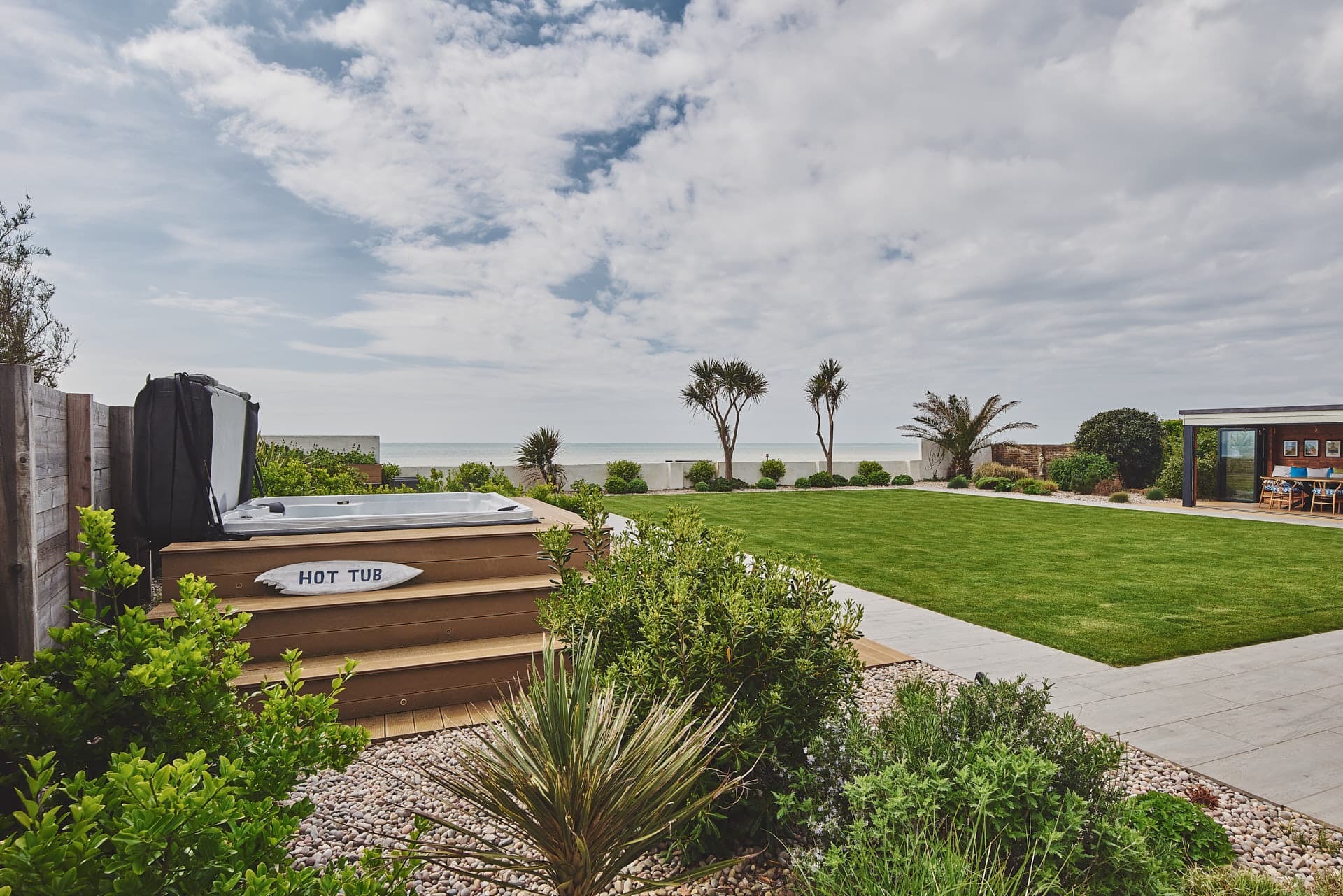 Life here unfolds outdoors. A private hot tub overlooks the water, the full-width balcony captures sweeping views, and the enclosed garden offers space for both children and dogs to roam safely. Sun loungers, a fire pit, alfresco dining, and the Skye Bar create layered spaces for gathering, while feature lighting and direct beach access make every hour by the sea feel special.