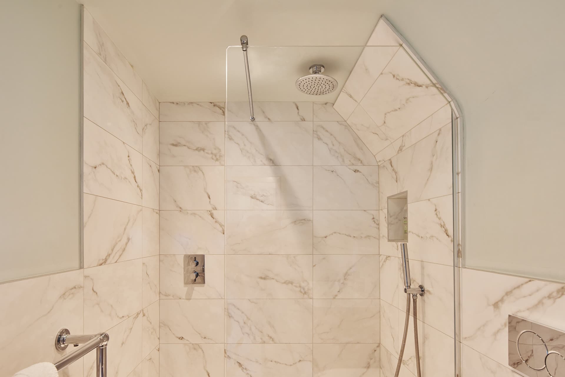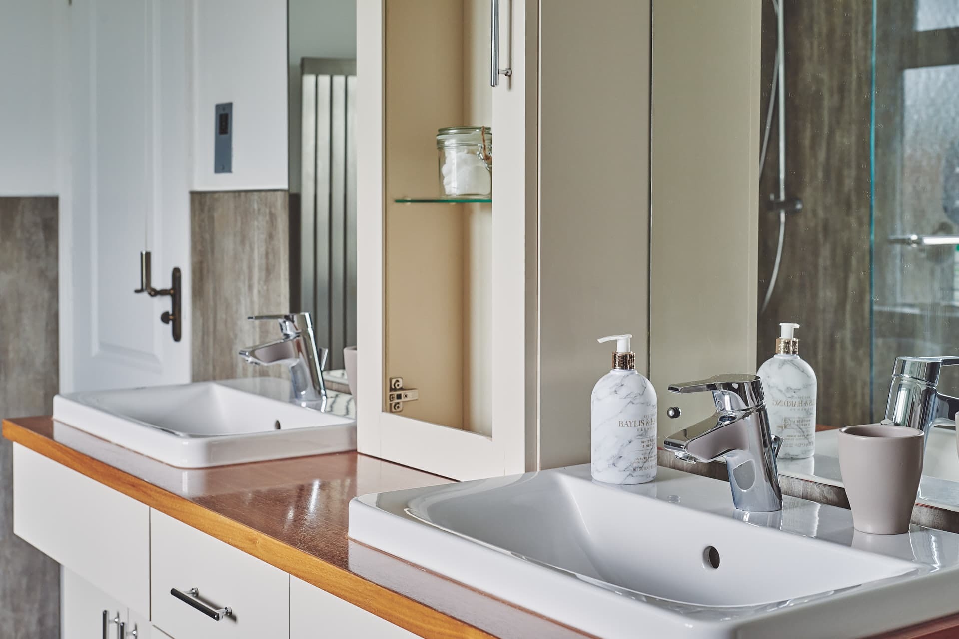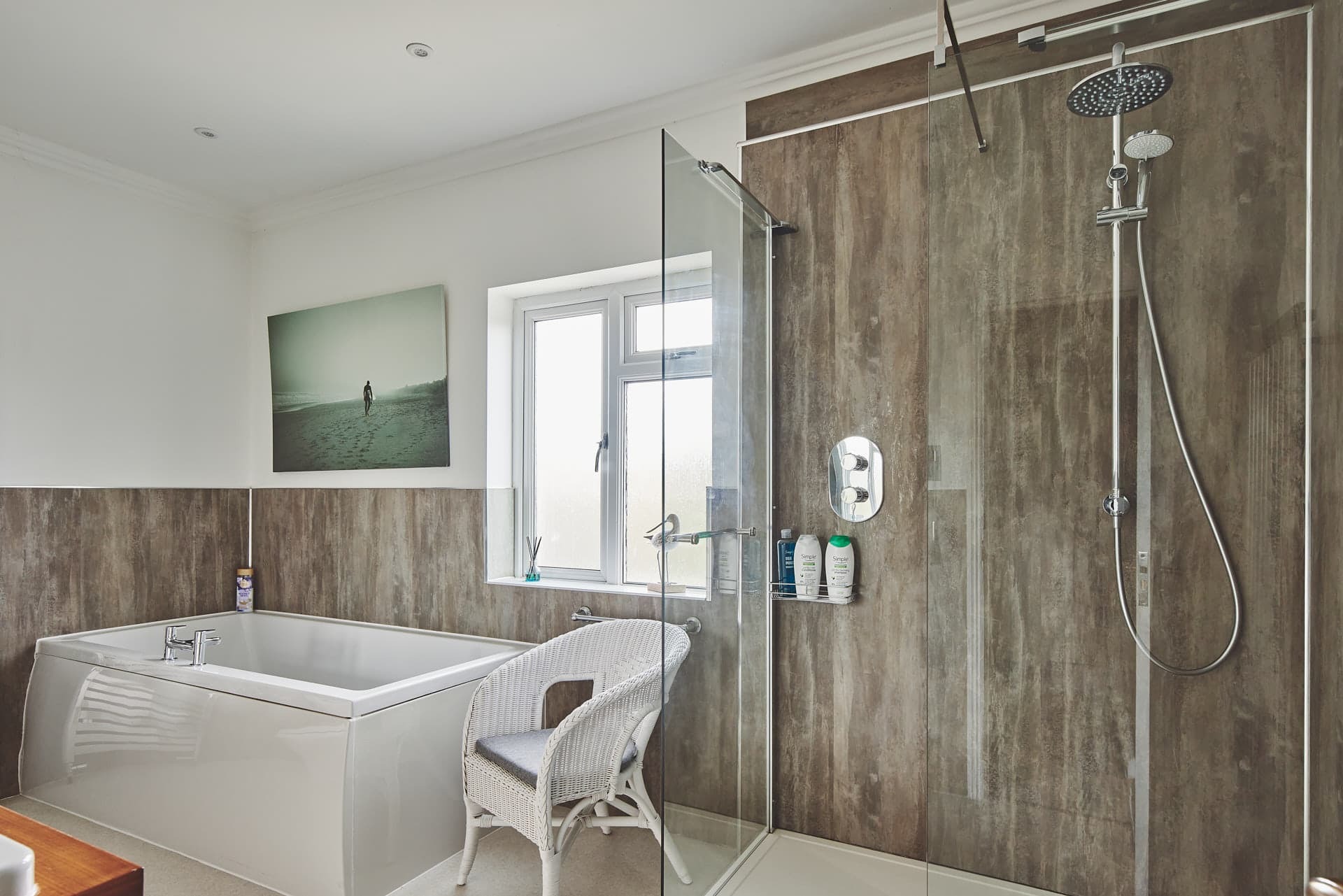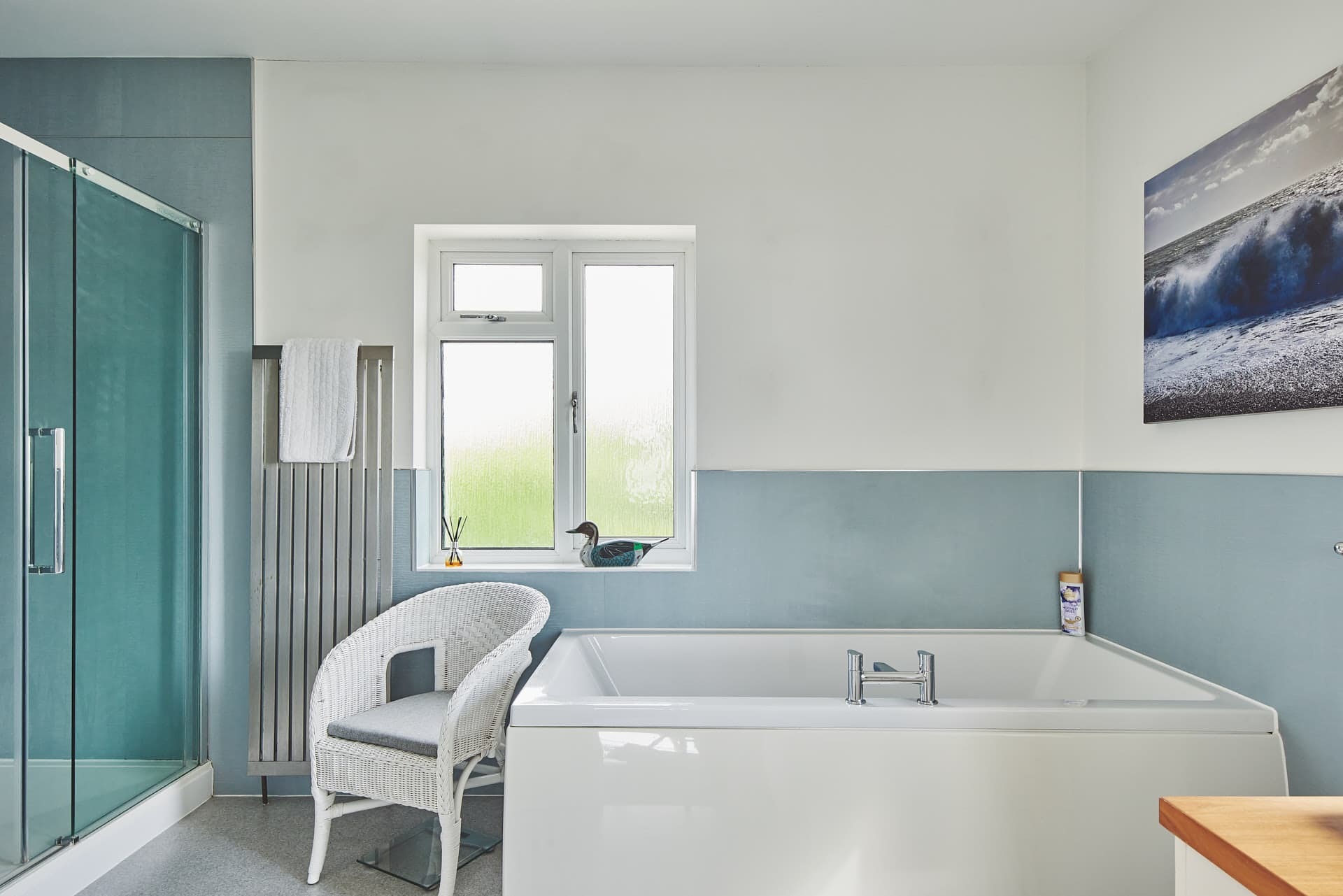 Four contemporary bathrooms offer a refined coastal finish, with a mix of walk-in showers and bath options. Ensuites provide privacy where desired, while fluffy towels, quality toiletries, and hairdryers add everyday ease. An outdoor hot shower waits at the garden’s edge, perfect for rinsing away salt and sand after a swim.