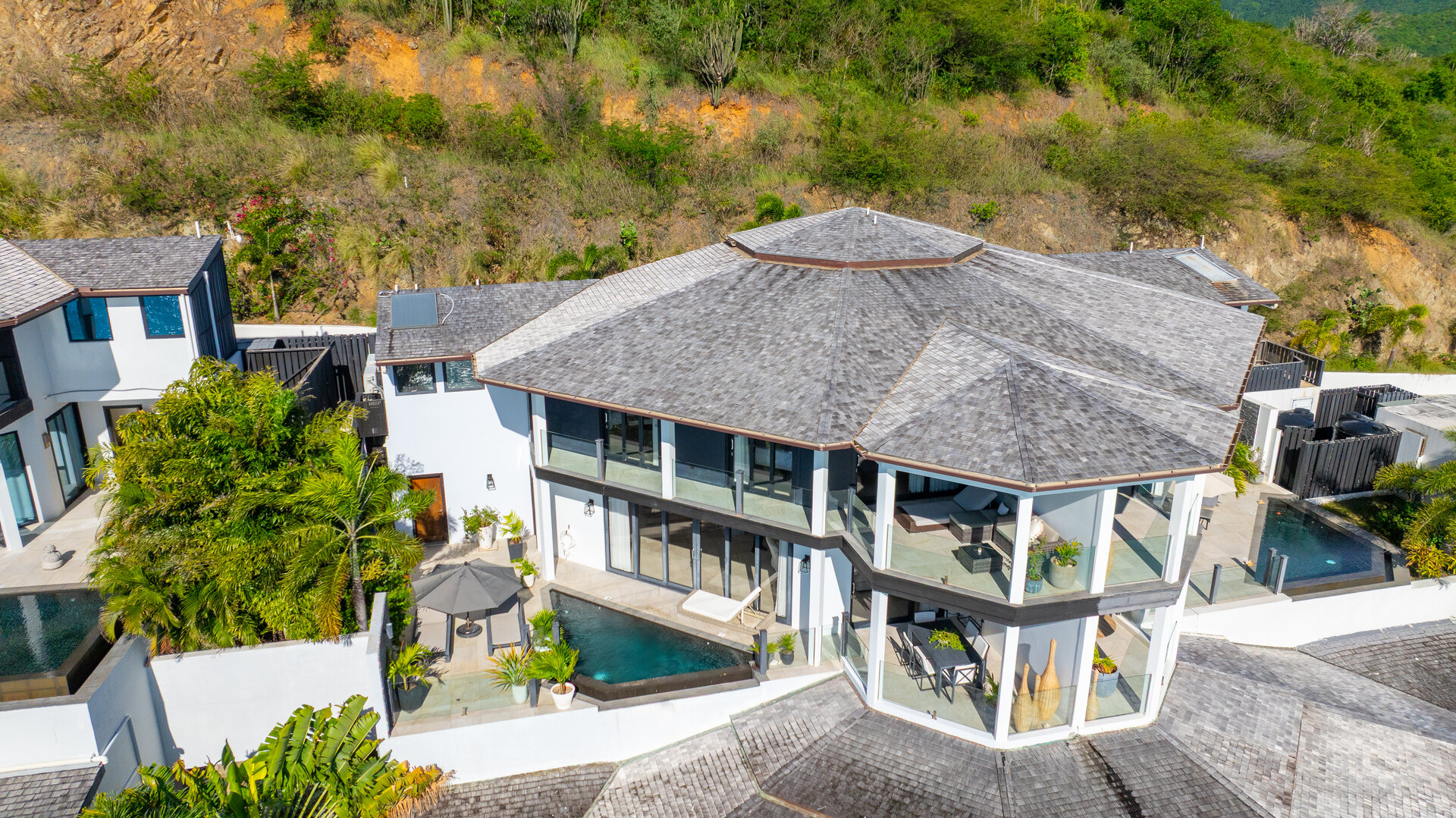 Outdoor living is central to the experience at Olympe. A sun deck surrounds the infinity edge swimming pool, creating an inviting space for long days spent outdoors. Private balconies off each bedroom provide elevated vantage points for sunrise views and quiet moments above the shoreline.