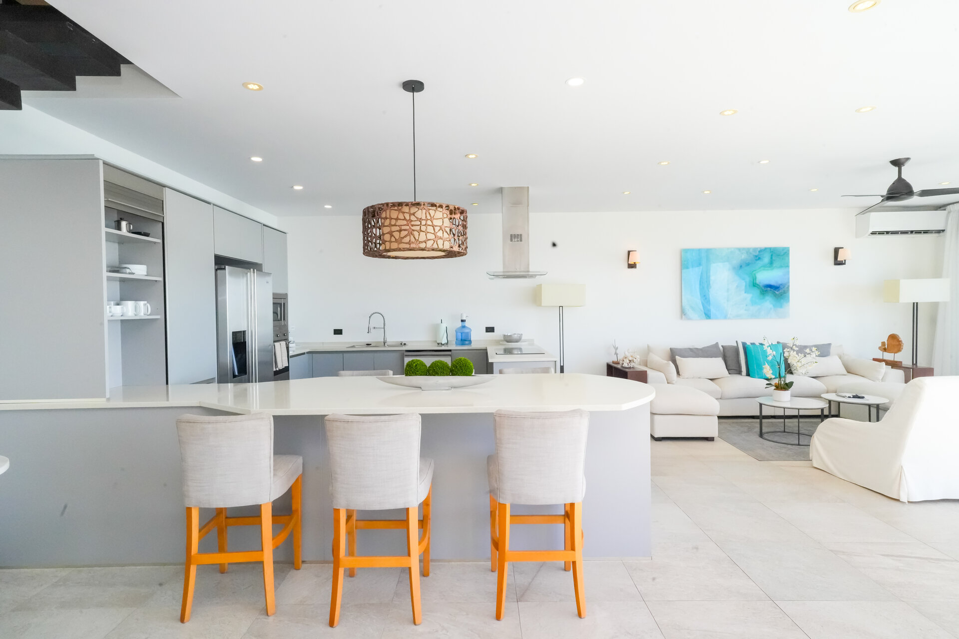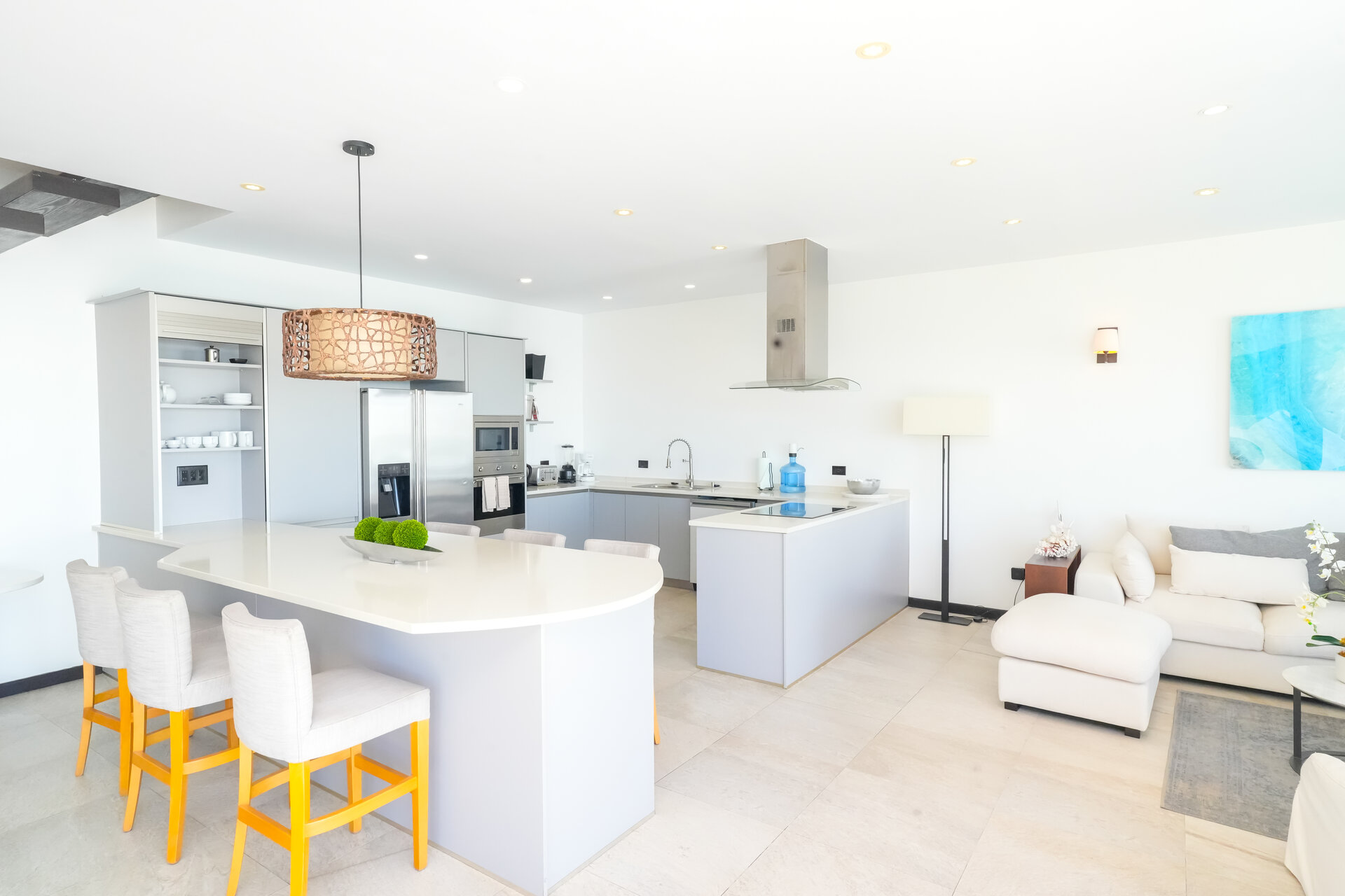 Olympe is arranged around a bright, open plan living space designed to keep the ocean at the centre of the experience. The lounge, kitchen, and dining area flow together effortlessly, with uninterrupted sea views and direct access to the sun deck and infinity edge pool. The atmosphere is calm and contemporary, shaped by light, space, and the constant presence of the Caribbean Sea.