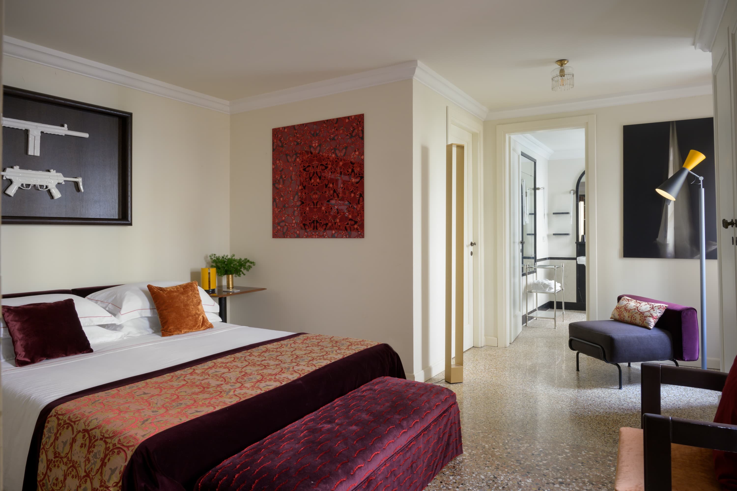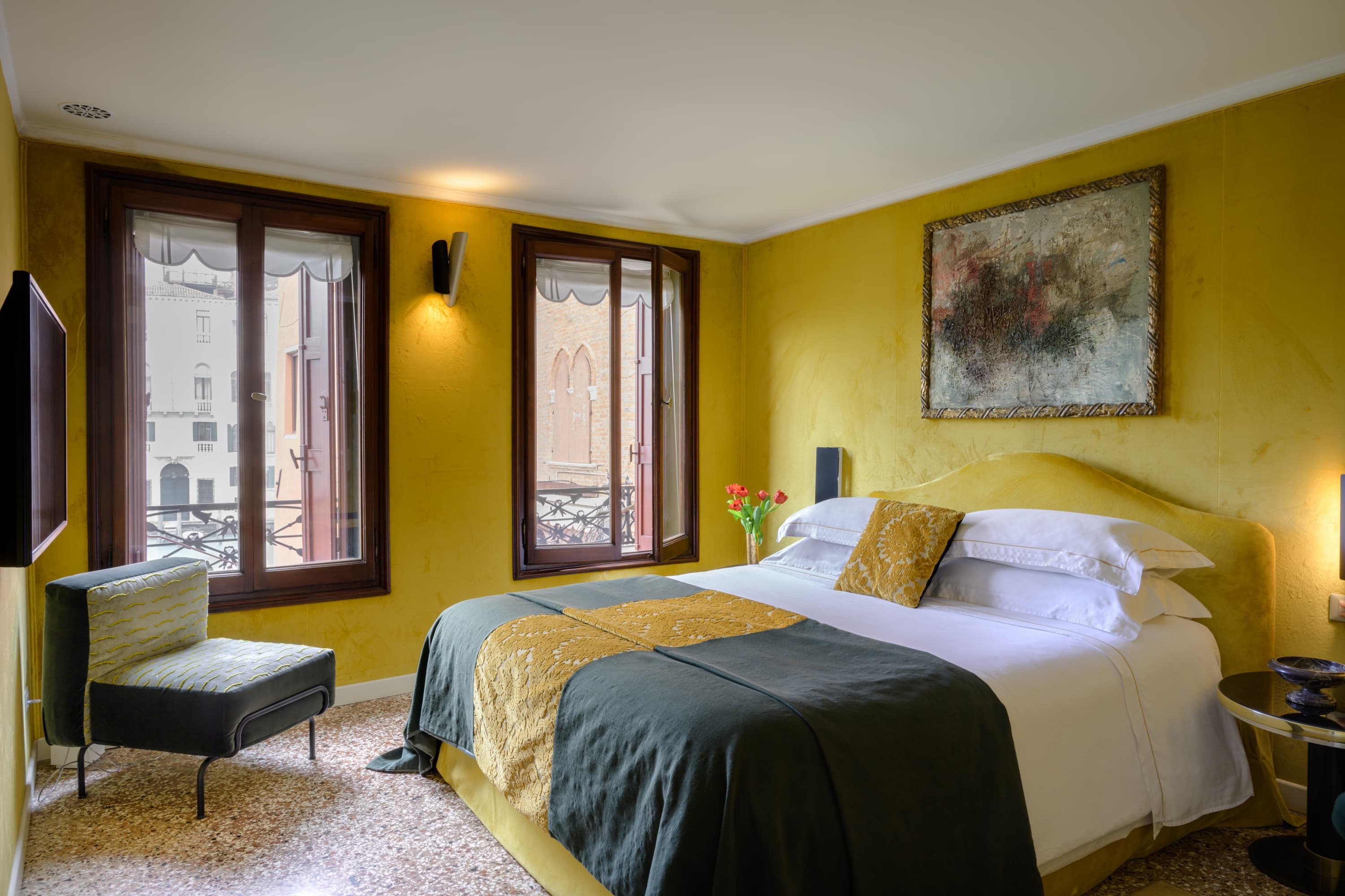 Four individually designed bedrooms are arranged across the upper floors, each with its own distinct palette and atmosphere. Several rooms enjoy views across the Grand Canal, while others overlook the garden. A flexible study can be adapted to provide additional sleeping if required. Laundry services can be arranged, with housekeeping ensuring a seamless stay.