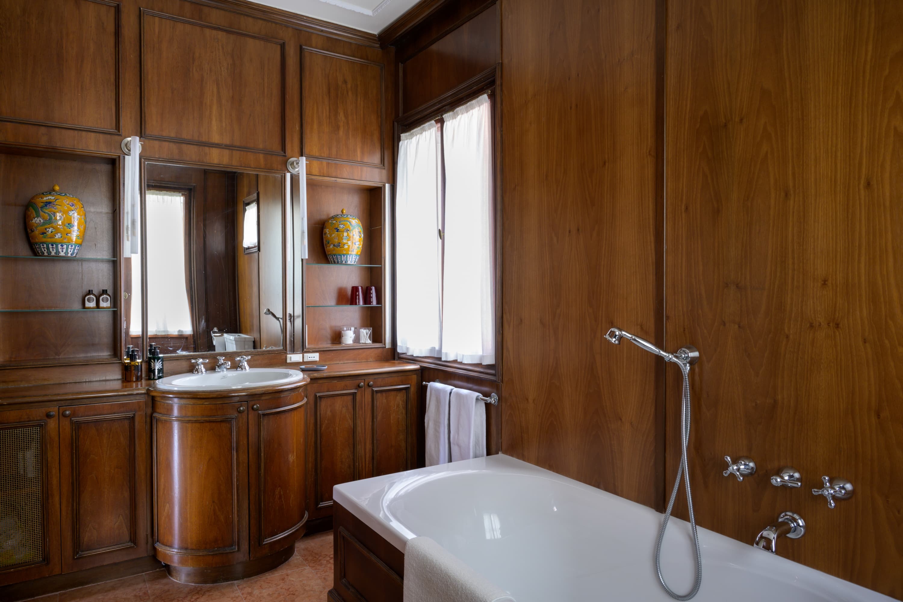 Four bathrooms, each finished in a refined style, combine classic Venetian character with modern comfort. Art deco influences and high-quality materials create spaces that feel both functional and visually distinctive.