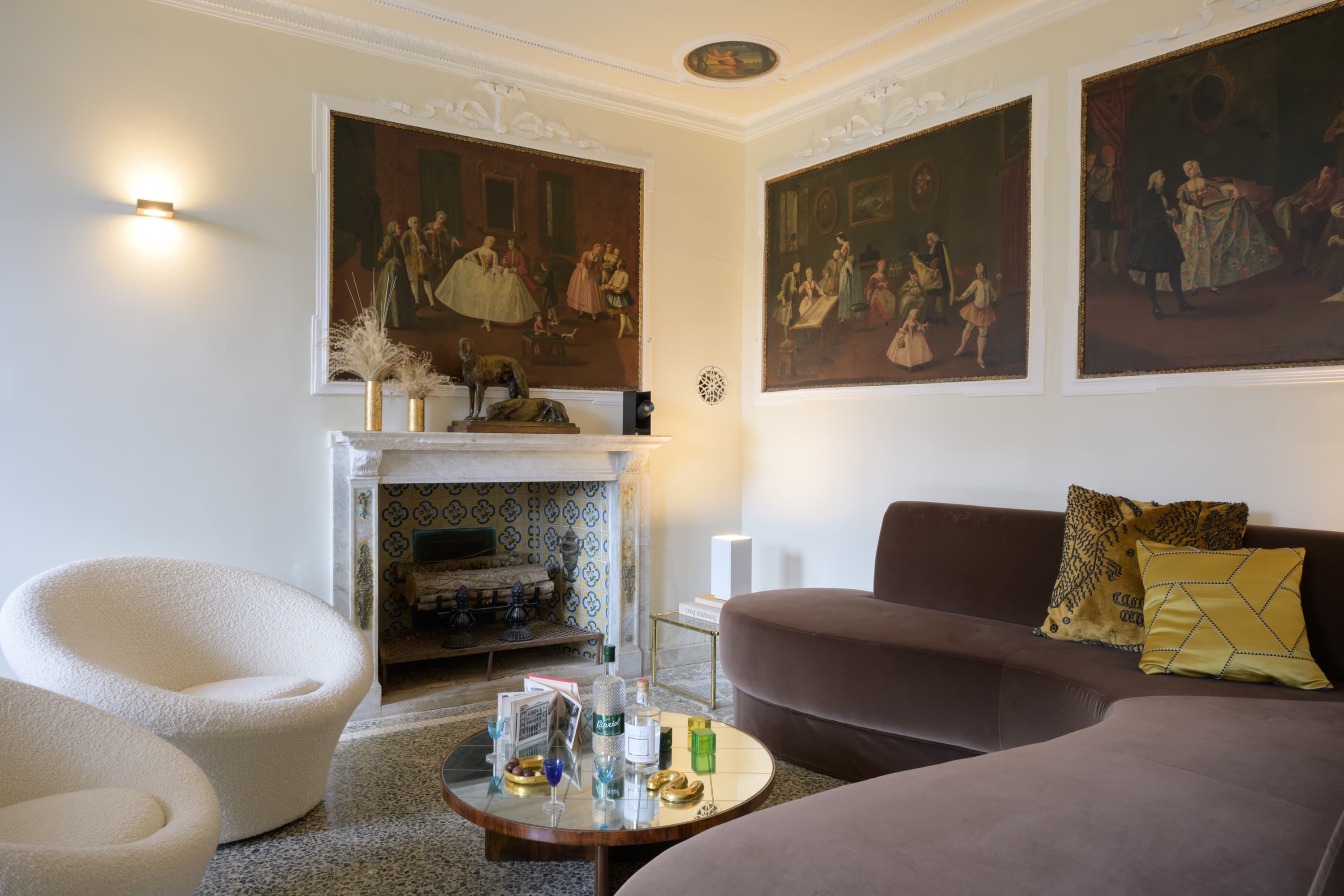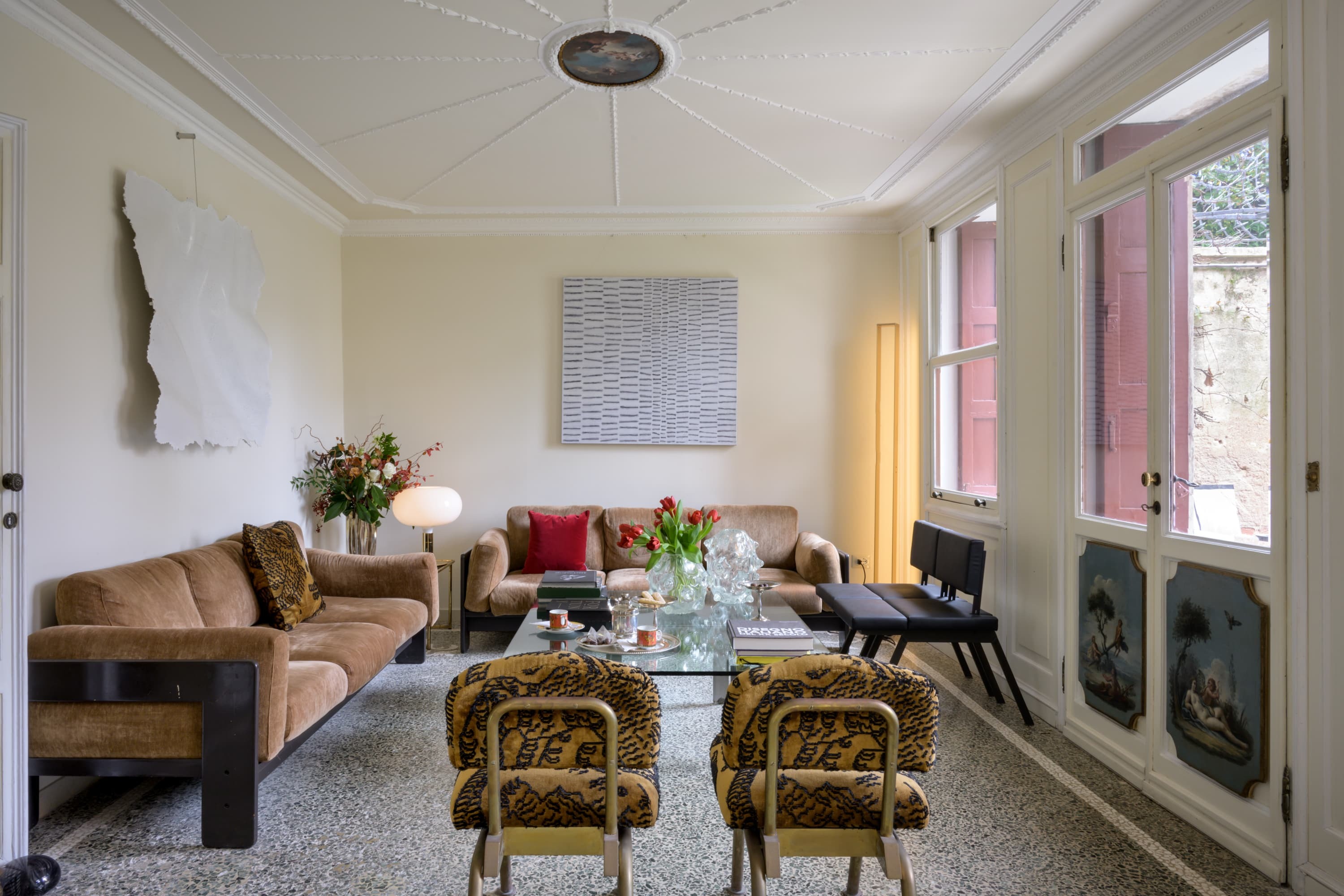 A sequence of refined reception rooms unfolds from the elegant entrance, each space layered with natural light, curated artwork, and a balance of antique detailing and contemporary design. The principal living room opens directly onto the private garden, creating a rare indoor to outdoor flow along the Grand Canal, while additional sitting rooms offer more intimate spaces for reading, conversation, or quiet retreat.