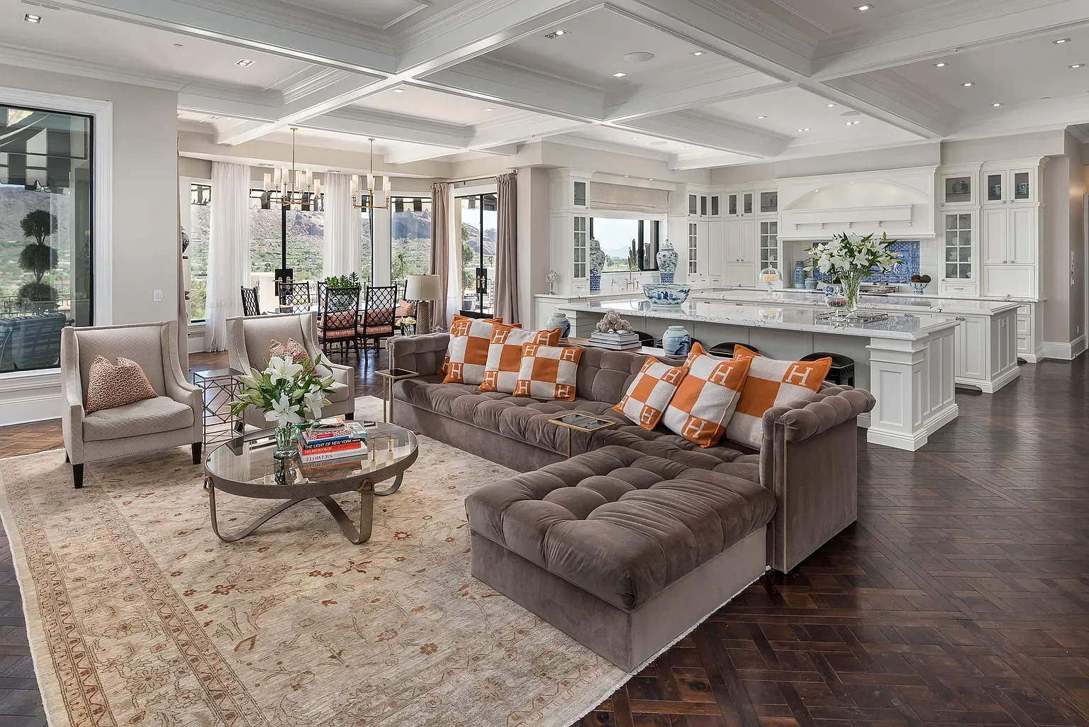 Paradise Valley Estate offers expansive open-plan living areas designed for both large gatherings and relaxed everyday use. The main living space features soaring ceilings, arched windows, and multiple seating zones, allowing guests to socialise or retreat in comfort. A formal function room is also included, suitable for private events, brand activations, or celebrations.