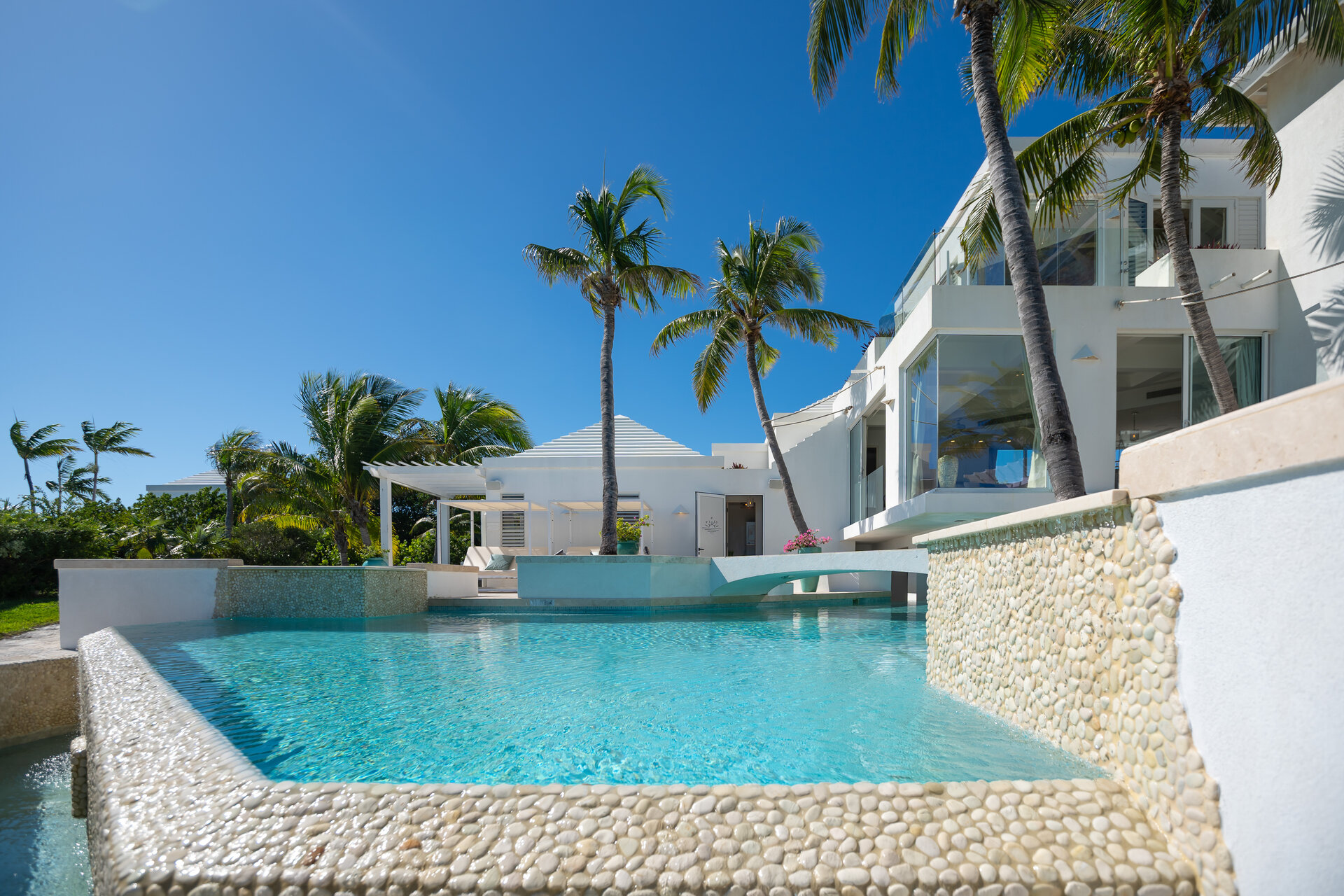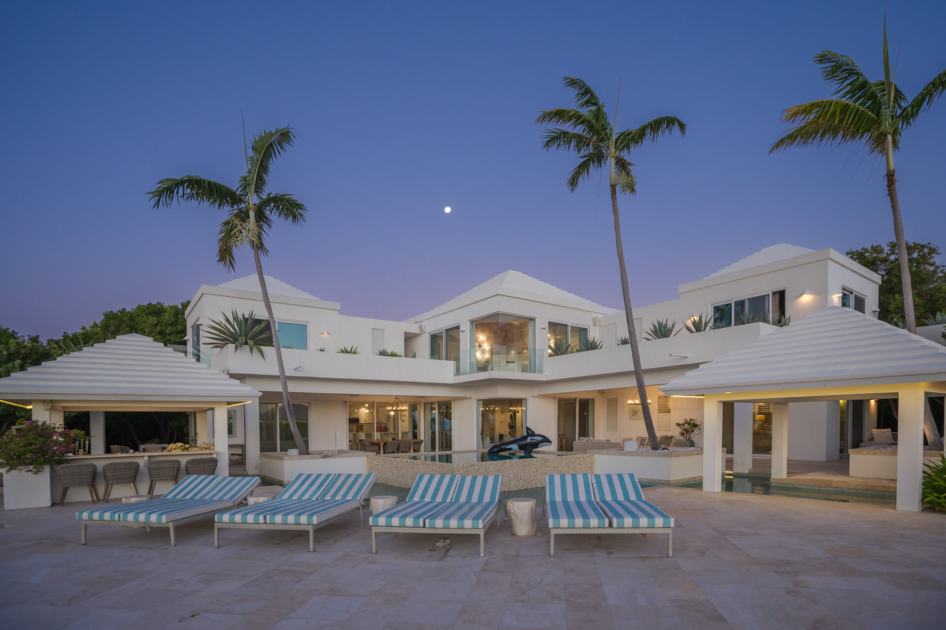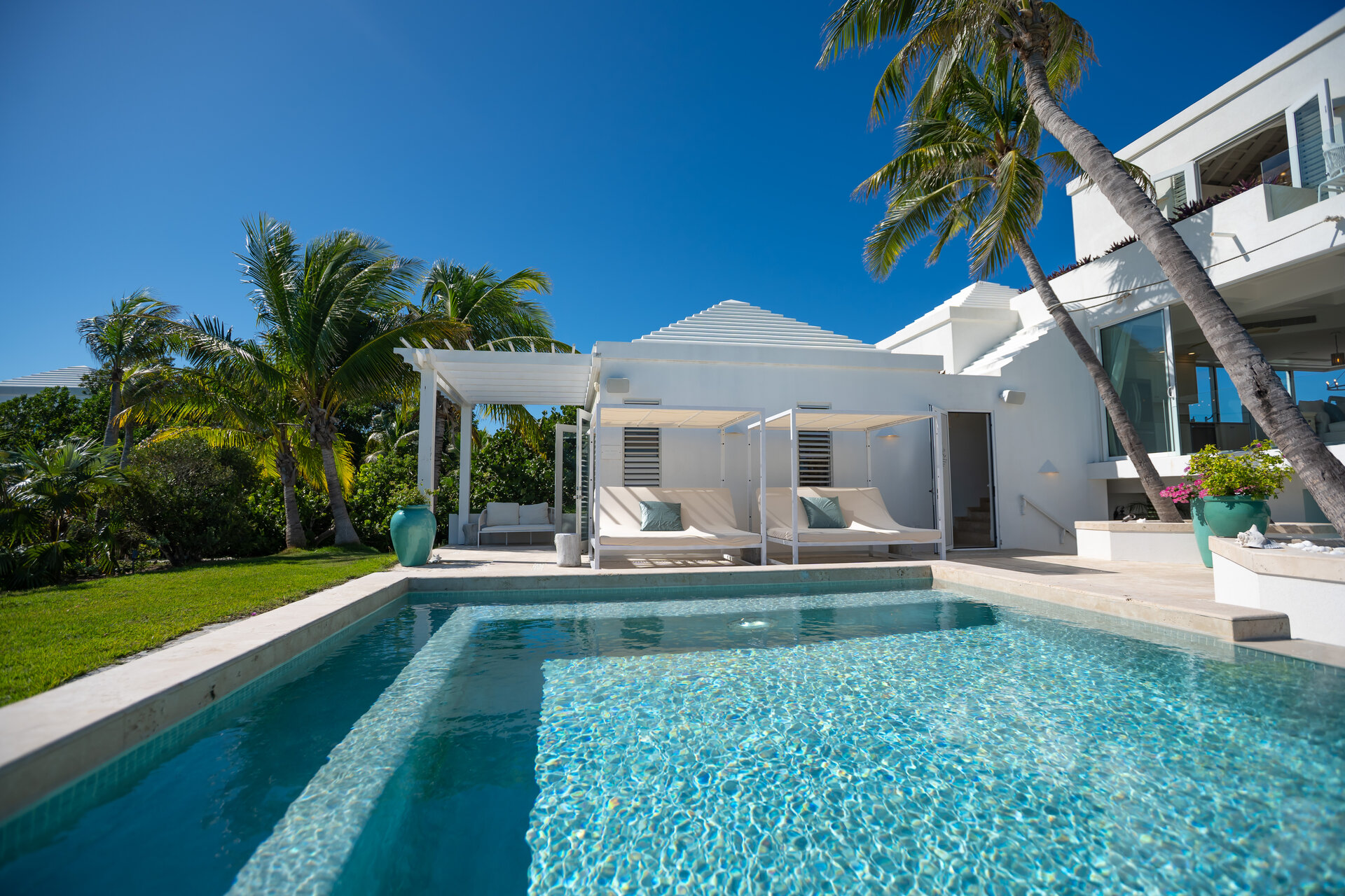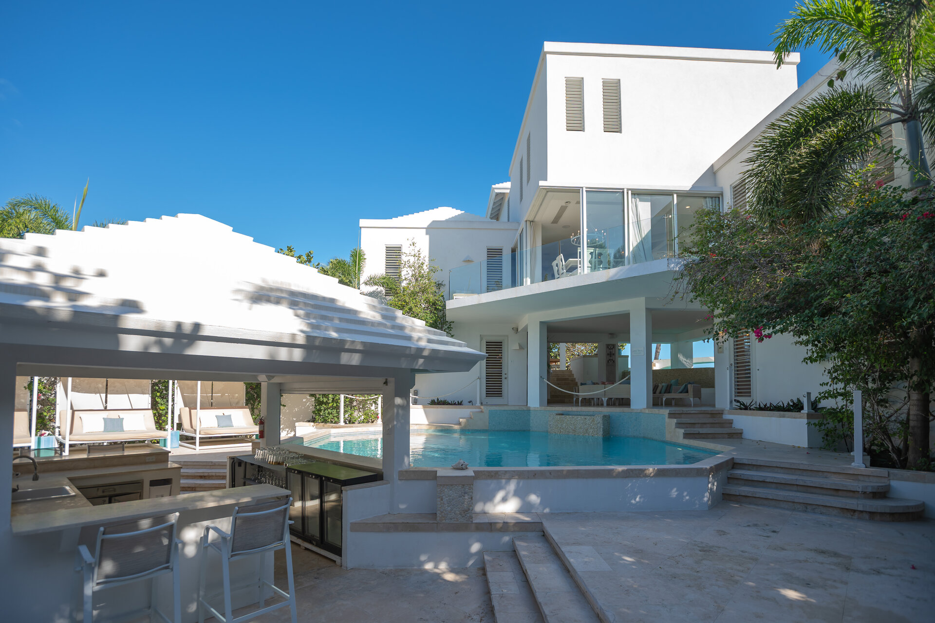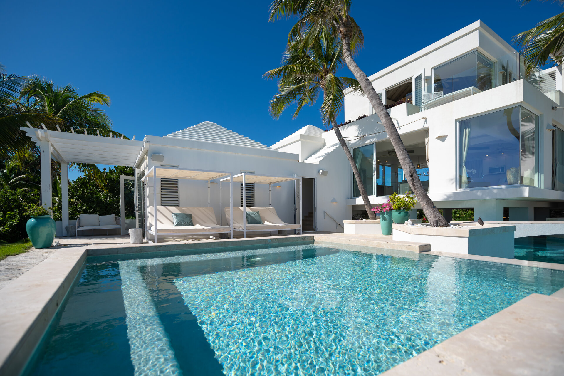Outdoor living is a defining feature of the villa. Two freshwater swimming pools, including a heated bar pool, a children’s wading pool, a hot tub, waterfall feature, and fire pit create a resort style environment. Sun decks, shaded lounges, alfresco dining for up to twenty guests, a teppanyaki grill, barbecue area, and full pool bar make entertaining effortless from day to night. Beach loungers, umbrellas, towels, and a beachside sound system complete the experience.