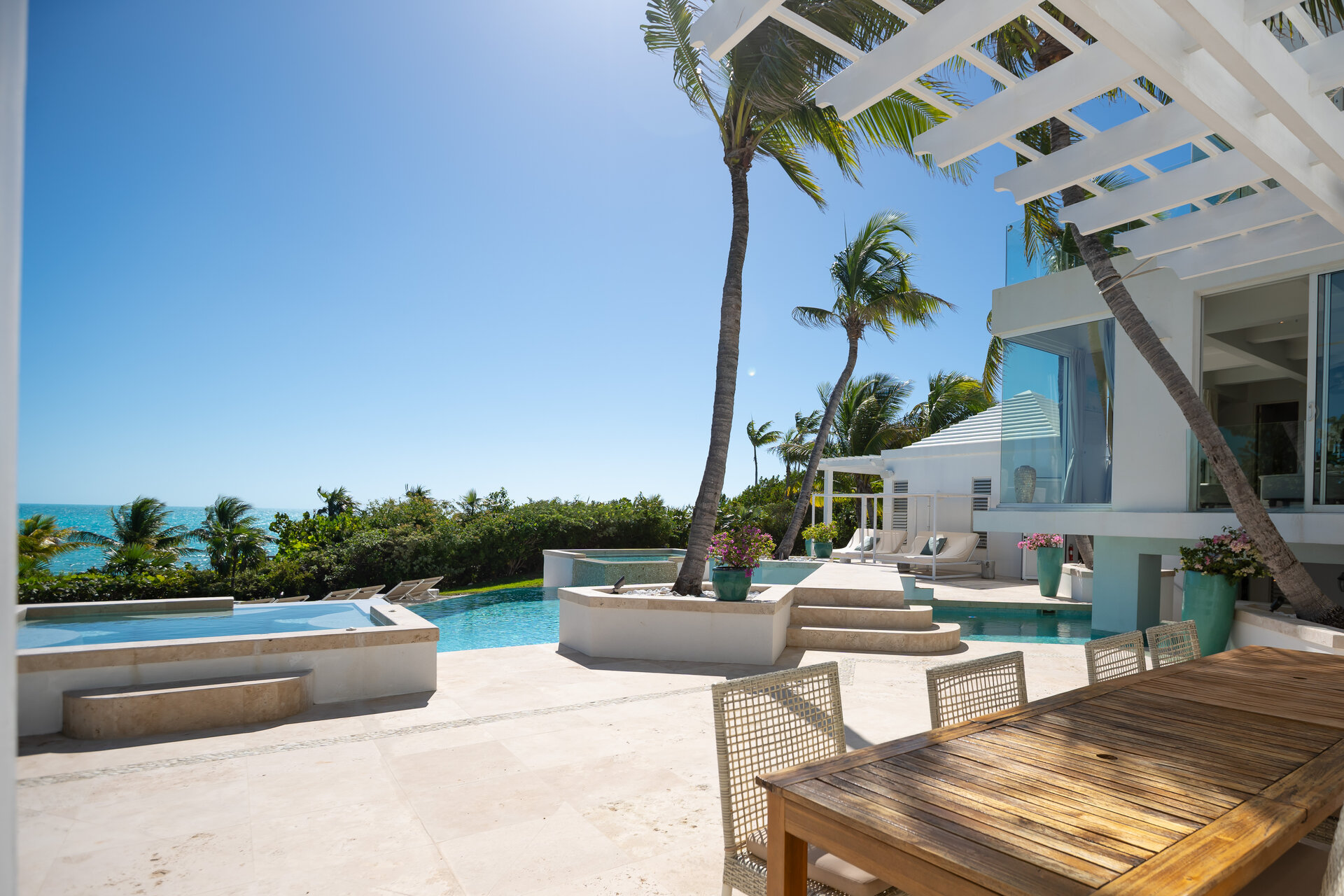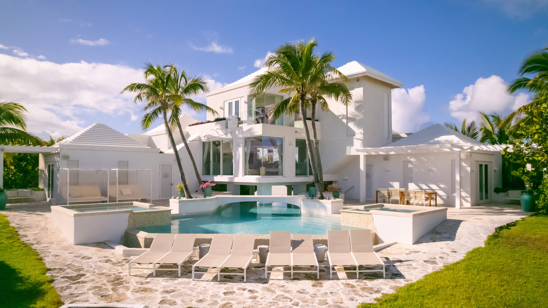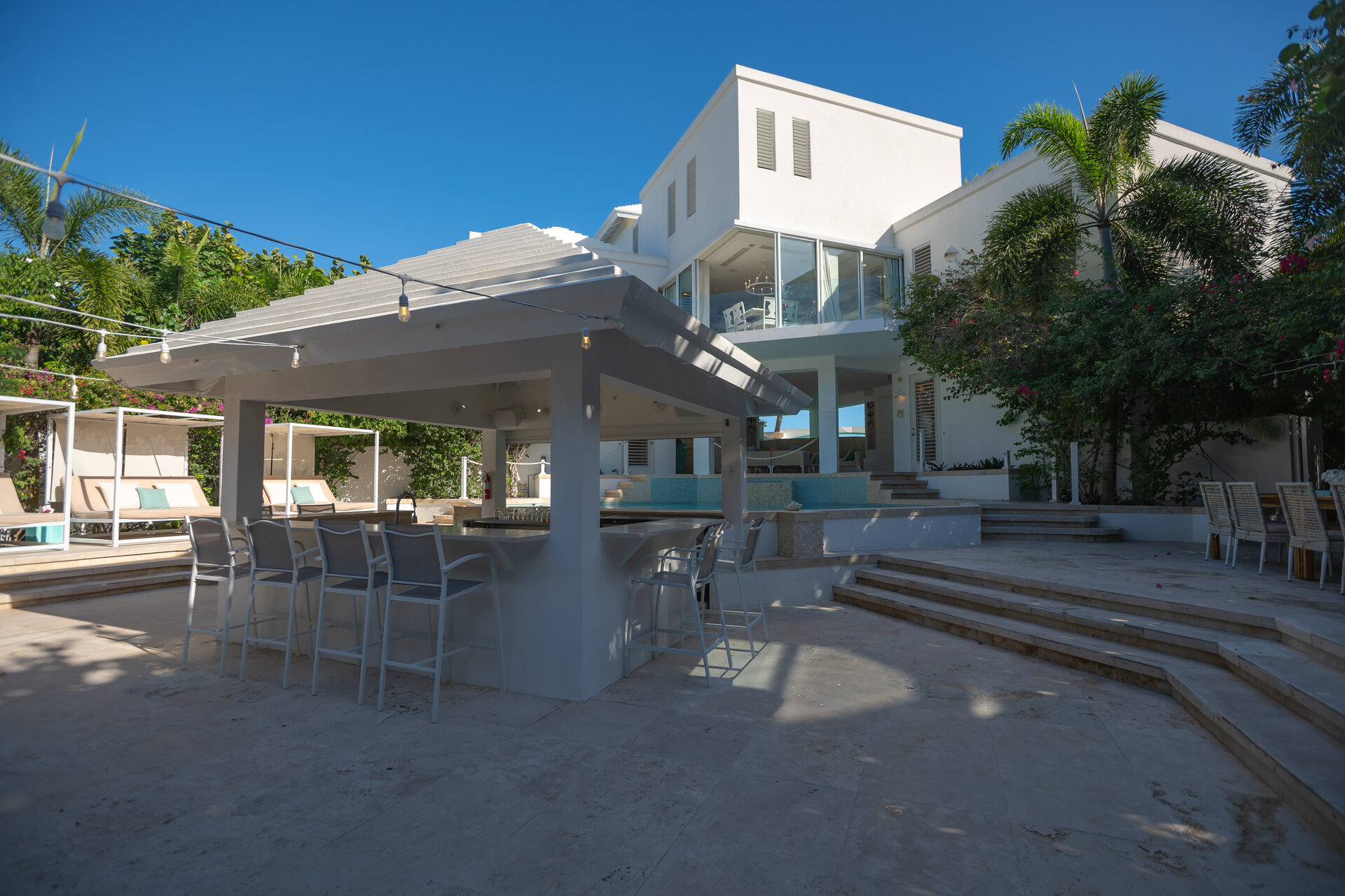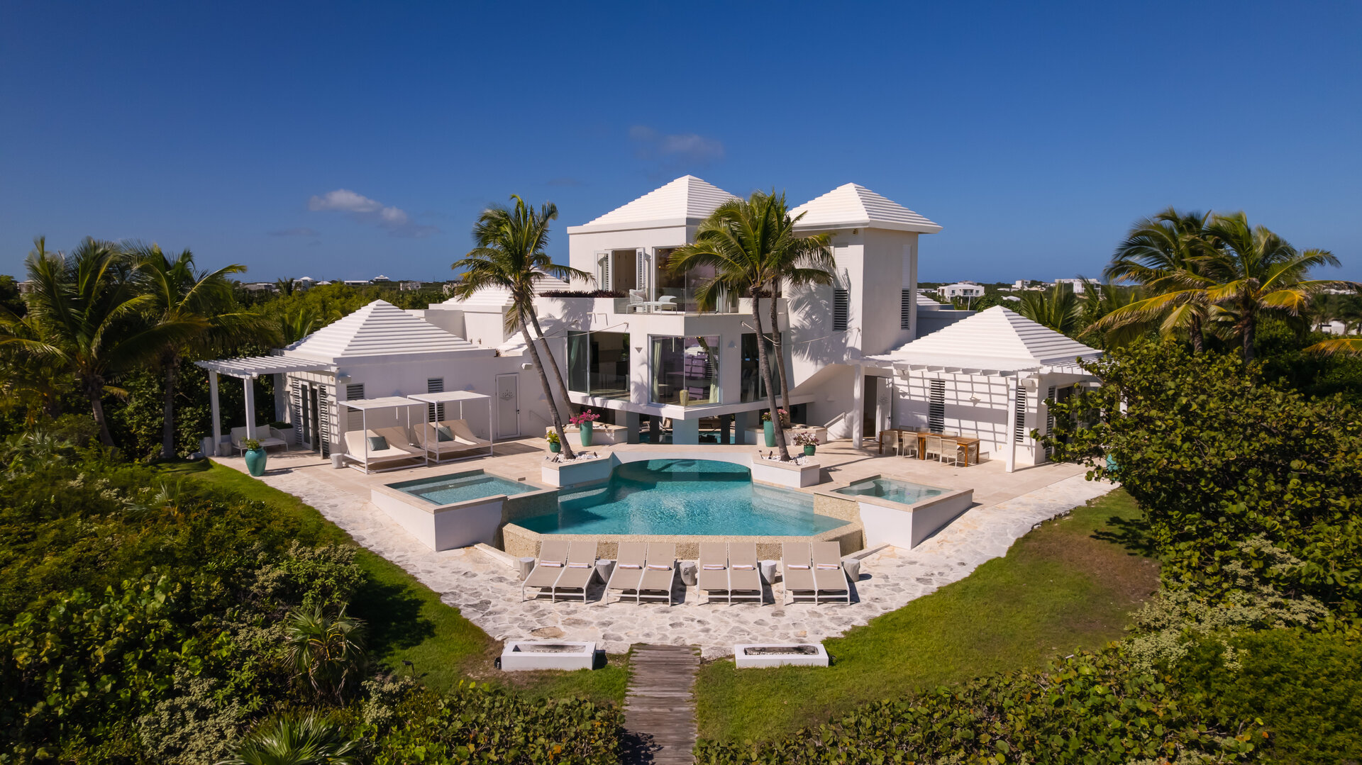 Outdoor living is a defining feature of the villa. Two freshwater swimming pools, including a heated bar pool, a children’s wading pool, a hot tub, waterfall feature, and fire pit create a resort style environment. Sun decks, shaded lounges, alfresco dining for up to twenty guests, a teppanyaki grill, barbecue area, and full pool bar make entertaining effortless from day to night. Beach loungers, umbrellas, towels, and a beachside sound system complete the experience.