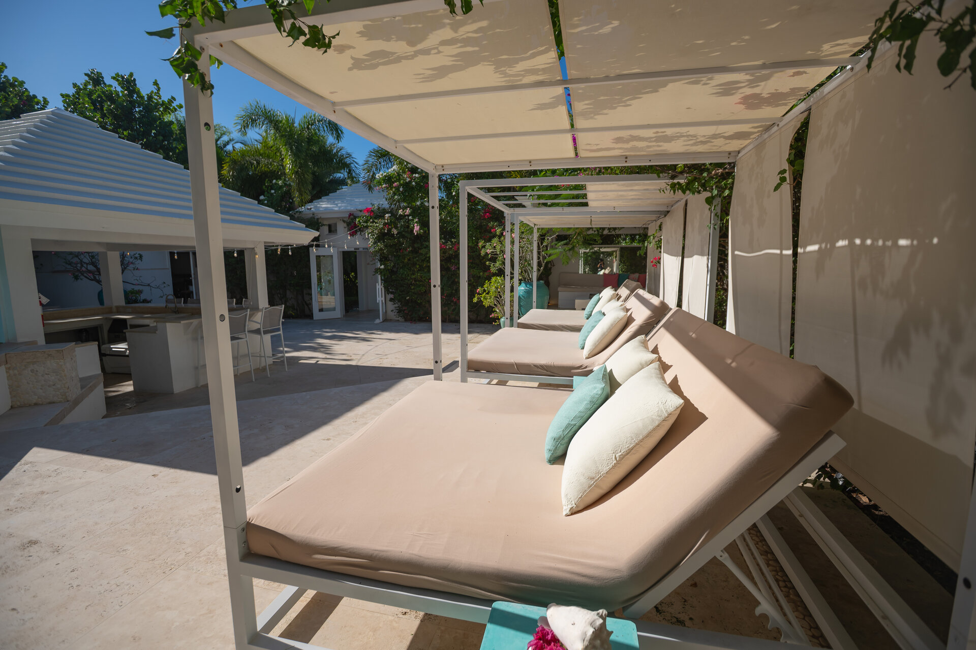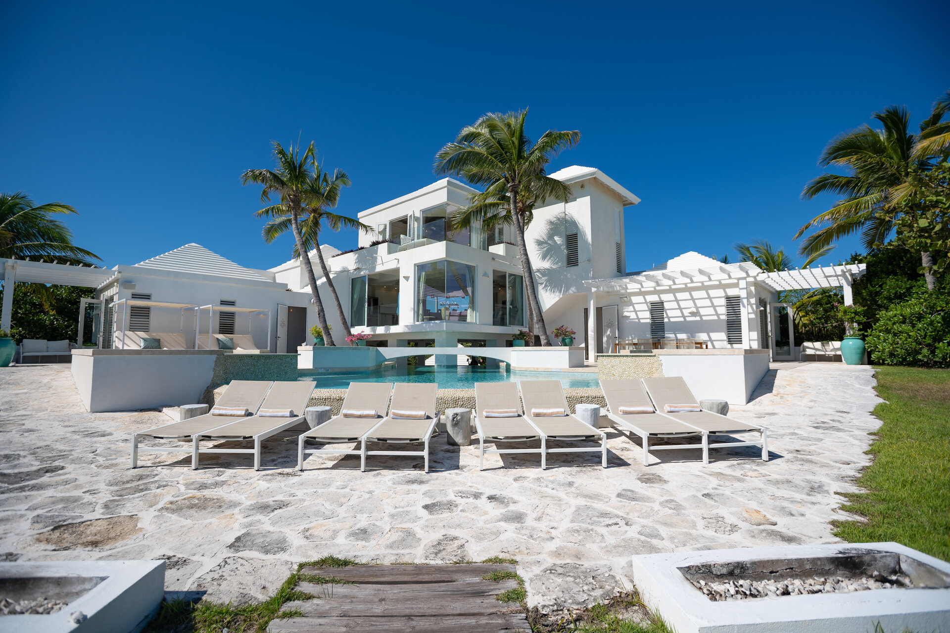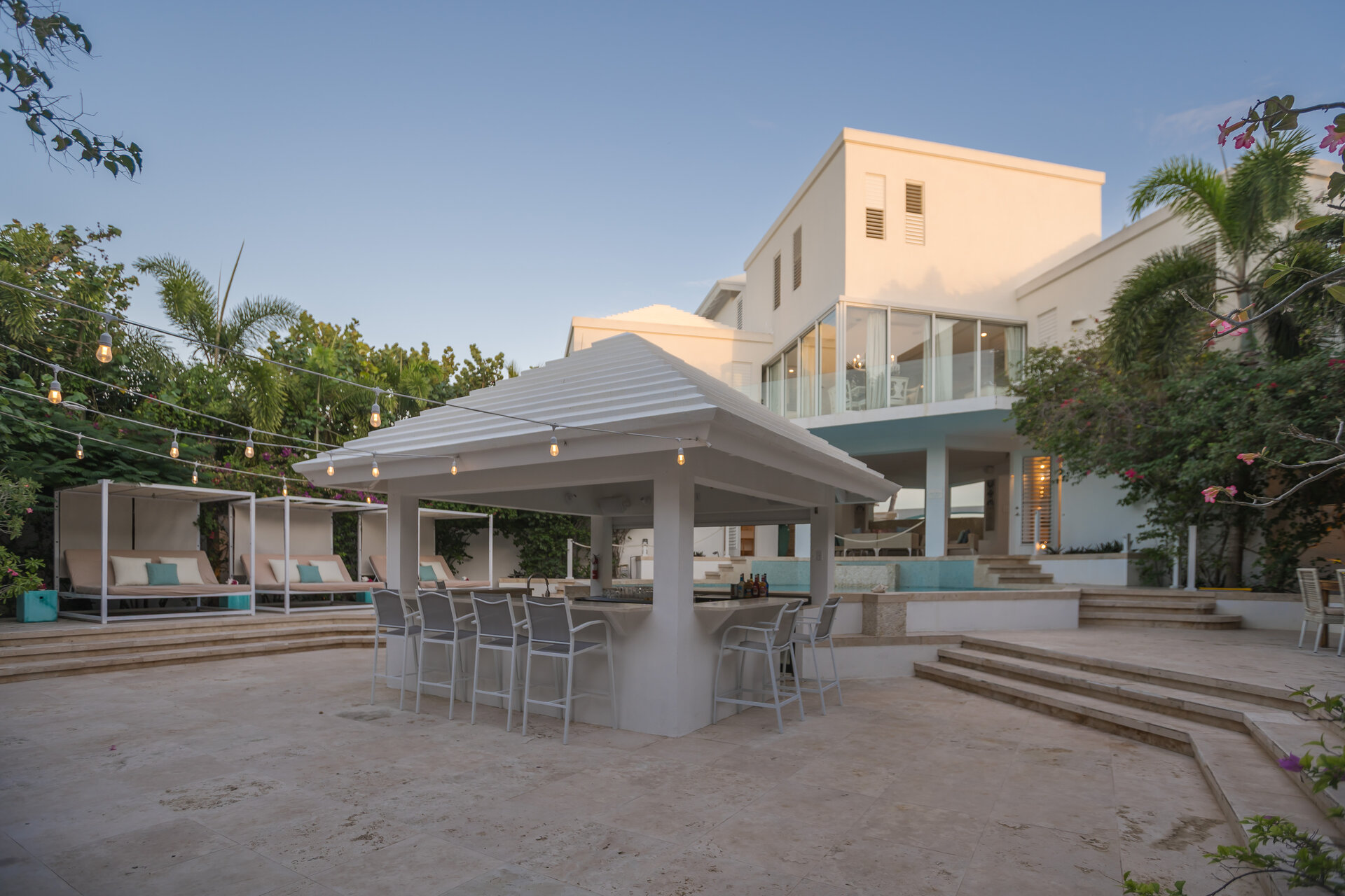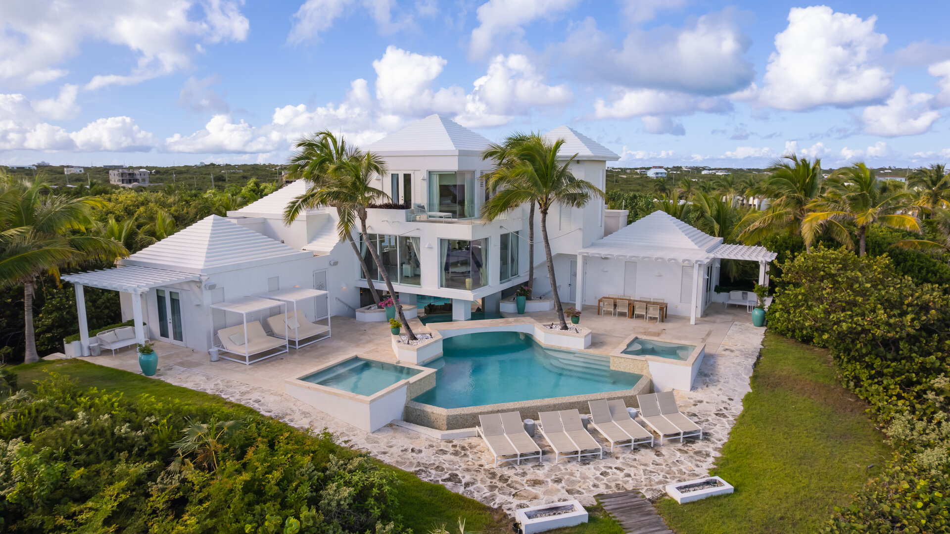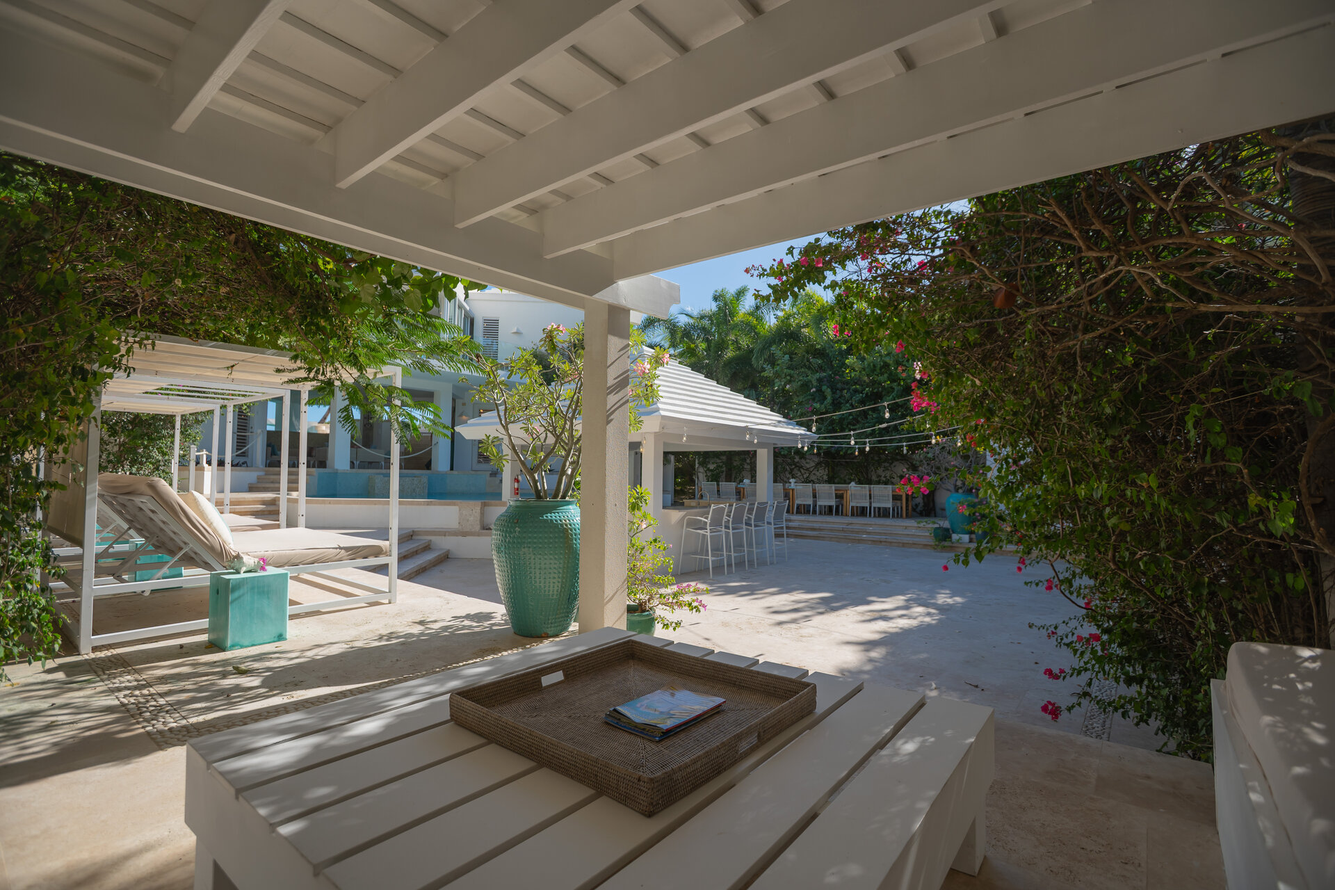 Outdoor living is a defining feature of the villa. Two freshwater swimming pools, including a heated bar pool, a children’s wading pool, a hot tub, waterfall feature, and fire pit create a resort style environment. Sun decks, shaded lounges, alfresco dining for up to twenty guests, a teppanyaki grill, barbecue area, and full pool bar make entertaining effortless from day to night. Beach loungers, umbrellas, towels, and a beachside sound system complete the experience.