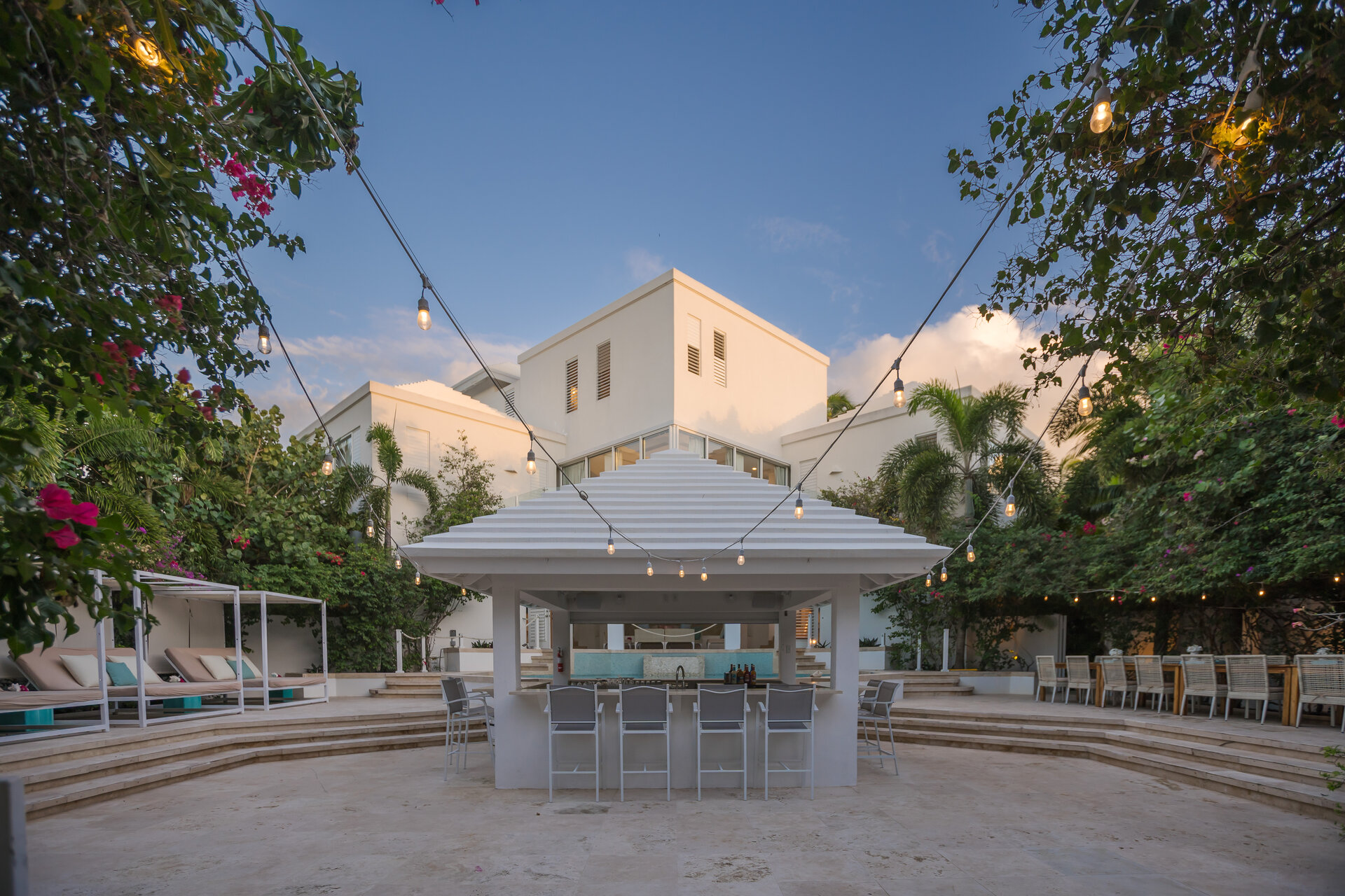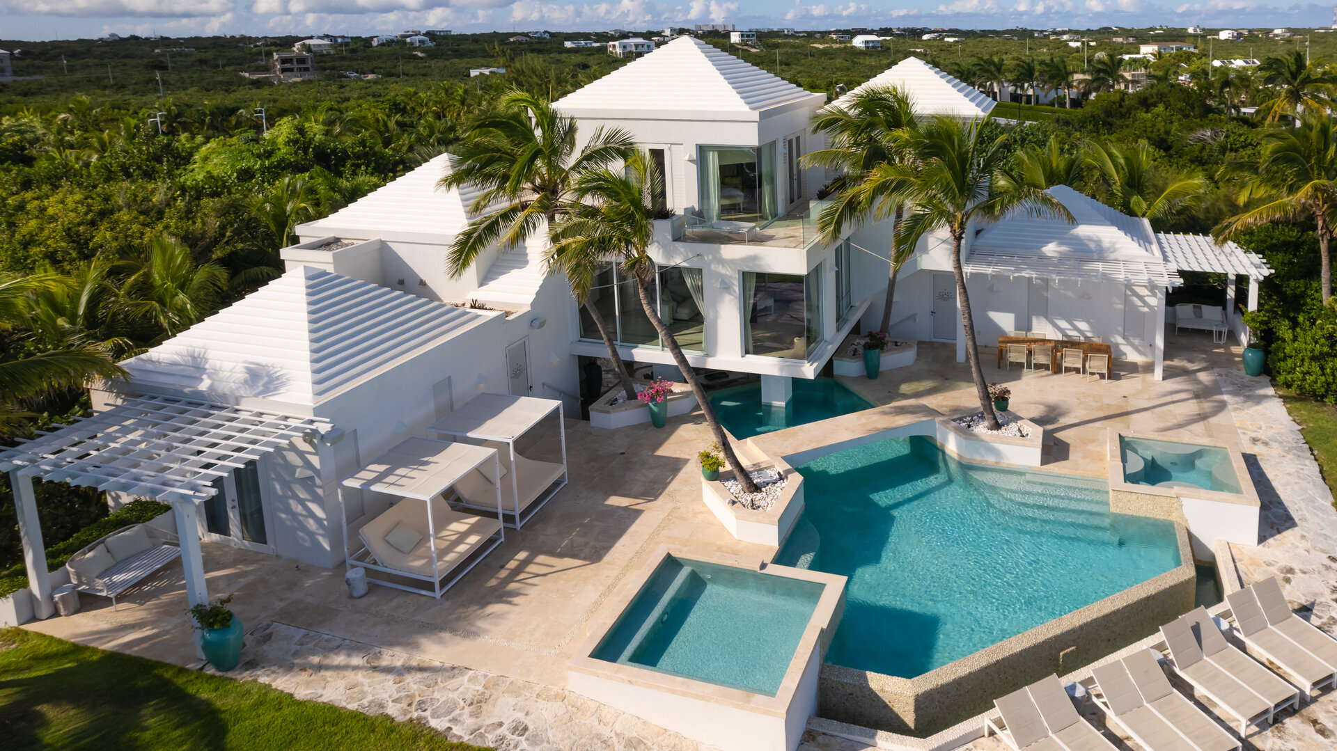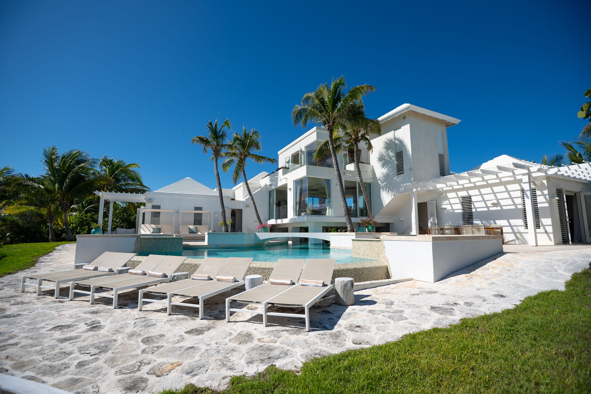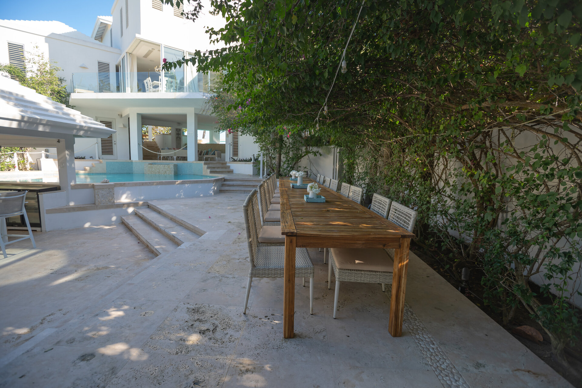 Outdoor living is a defining feature of the villa. Two freshwater swimming pools, including a heated bar pool, a children’s wading pool, a hot tub, waterfall feature, and fire pit create a resort style environment. Sun decks, shaded lounges, alfresco dining for up to twenty guests, a teppanyaki grill, barbecue area, and full pool bar make entertaining effortless from day to night. Beach loungers, umbrellas, towels, and a beachside sound system complete the experience.