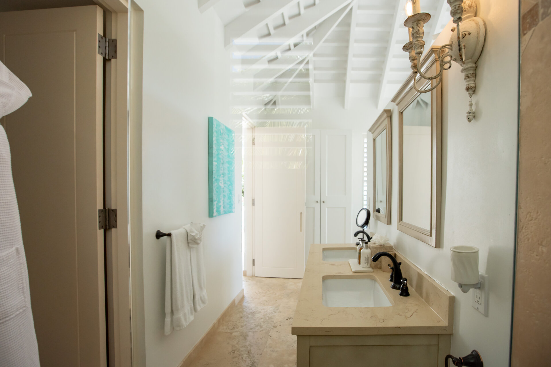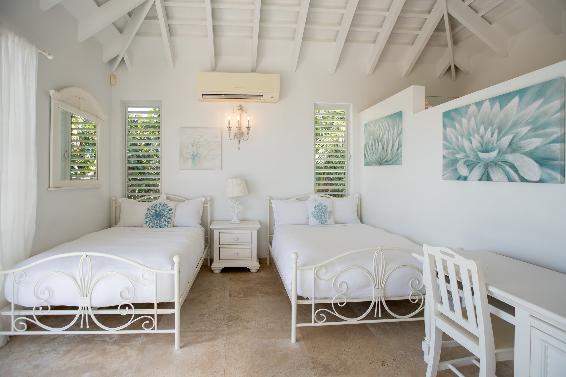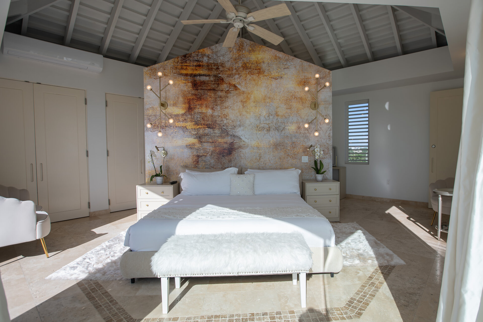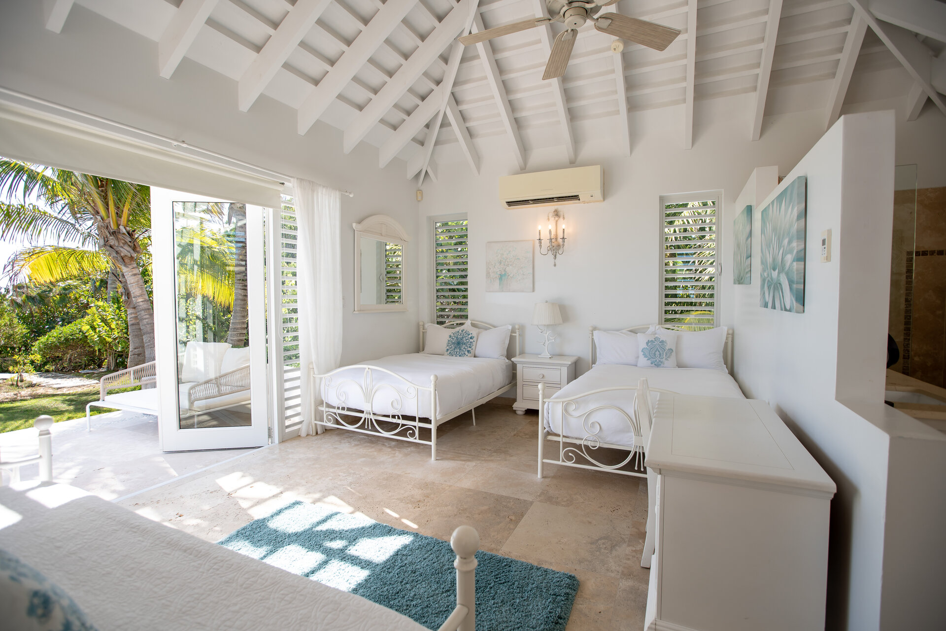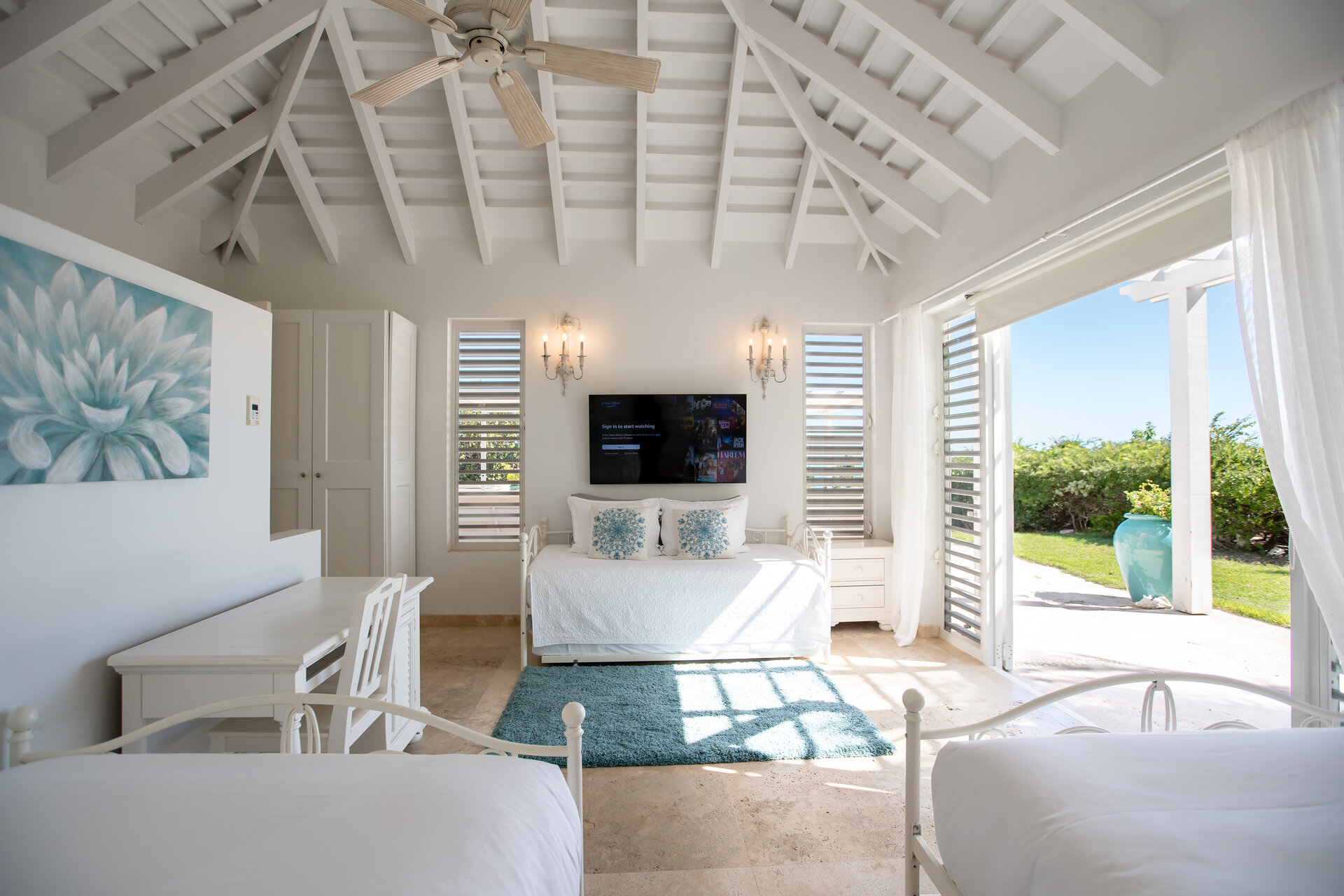 Outdoor living is a defining feature of the villa. Two freshwater swimming pools, including a heated bar pool, a children’s wading pool, a hot tub, waterfall feature, and fire pit create a resort style environment. Sun decks, shaded lounges, alfresco dining for up to twenty guests, a teppanyaki grill, barbecue area, and full pool bar make entertaining effortless from day to night. Beach loungers, umbrellas, towels, and a beachside sound system complete the experience.
