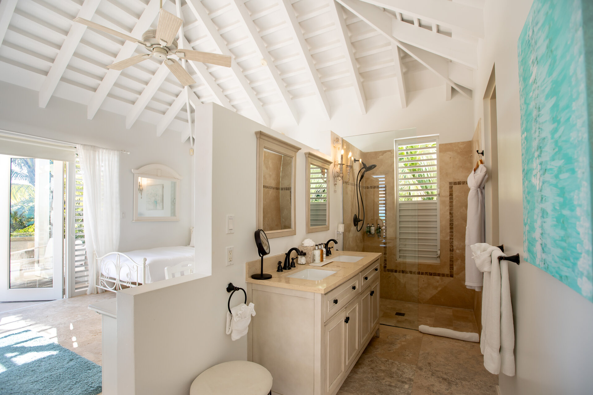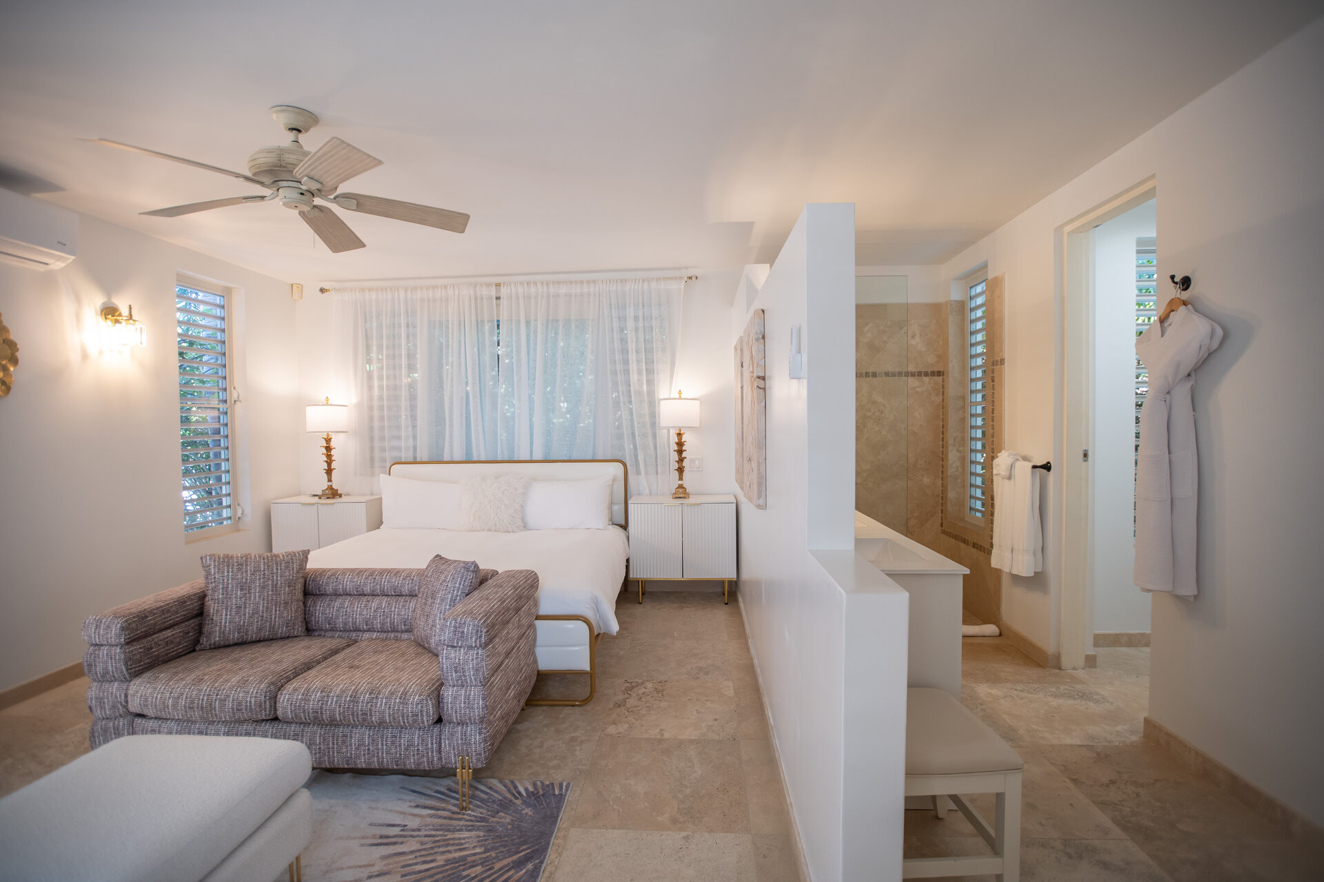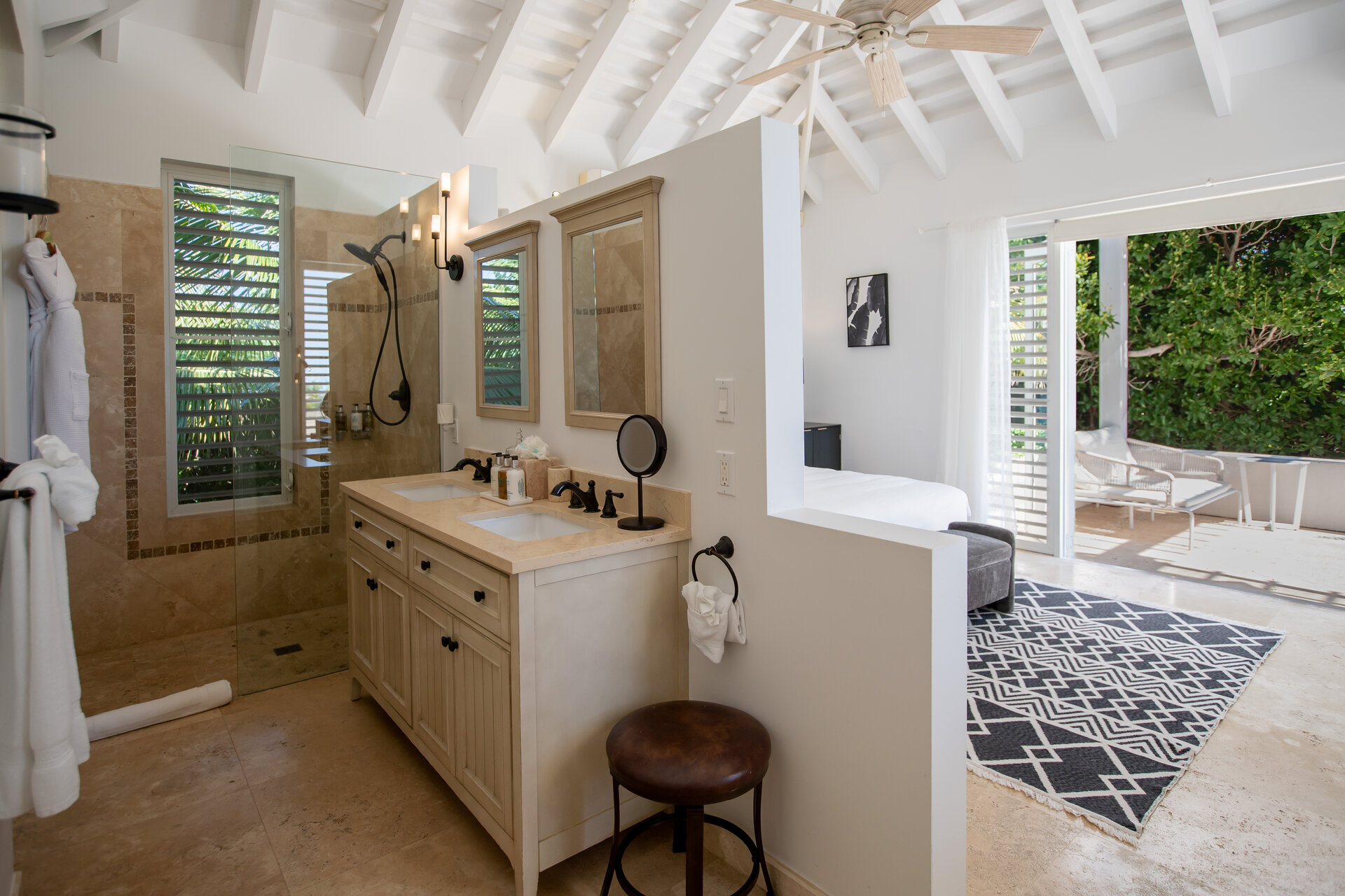 Non metered air conditioning and ceiling fans are installed throughout the villa, maintaining a comfortable climate year round. Shaded terraces and ocean breezes further enhance natural cooling across the estate.