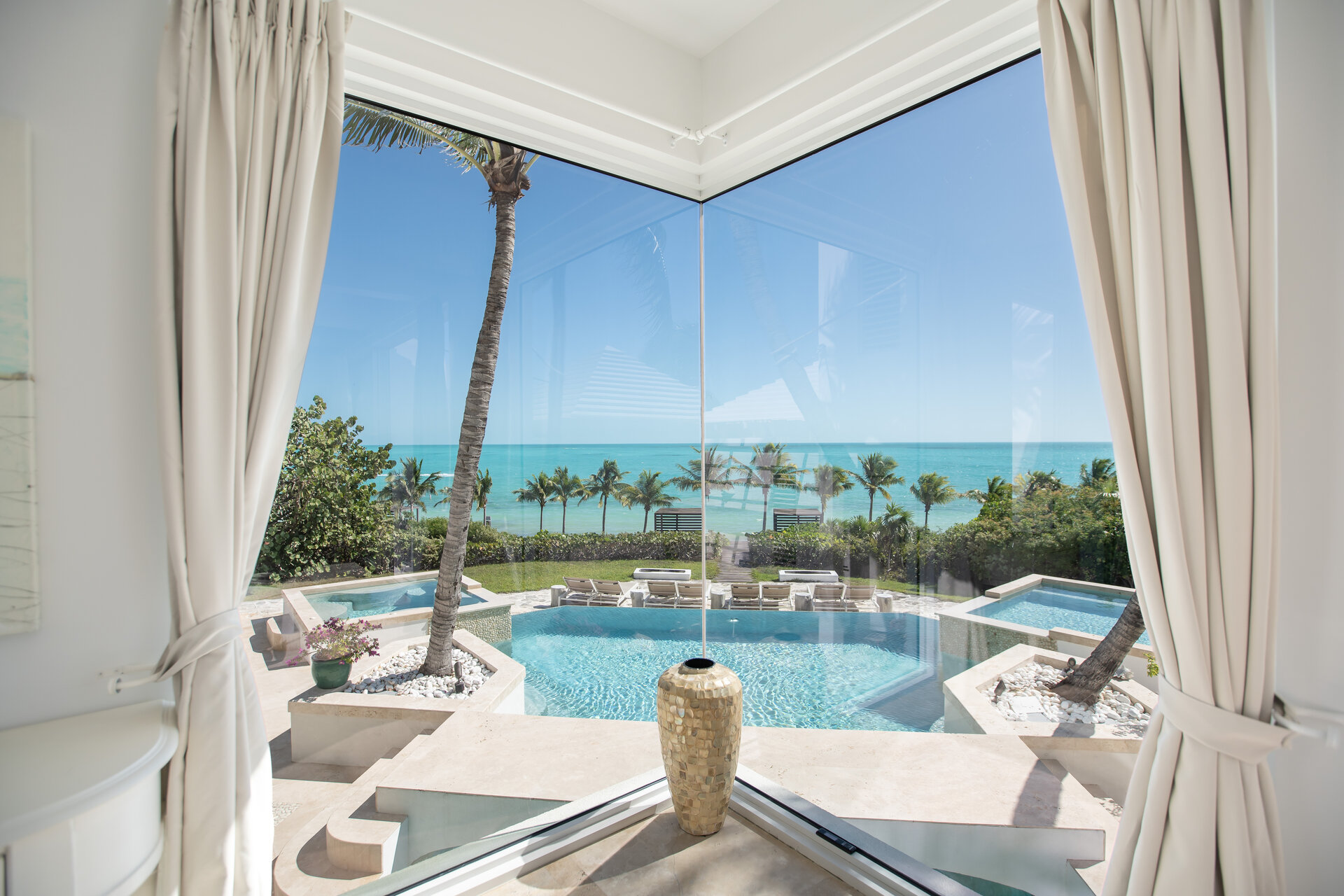 Pearl East is designed around expansive, open plan living areas that embrace its oceanfront setting. Light filled lounges and dining spaces are framed by glass and open directly onto the pool terrace and beach, allowing indoor and outdoor living to flow effortlessly throughout the day. Multiple seating areas provide space for social gatherings as well as quieter moments overlooking the sea.