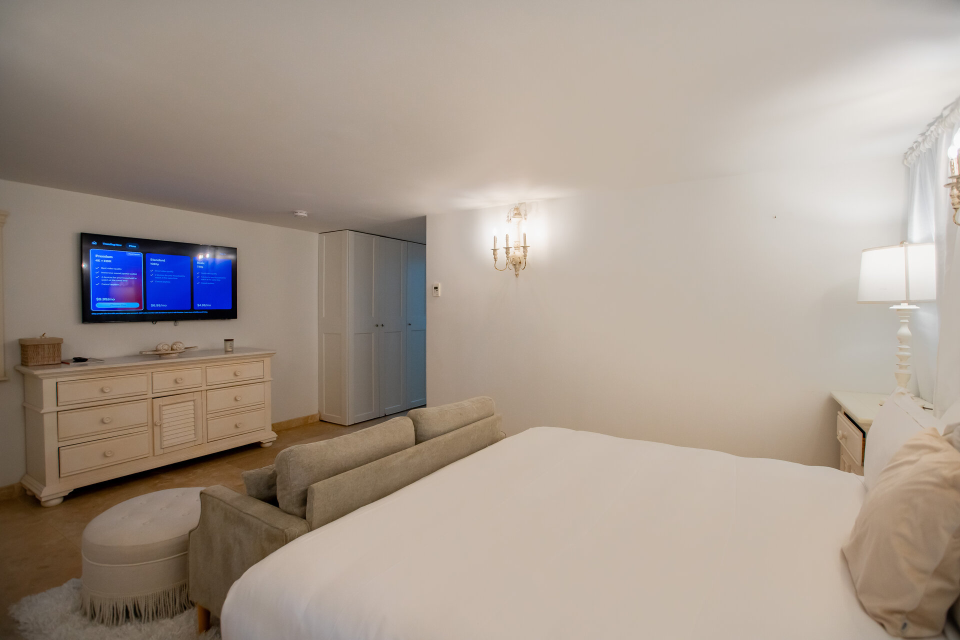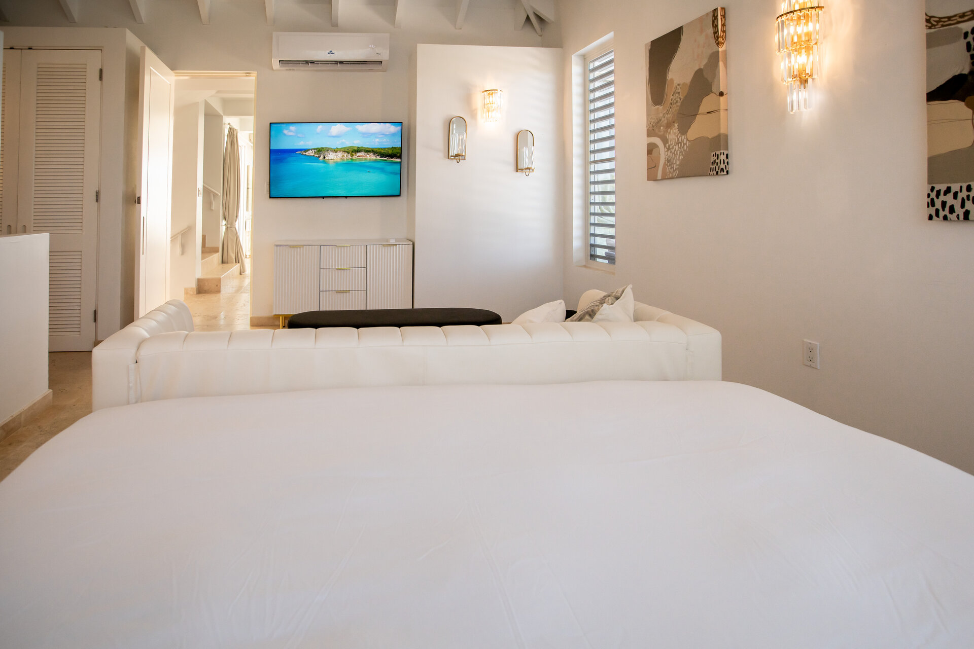 The villa accommodates up to sixteen guests across eight generously proportioned bedrooms, each offering privacy, refined finishes, and ensuite bathrooms. Seven bedrooms feature king beds, with one double bedroom completing the layout. Laundry facilities including a washer, dryer, iron, and ironing board are available for guest use, supported by daily housekeeping to ensure comfort during extended stays.