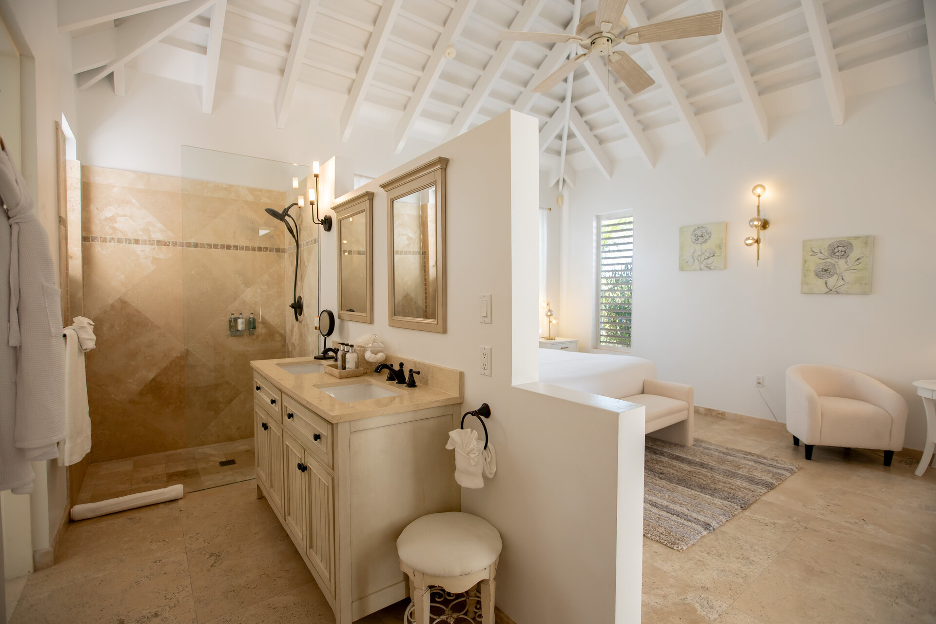 Each bedroom includes a private ensuite bathroom finished with high quality fixtures and spa inspired details. Additional guest facilities are thoughtfully placed throughout the villa to support the main living areas and outdoor spaces