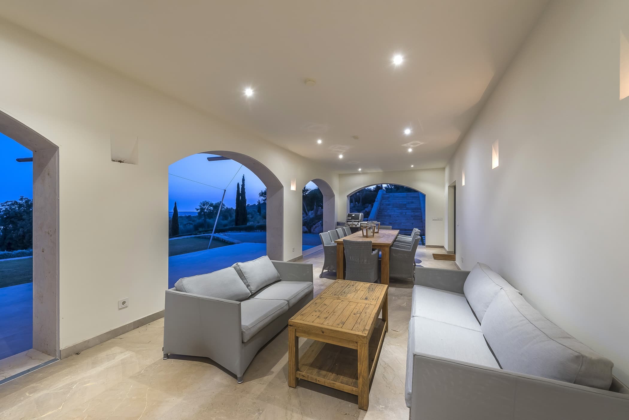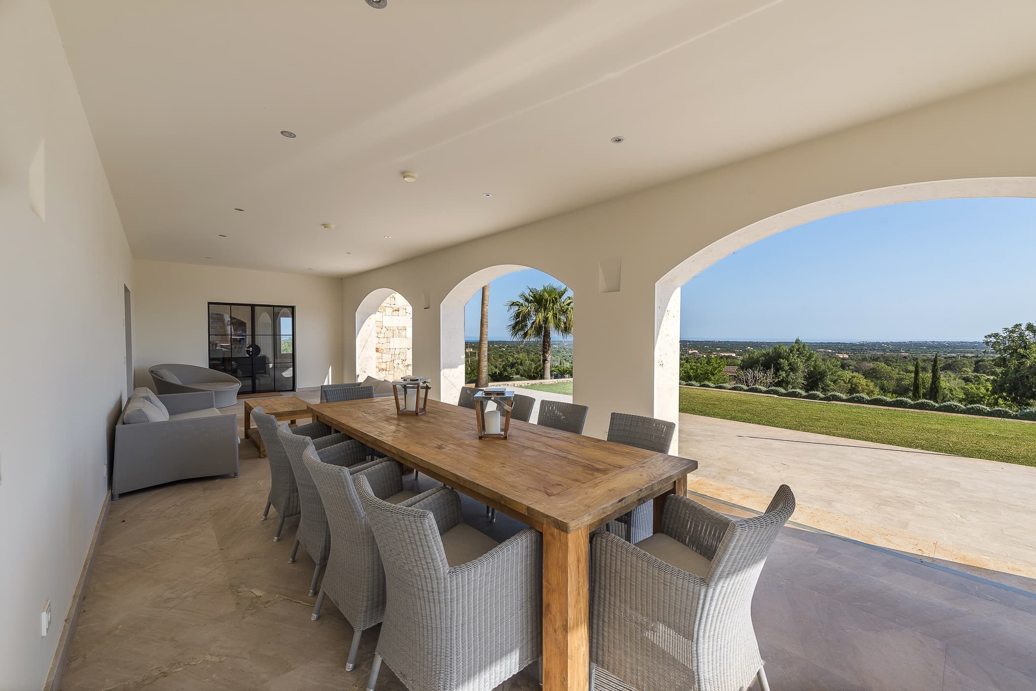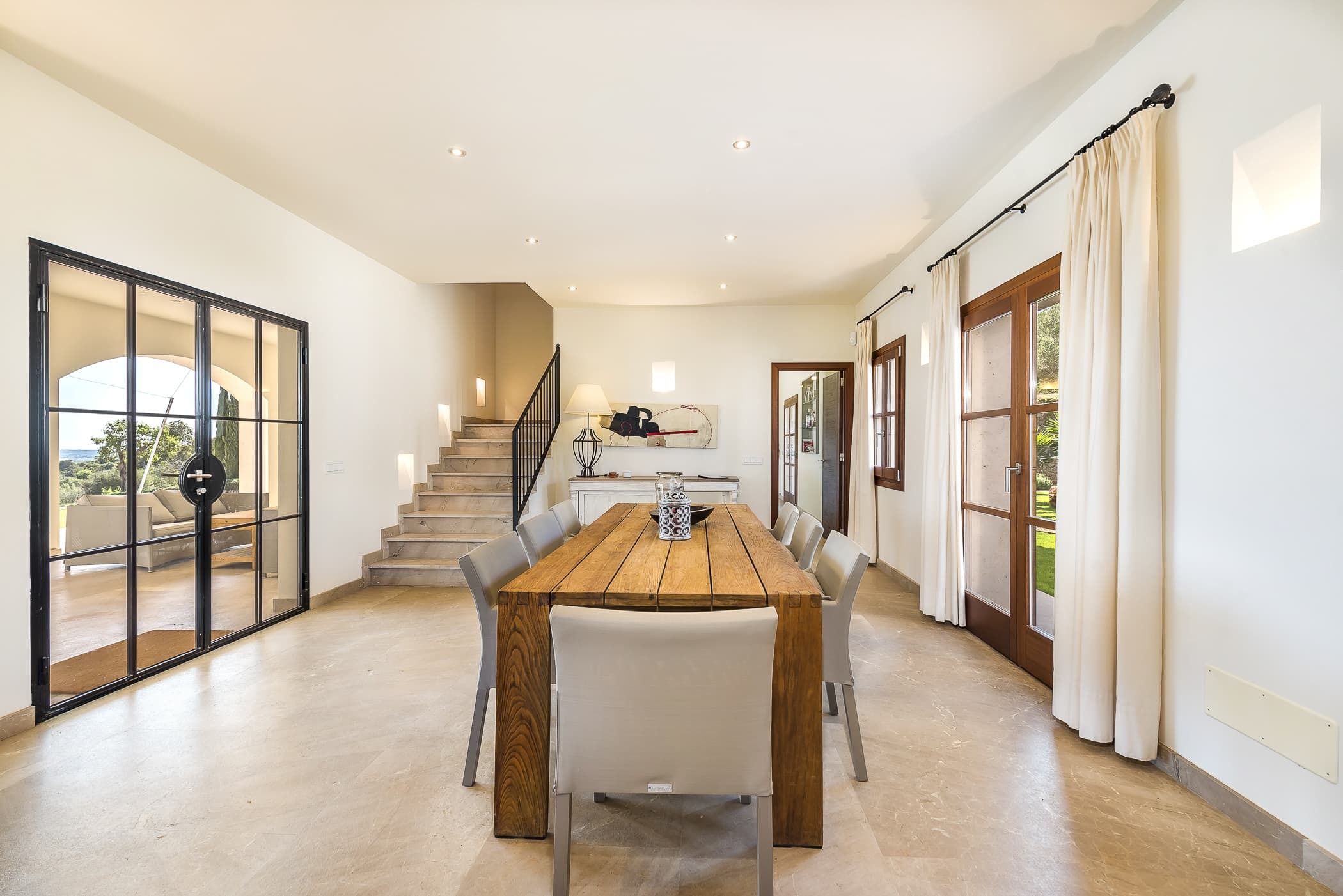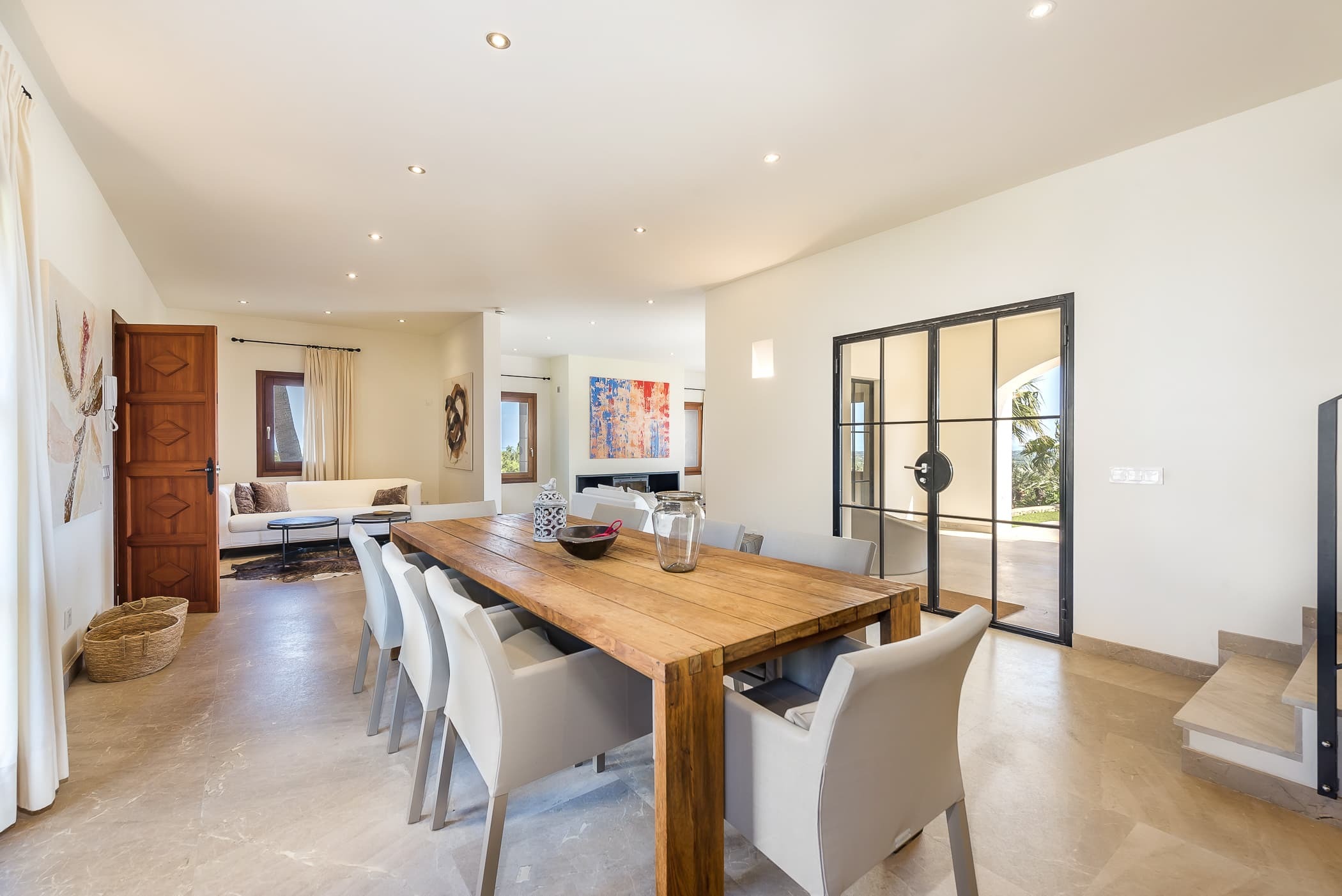 A fully equipped designer kitchen sits at the heart of the finca, ideal for both relaxed daily living and shared meals. Indoor dining flows effortlessly onto covered terraces, creating a natural setting for long lunches and evening gatherings with views stretching towards the sea.