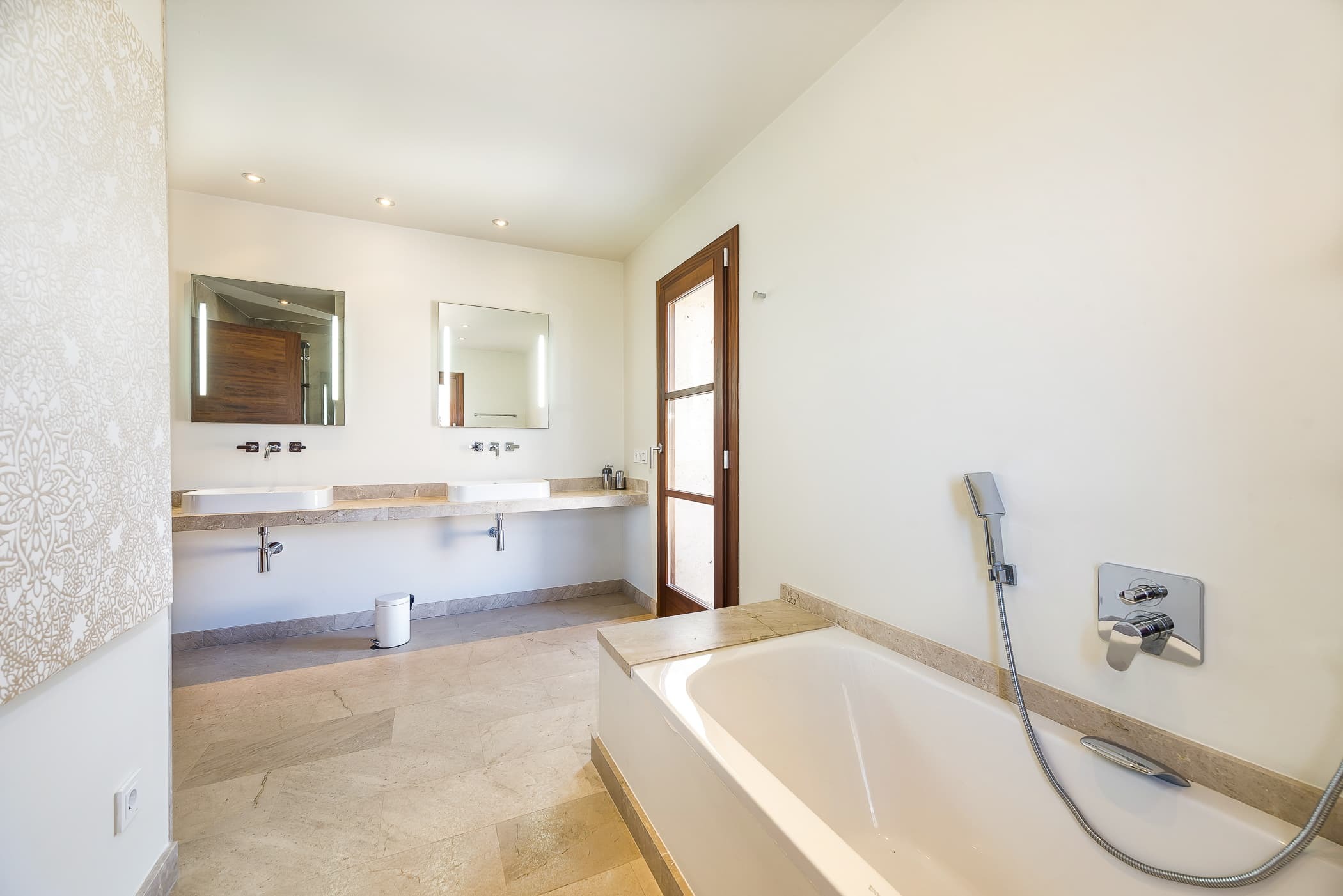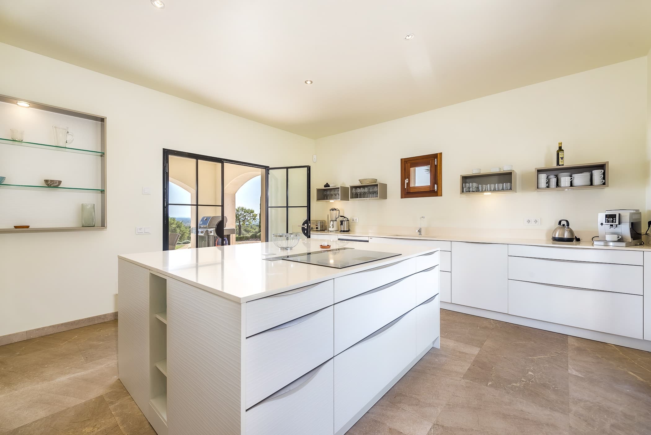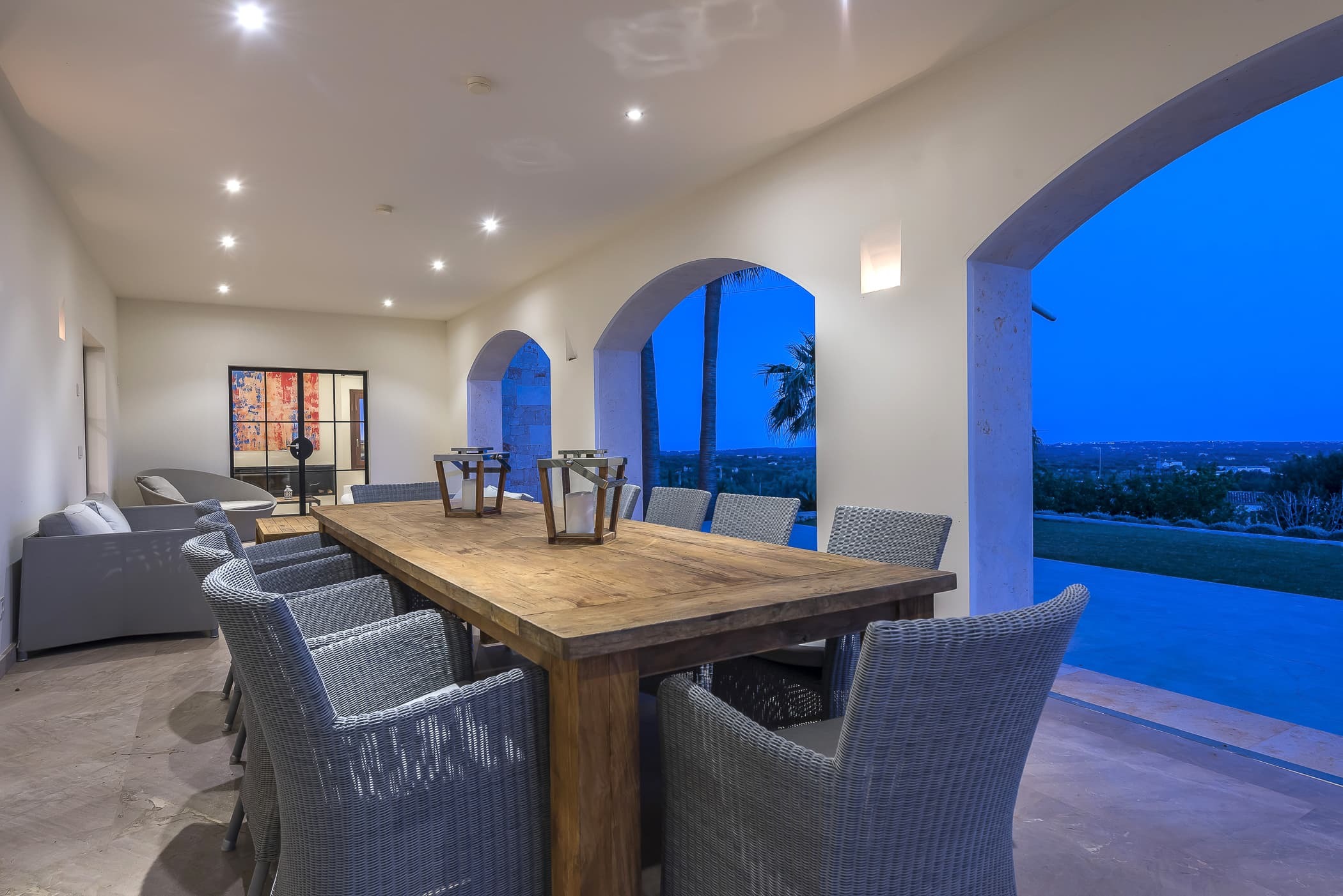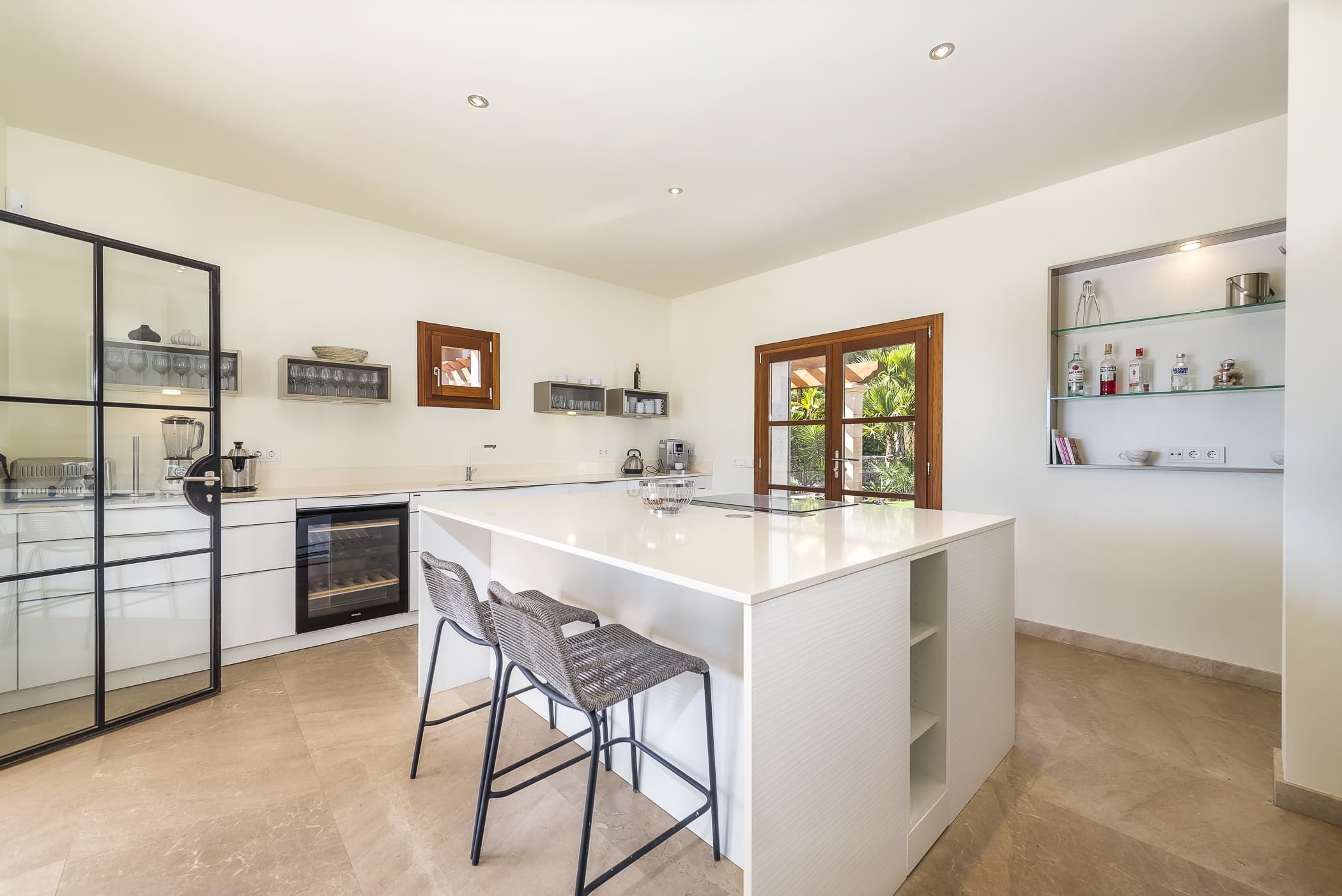 A fully equipped designer kitchen sits at the heart of the finca, ideal for both relaxed daily living and shared meals. Indoor dining flows effortlessly onto covered terraces, creating a natural setting for long lunches and evening gatherings with views stretching towards the sea.