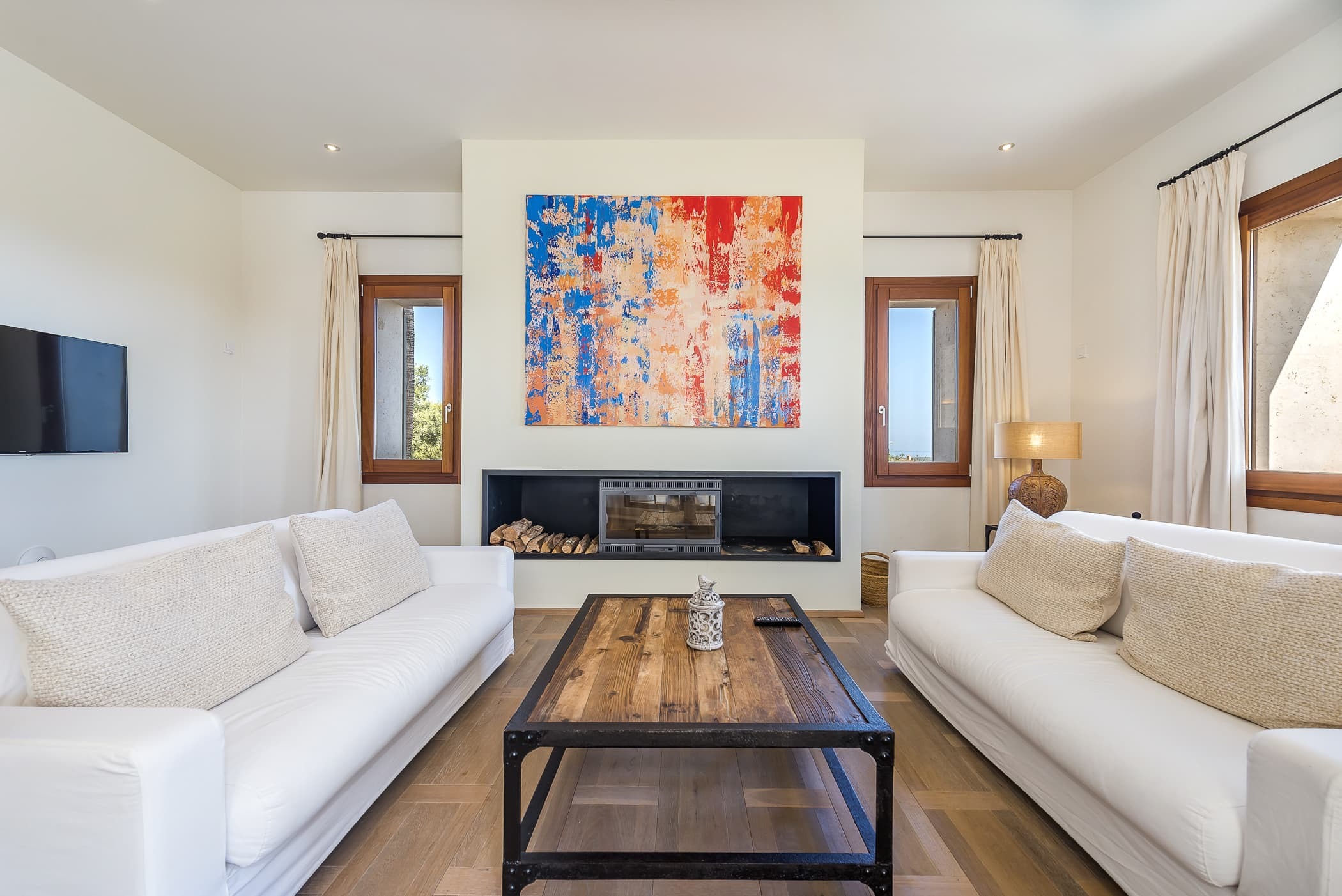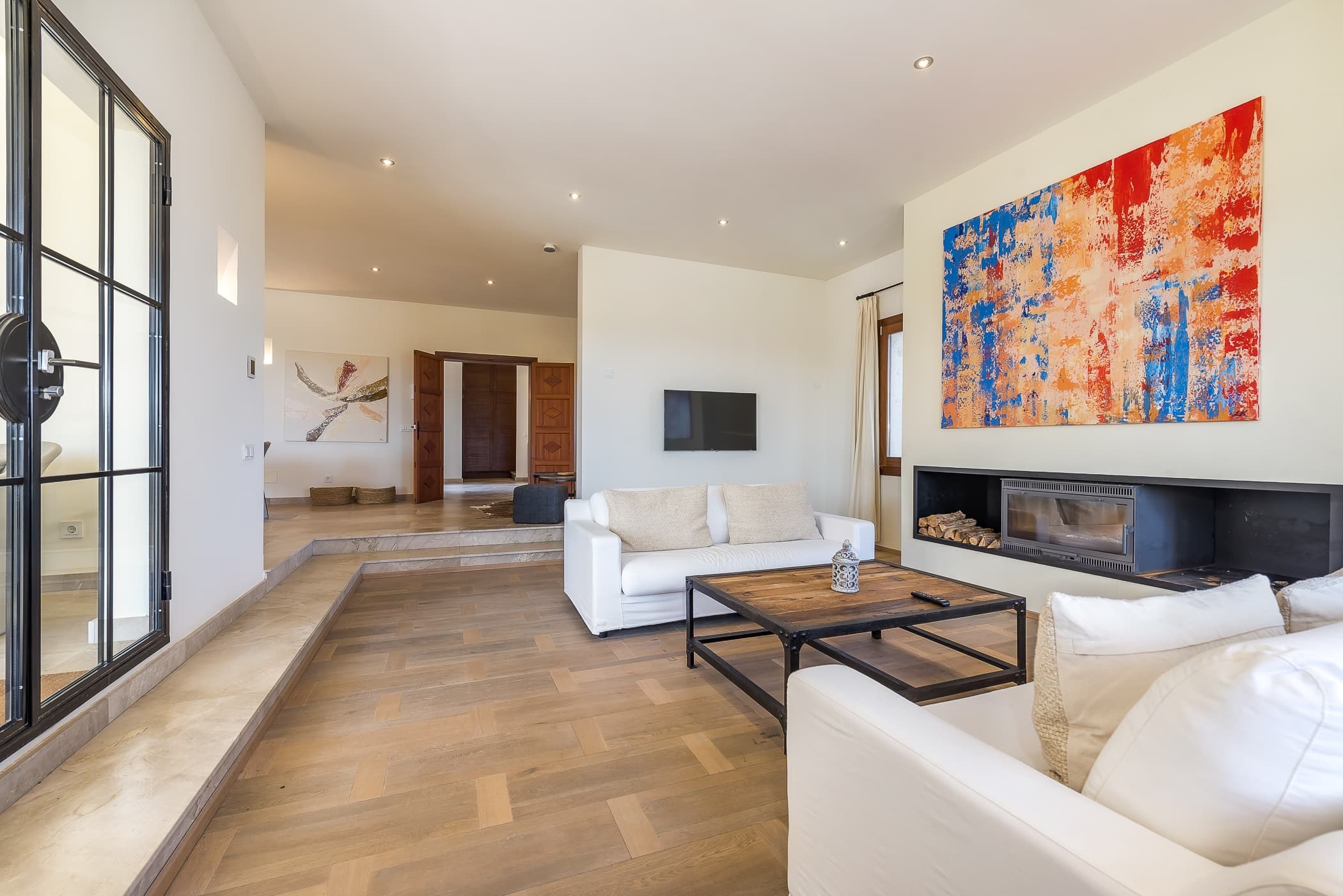 Expansive interiors unfold across 600 sqm, where light and space define the atmosphere. The main living area is both elegant and welcoming, centred around a fireplace and designed to flow seamlessly onto the surrounding terraces, allowing indoor and outdoor living to merge naturally.