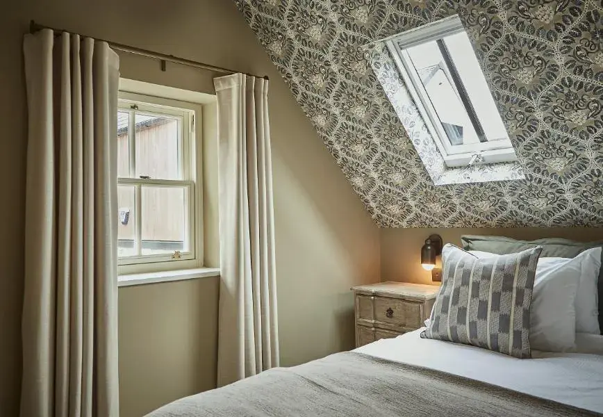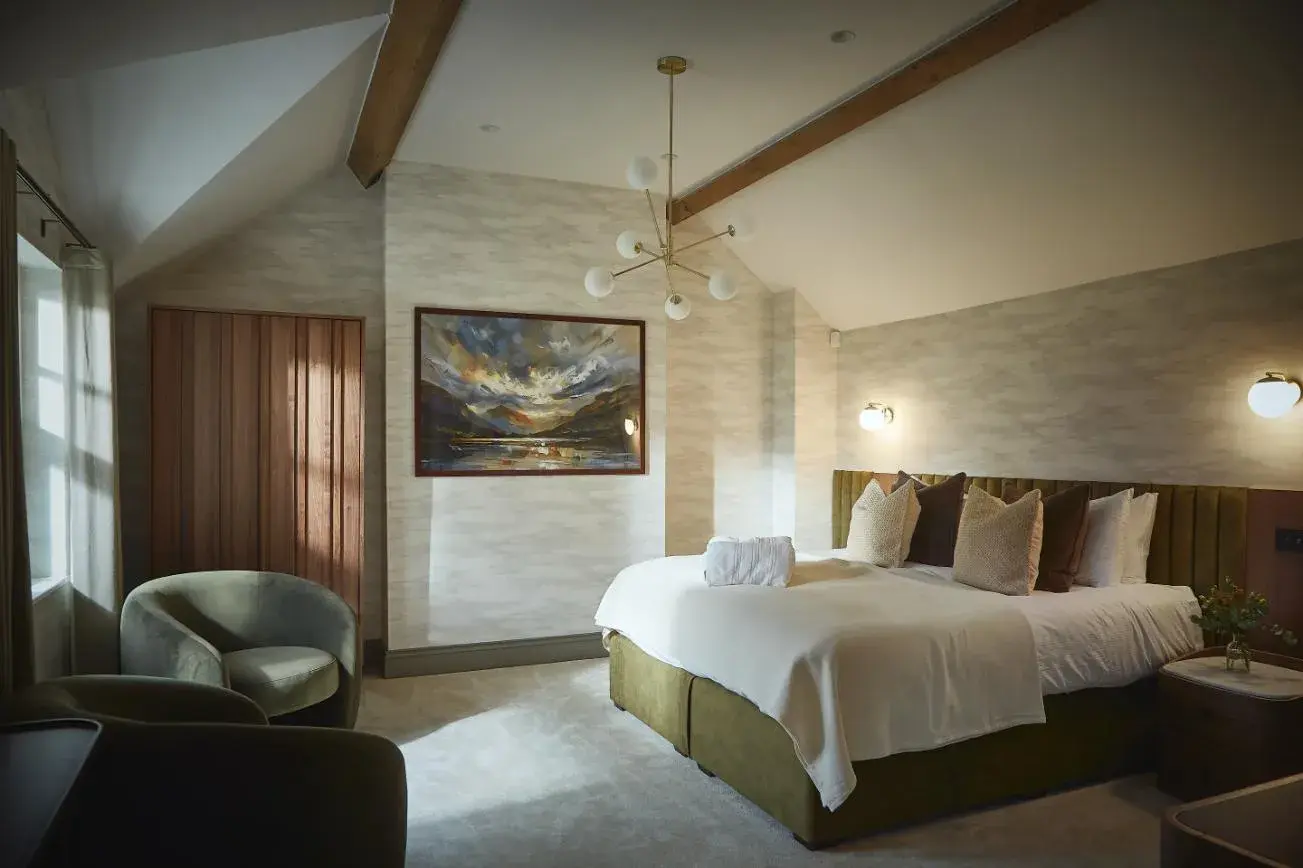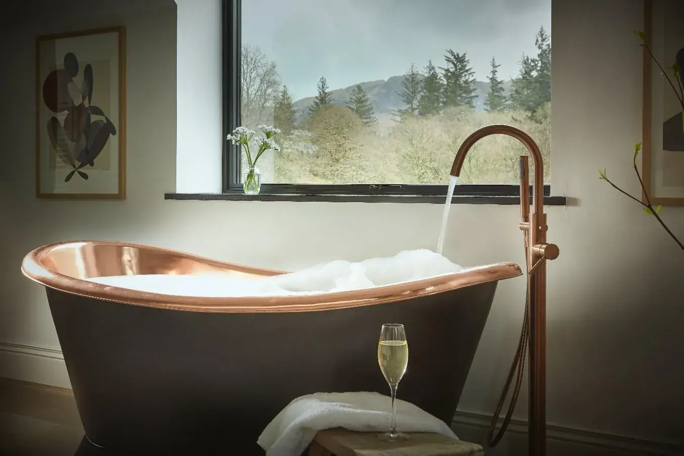 Skyfall sleeps up to sixteen guests across eight beautifully appointed ensuite bedrooms. Seven rooms offer super king beds that can be arranged as twins, making the house as suited to families as it is to groups of friends. One playful bunk room features adult-sized built-in bunks with its own ensuite, equally comfortable for children or grown-ups. Two bathrooms feature statement free-standing baths, one crafted in copper, the other in black, both designed for long, restorative soaks after a day on the fells. The Coach House provides a fully self-contained retreat with two deluxe super king bedrooms, a private kitchen and living area, ideal for couples, grandparents or those seeking additional privacy. Practical comforts are thoughtfully considered, from a dedicated laundry room with washing machine and tumble dryer to an Alpine-style boot room with heated boot warmers. Secure storage for up to fourteen bikes and dedicated washing facilities make Skyfall especially welcoming for cyclists and outdoor enthusiasts.