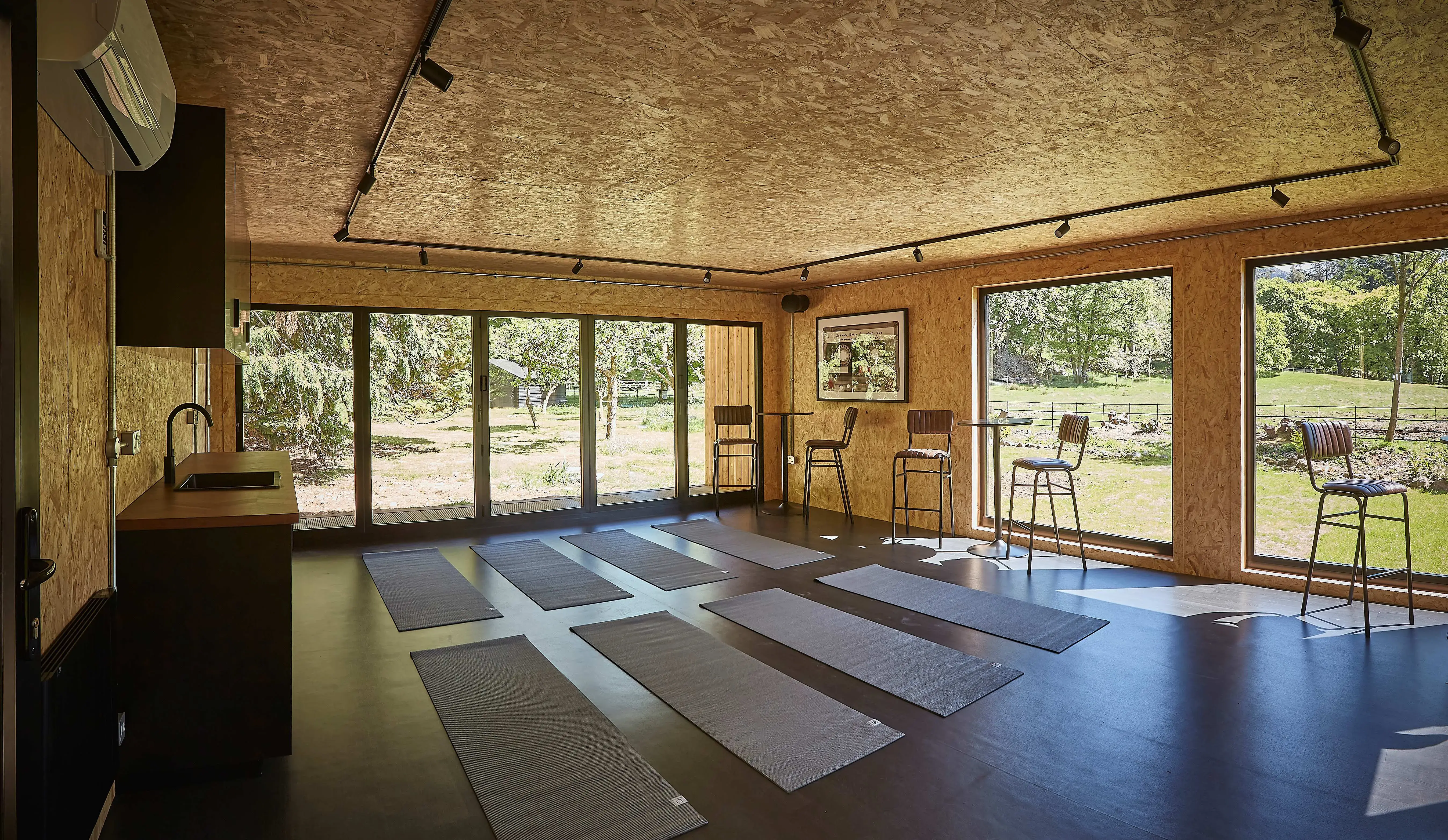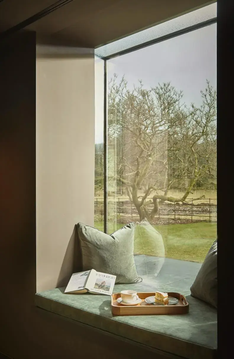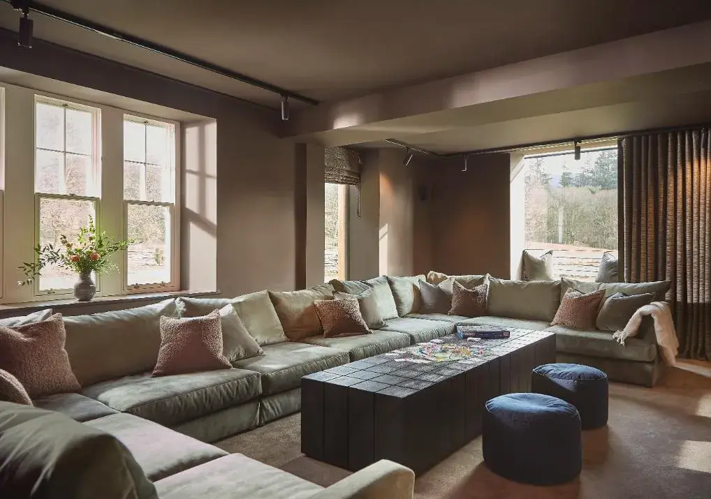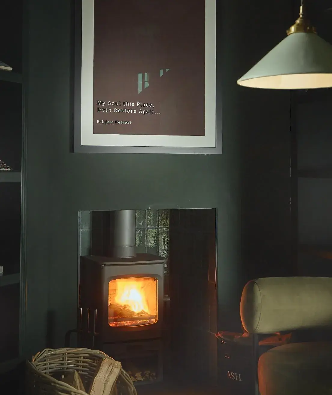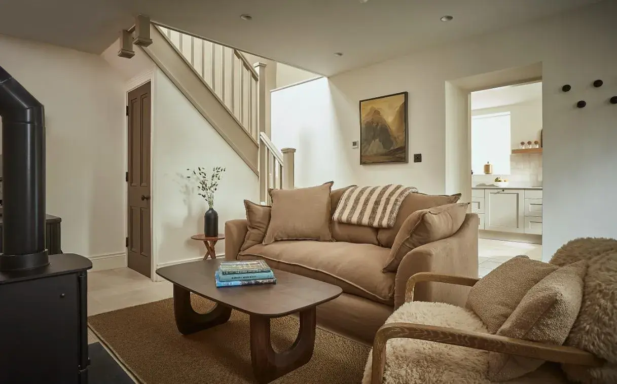 At the heart of Skyfall lies an expansive open-plan living space, framed by wide glass bifold doors that open to uninterrupted views of the meadow, the River Esk and the surrounding fells. Light floods in throughout the day, shifting gently with the landscape. A double-sided log burner anchors the room, bringing warmth and atmosphere to both the lounge and dining areas. Soft textures, natural materials and calm Scandinavian tones create an interior that feels both grounded and refined. Beyond the main living space, a cosy library snug offers a quieter retreat, perfect for reading or evening drinks. The private cinema room invites indulgent film nights, while the tranquil Zen Den garden room provides a serene space for yoga, Pilates or quiet reflection. In the adjacent Coach House, a private lounge with its own log burner creates an intimate hideaway within the estate.