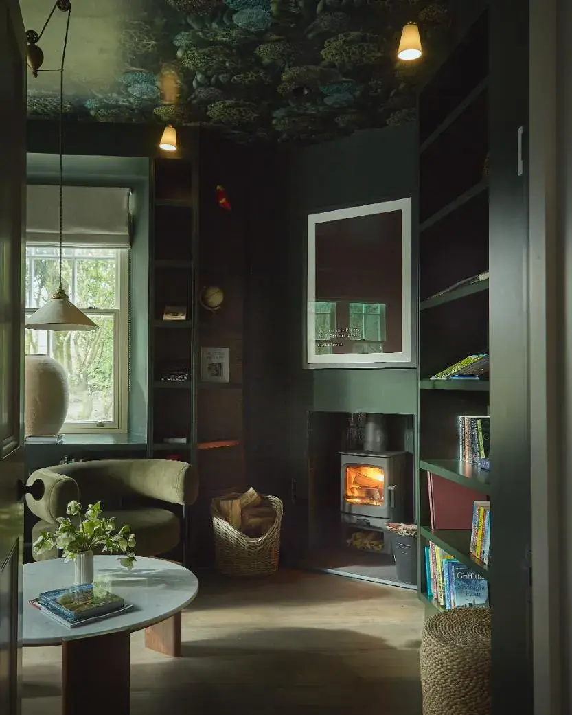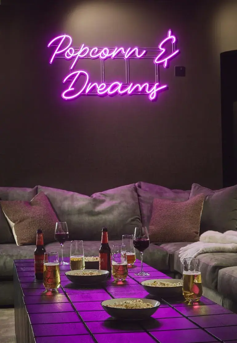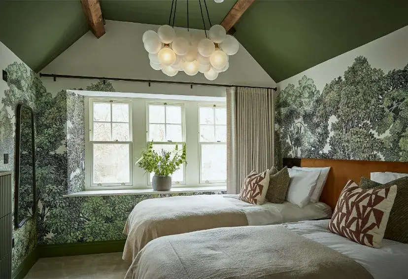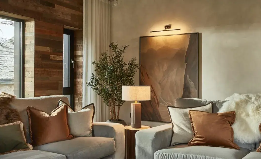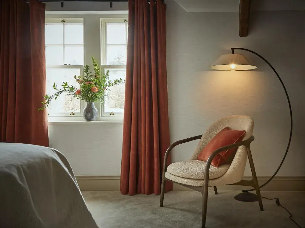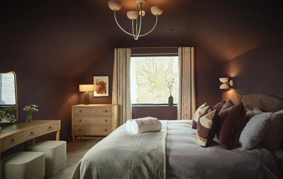 At the heart of Skyfall lies an expansive open-plan living space, framed by wide glass bifold doors that open to uninterrupted views of the meadow, the River Esk and the surrounding fells. Light floods in throughout the day, shifting gently with the landscape. A double-sided log burner anchors the room, bringing warmth and atmosphere to both the lounge and dining areas. Soft textures, natural materials and calm Scandinavian tones create an interior that feels both grounded and refined. Beyond the main living space, a cosy library snug offers a quieter retreat, perfect for reading or evening drinks. The private cinema room invites indulgent film nights, while the tranquil Zen Den garden room provides a serene space for yoga, Pilates or quiet reflection. In the adjacent Coach House, a private lounge with its own log burner creates an intimate hideaway within the estate.