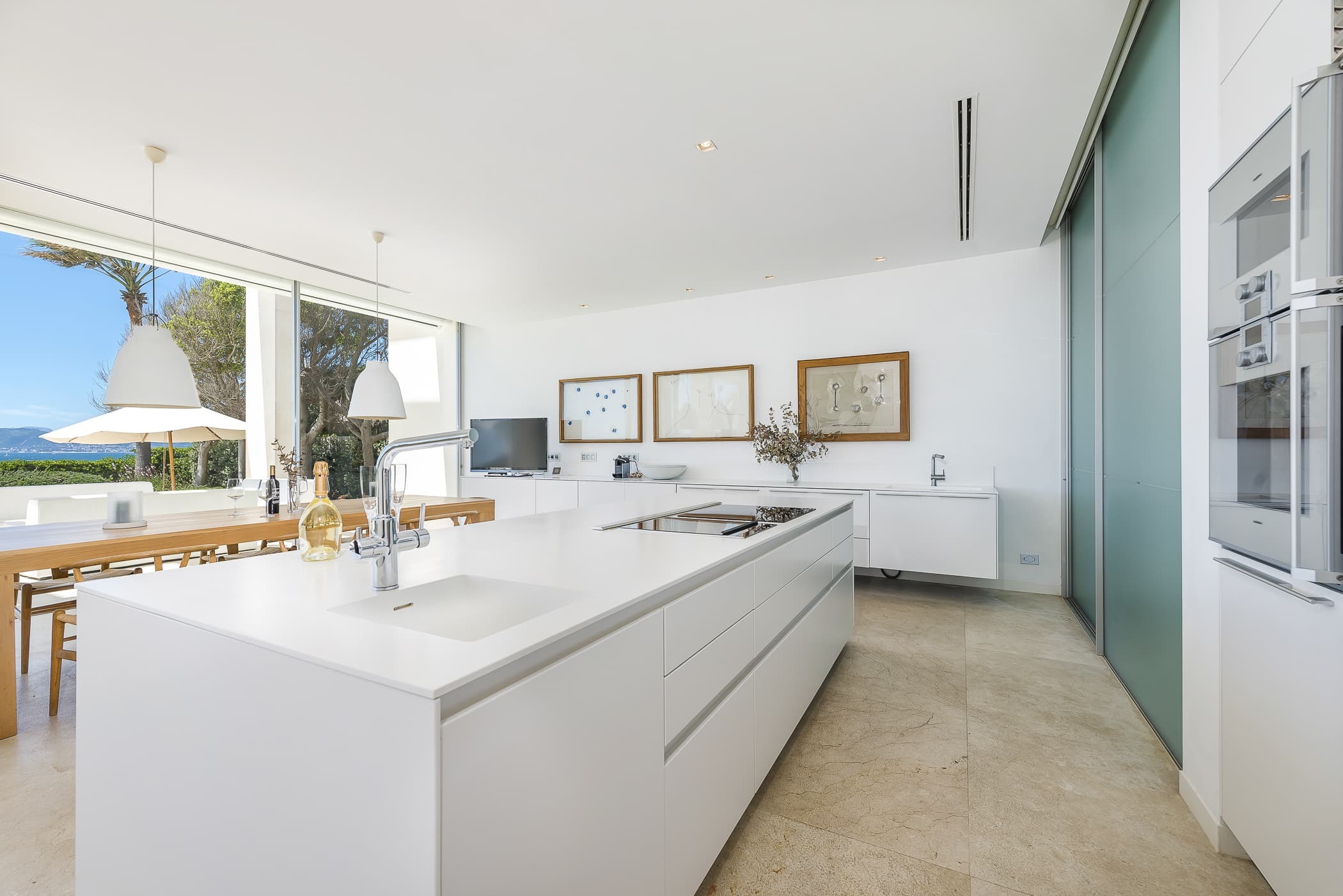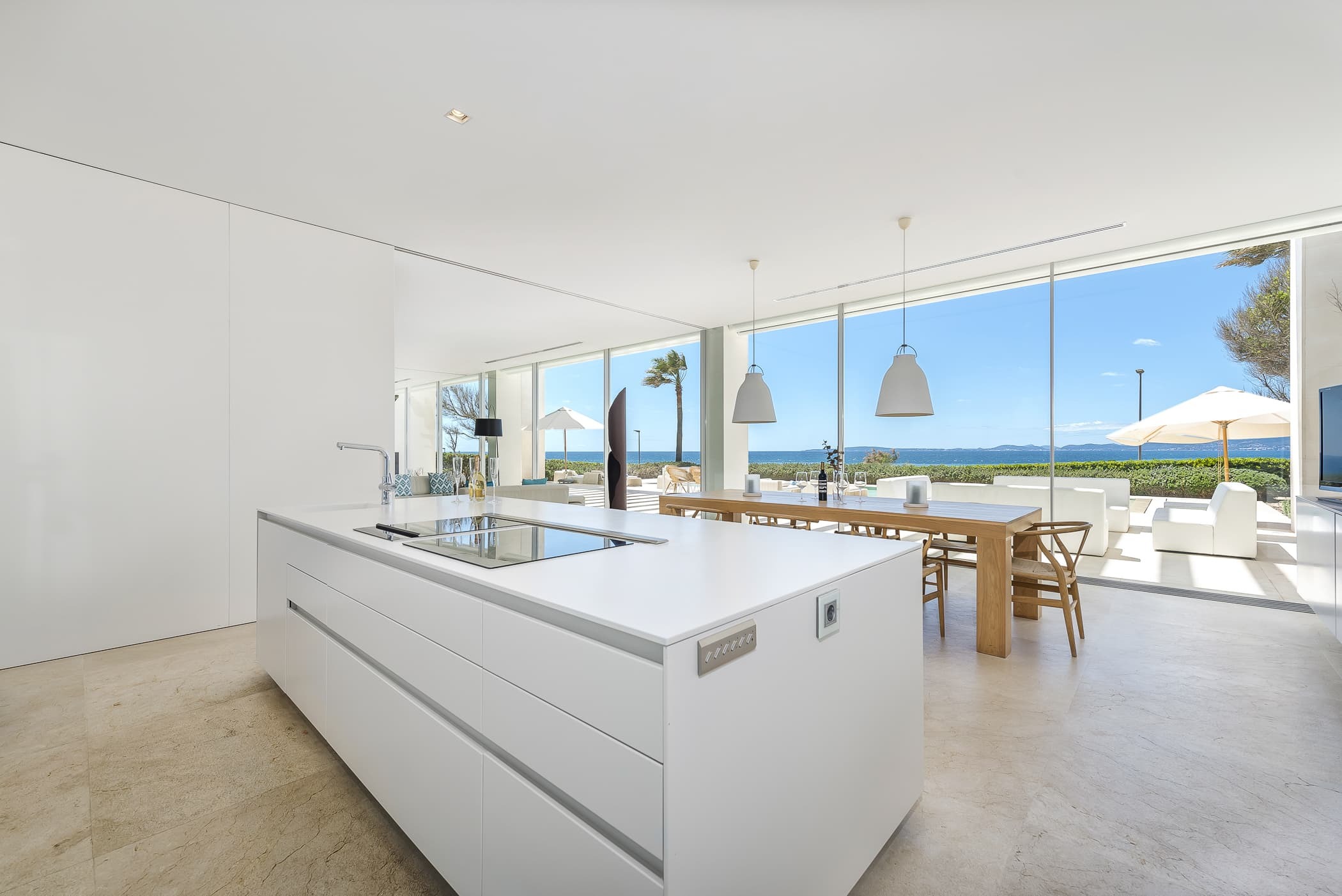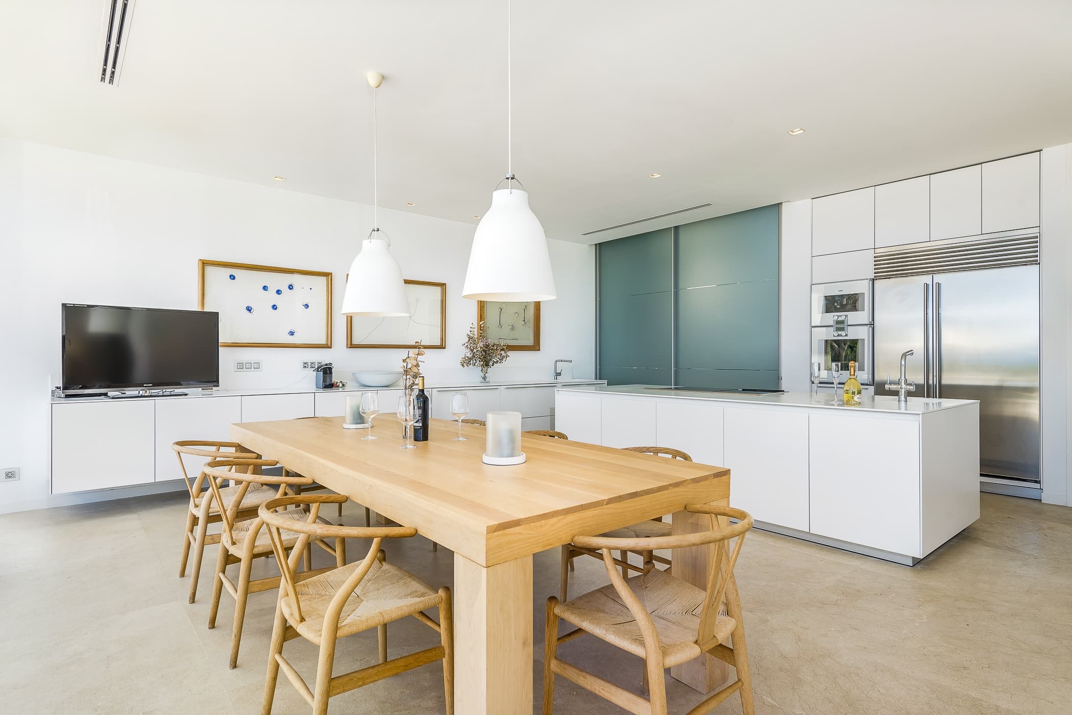 A well-appointed modern kitchen sits at the heart of the villa, flowing naturally into the dining and living spaces. Indoor and outdoor dining areas allow meals to unfold effortlessly throughout the day, from slow breakfasts to sunset suppers overlooking the sea.