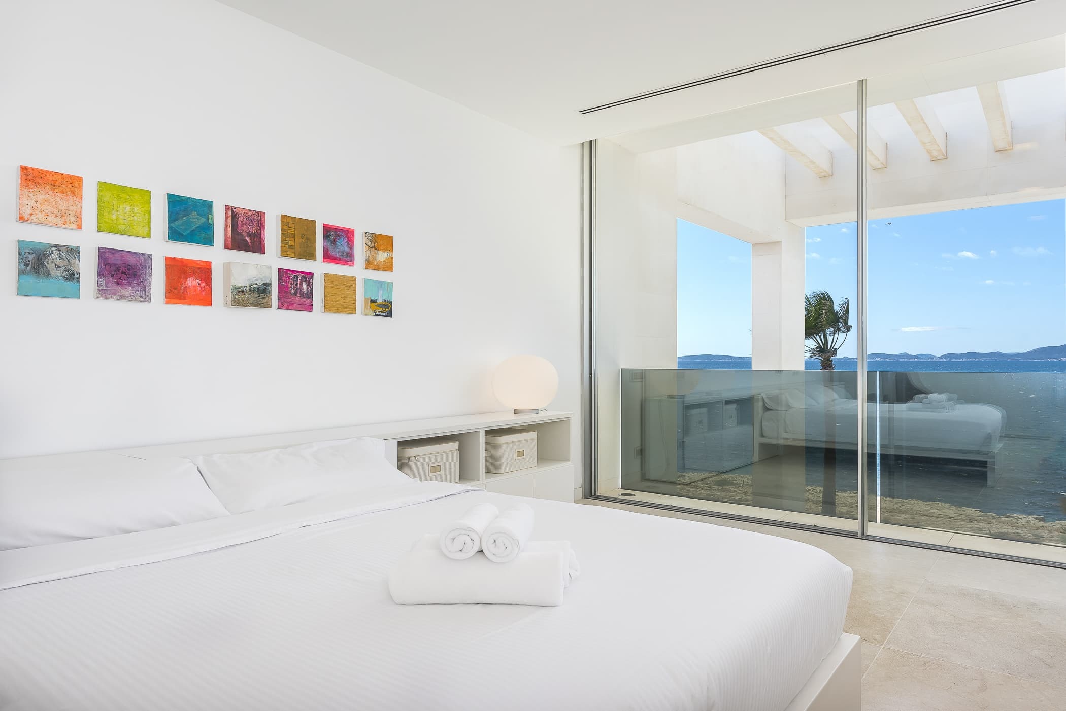 From the moment you arrive, the setting takes centre stage. Positioned along the rocky shoreline of Son Verí Nou, the villa enjoys open, panoramic views that stretch endlessly across the water, with the changing tones of the sea becoming part of daily life.