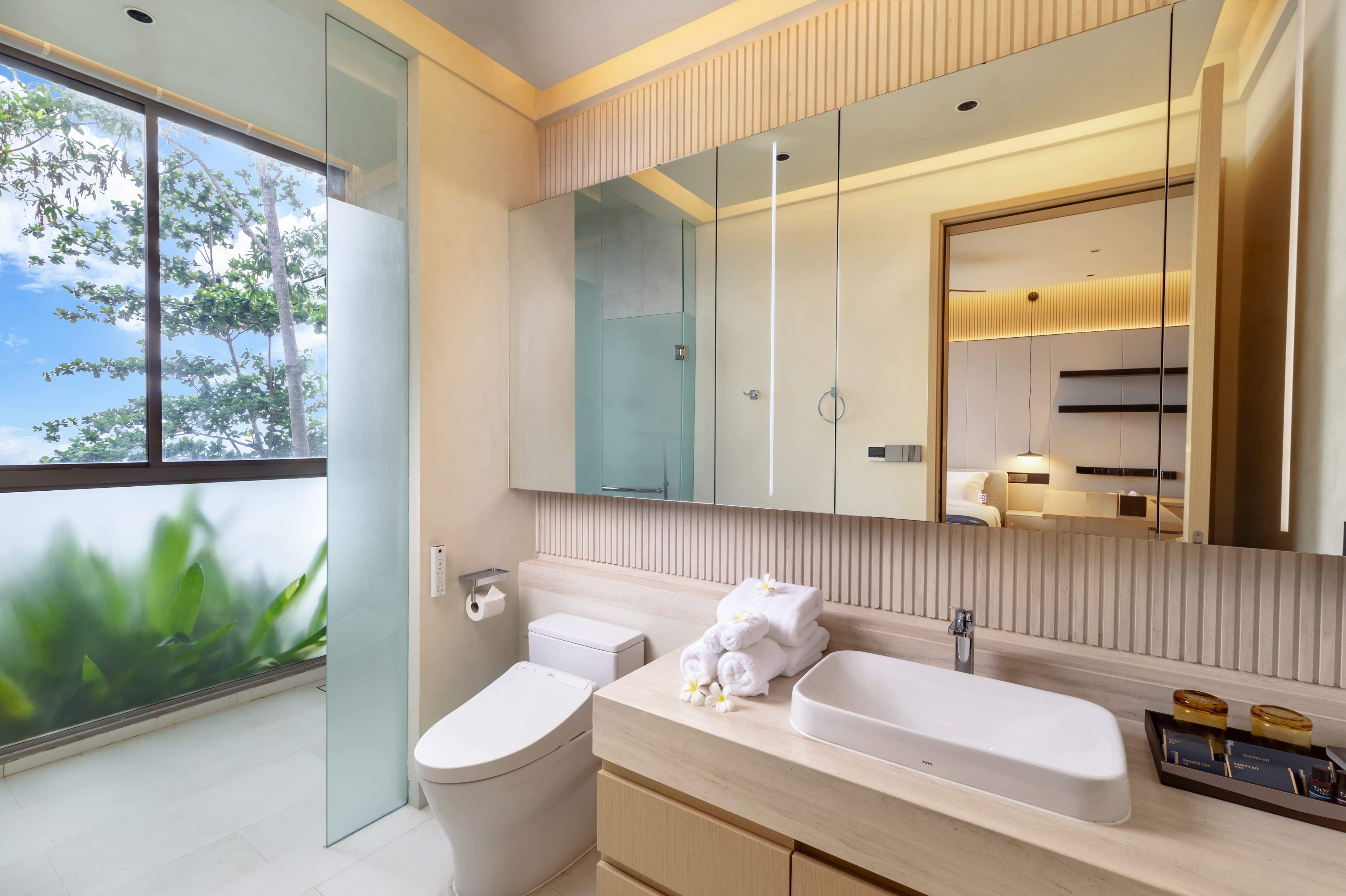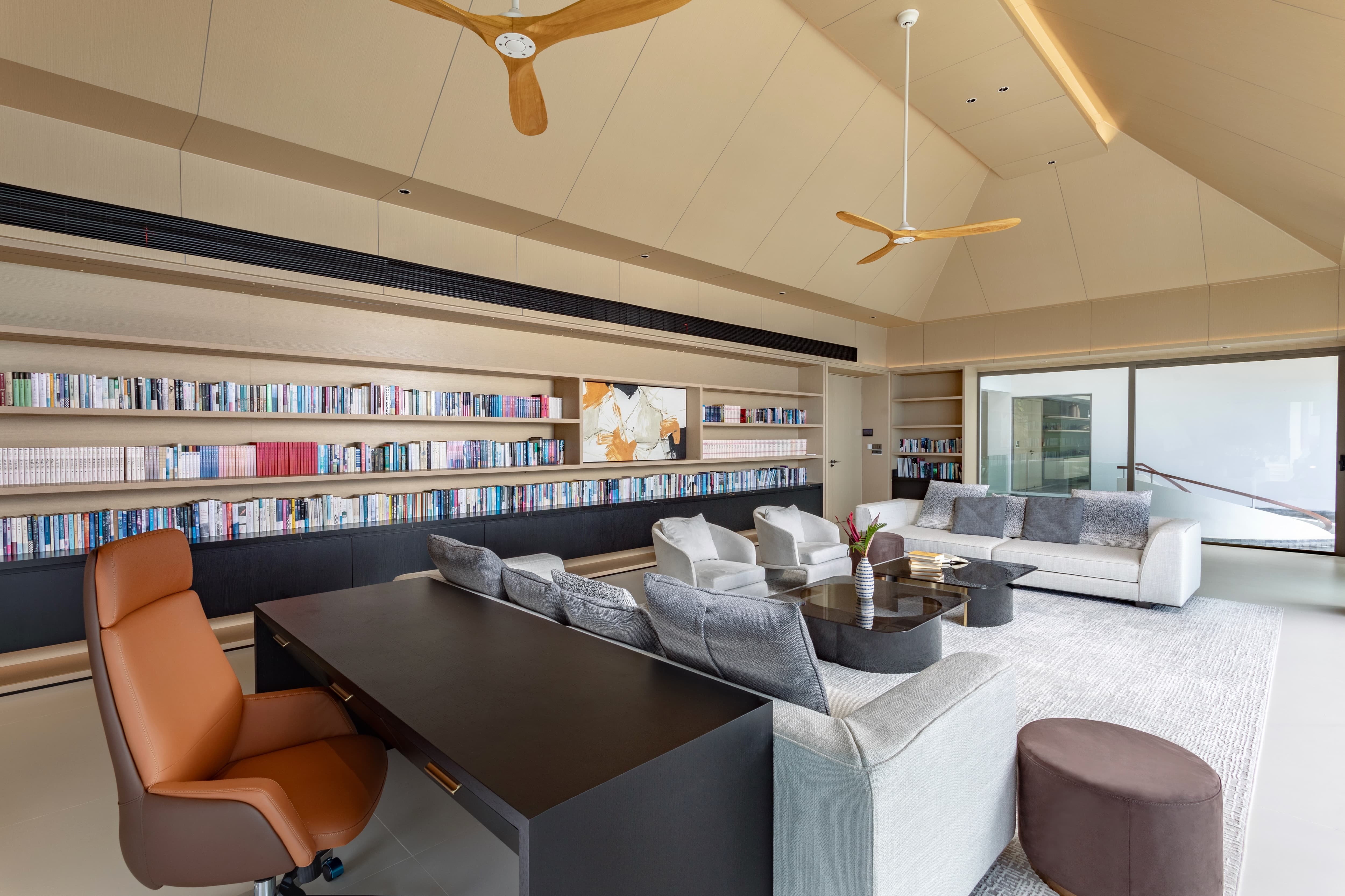 The villa is fully air-conditioned, maintaining comfort throughout the tropical climate. Wide glass openings allow for natural ventilation when preferred, balancing contemporary climate control with sea breezes and open-air living.