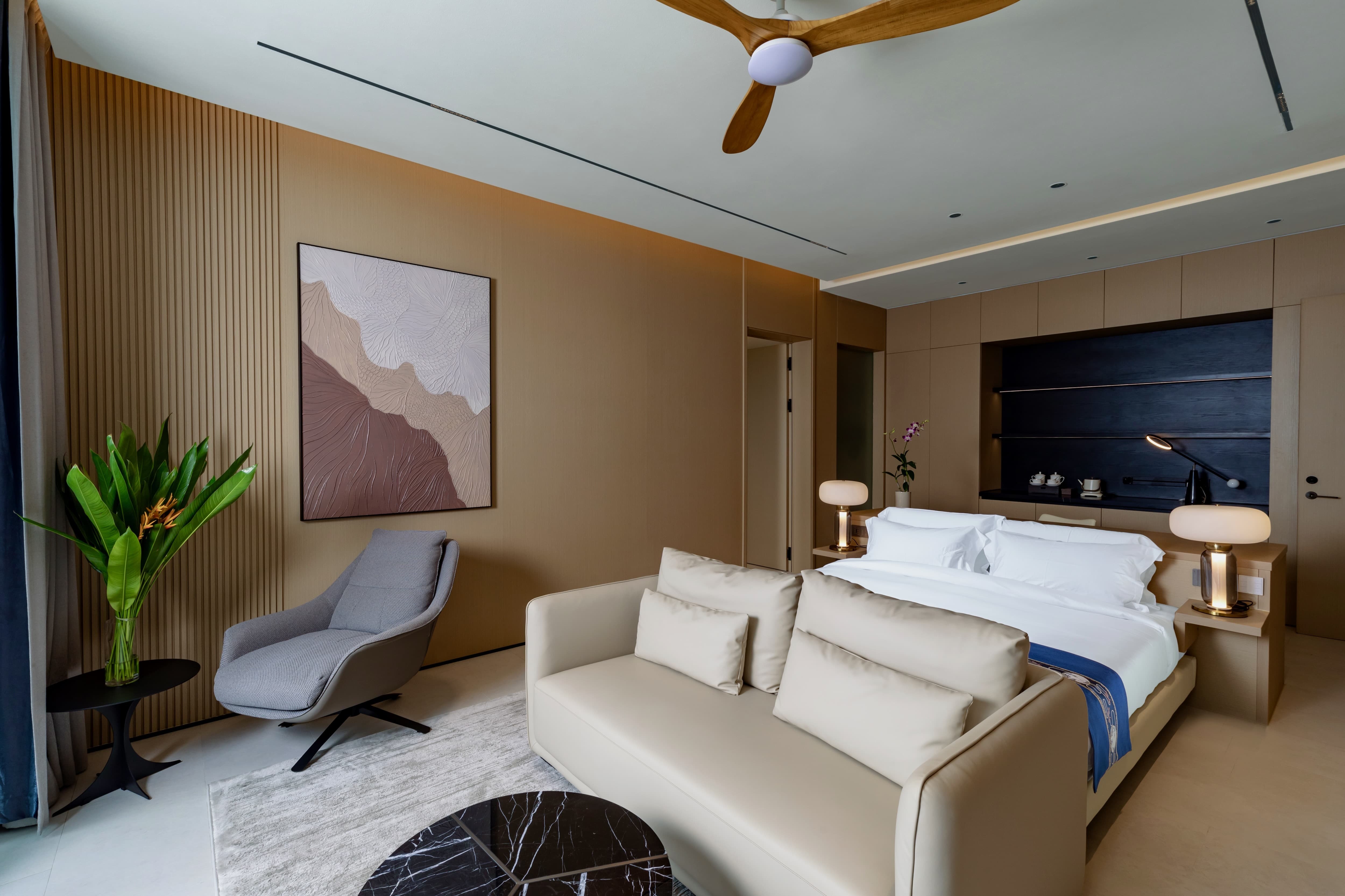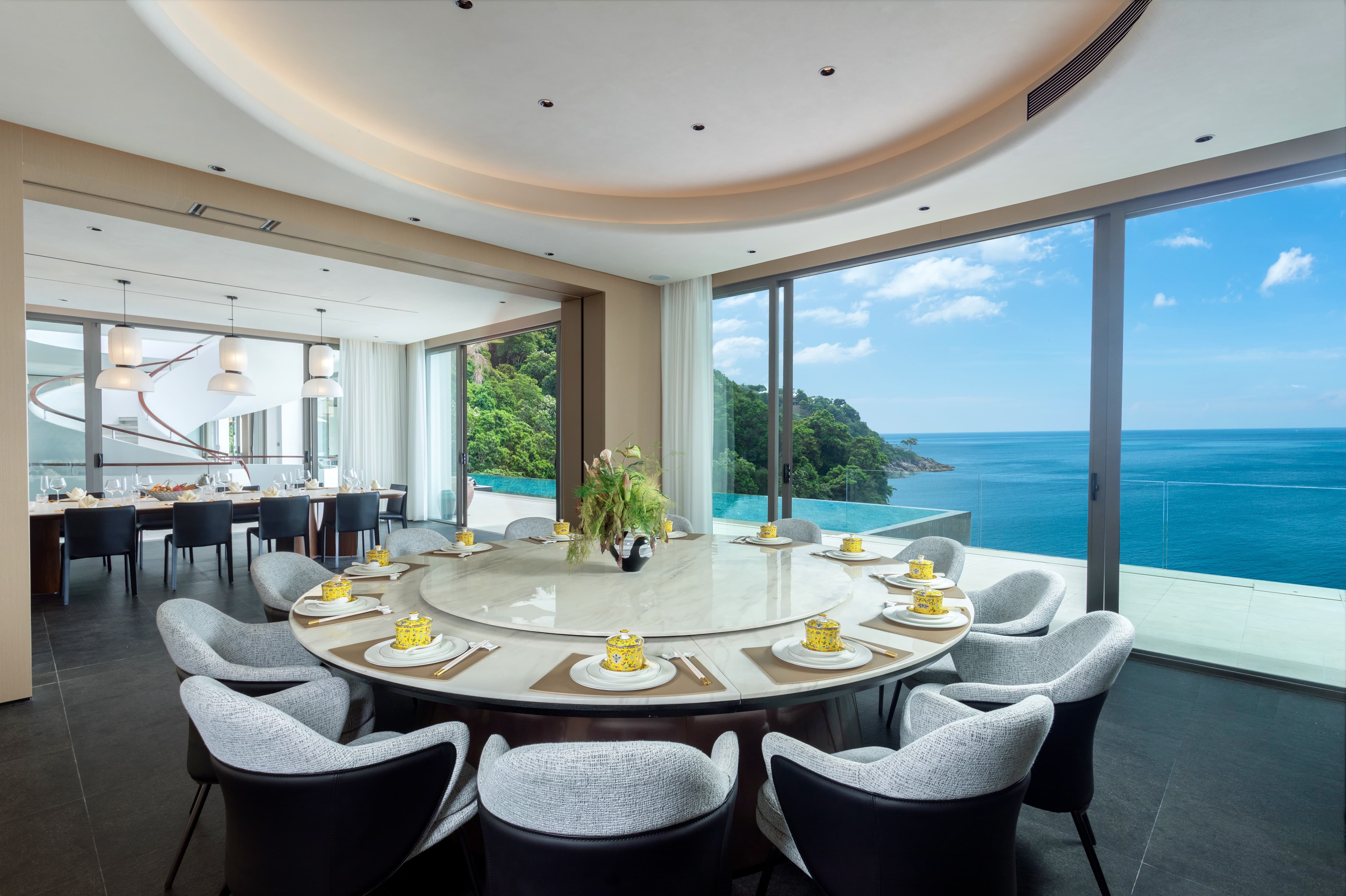 Arranged across five expansive levels, The Aquila Villa is defined by volume, light and uninterrupted ocean vistas. Vast open-plan living areas unfold beneath high ceilings, where glass walls frame the Andaman Sea as a living artwork. The architecture allows each level to feel both connected and private, offering spaces for grand gatherings as well as quiet retreat. Indoor lounges flow seamlessly onto panoramic terraces, where sea breezes soften the tropical air. The atmosphere is sophisticated yet welcoming, designed for meaningful celebrations, relaxed afternoons and evenings that stretch effortlessly into the night.