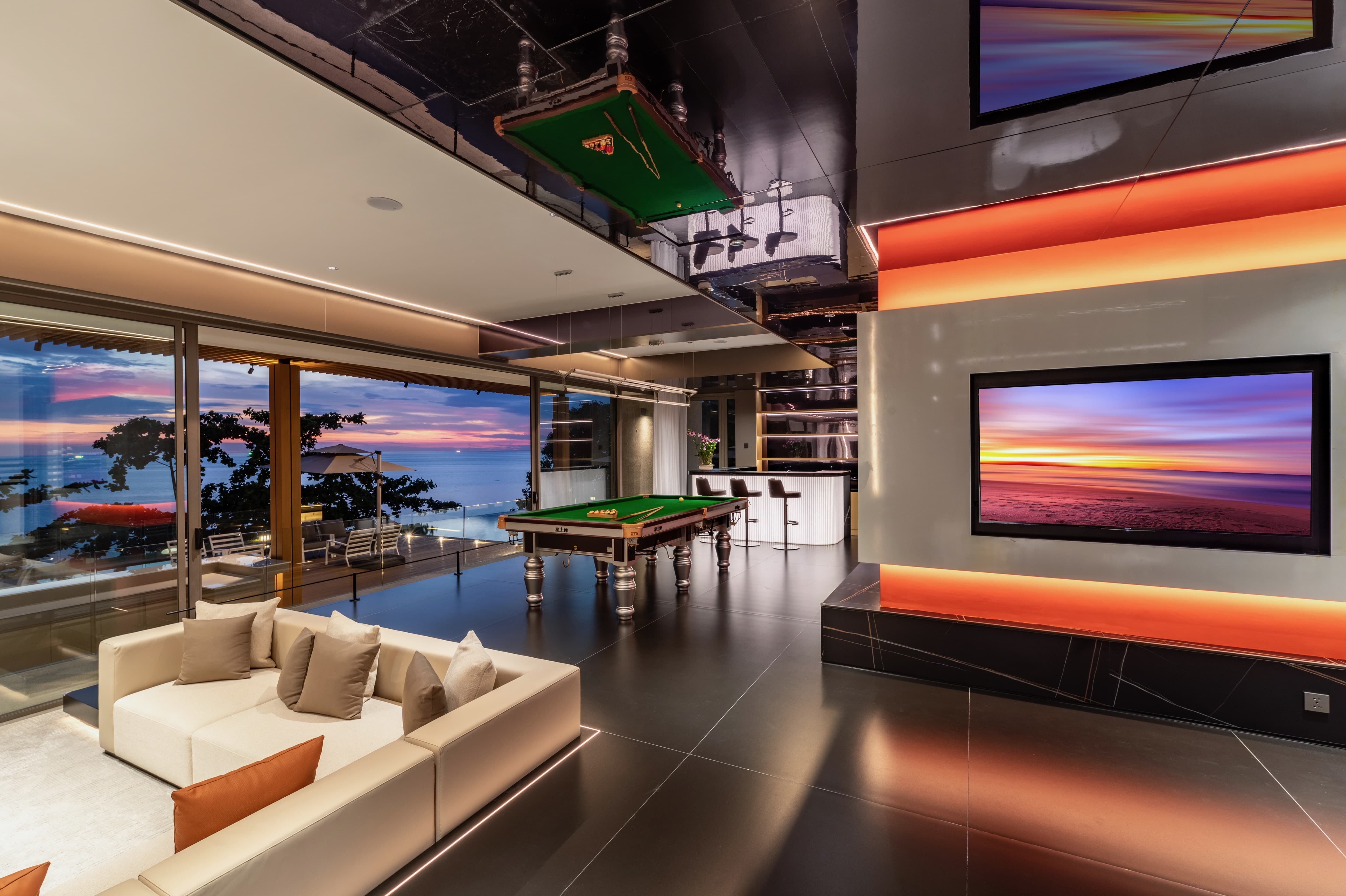 Leisure is woven seamlessly into the fabric of The Aquila. Two infinity pools, one stretching 26 metres along the main level and a second lower-level pool, appear to merge with the horizon. A private cinema room provides an intimate screening experience, while the entertainment lounge and wet bar encourage relaxed social evenings. A state-of-the-art gym and private spa support wellness routines, while a billiards table, library and multiple lounges ensure there is always space to gather or retreat. Seventeen flat-screen televisions are distributed throughout the villa, allowing for both connection and privacy.