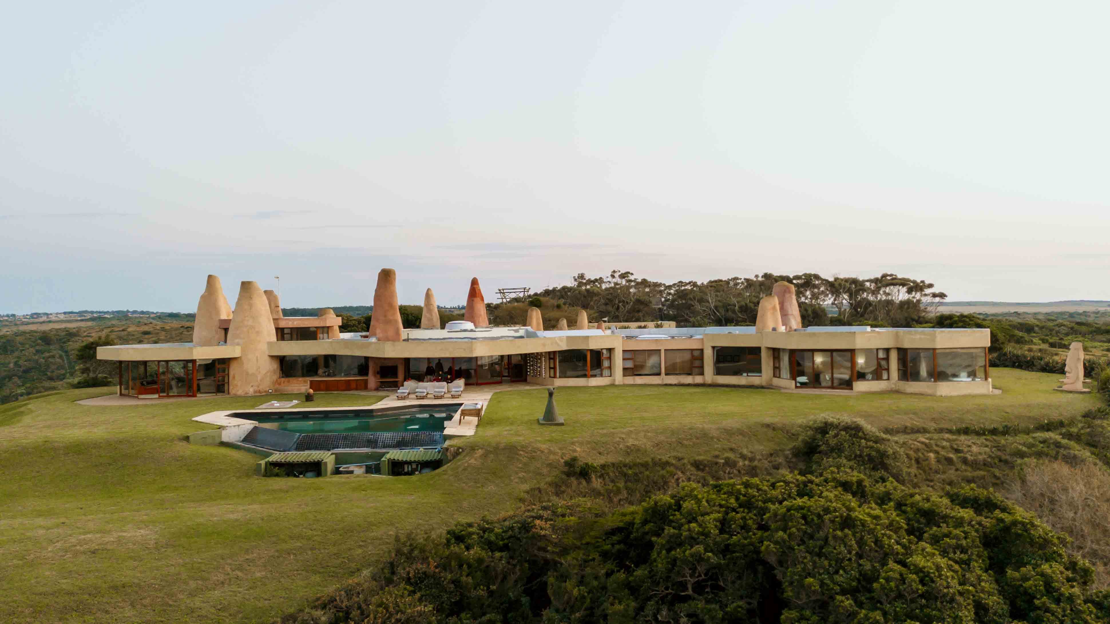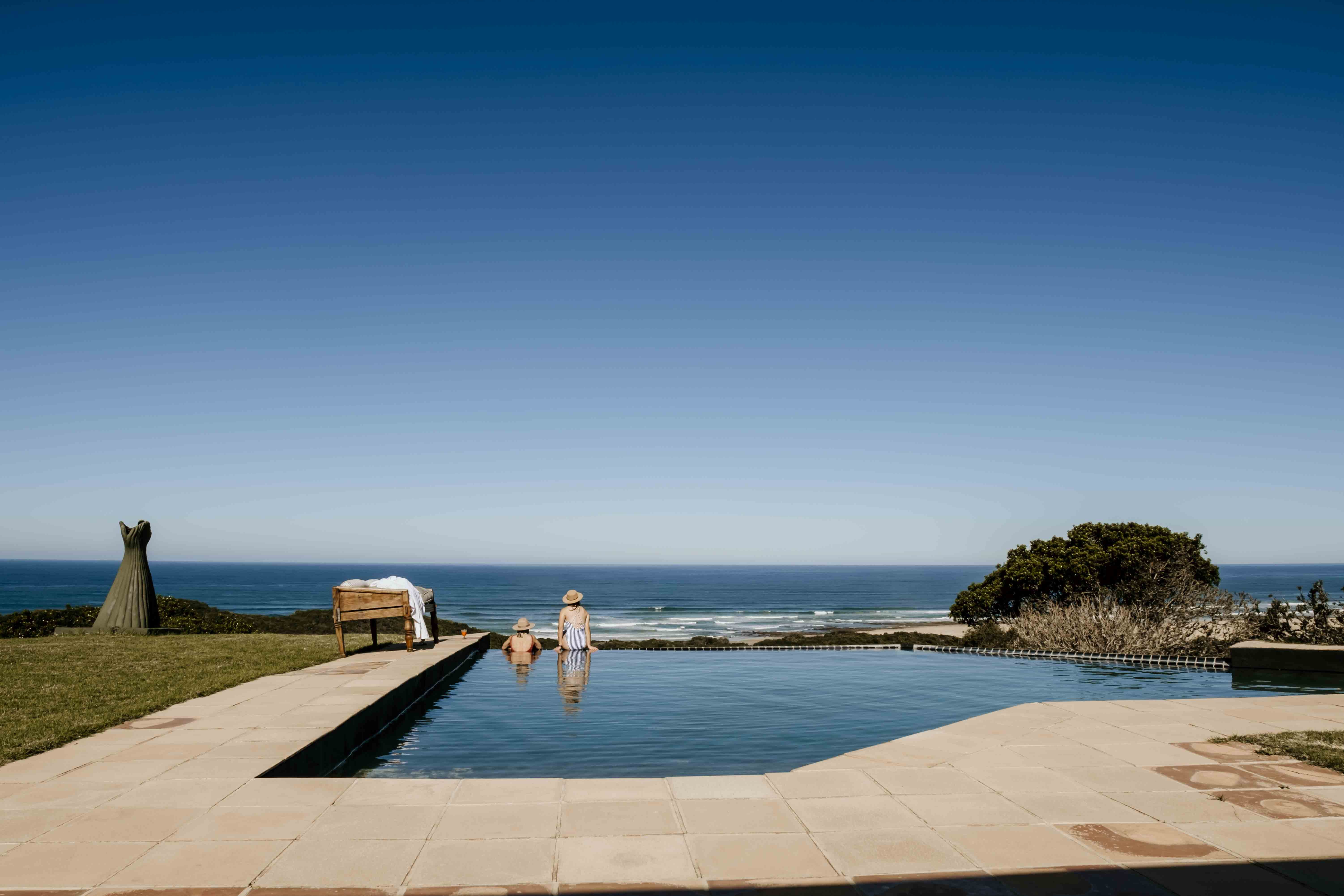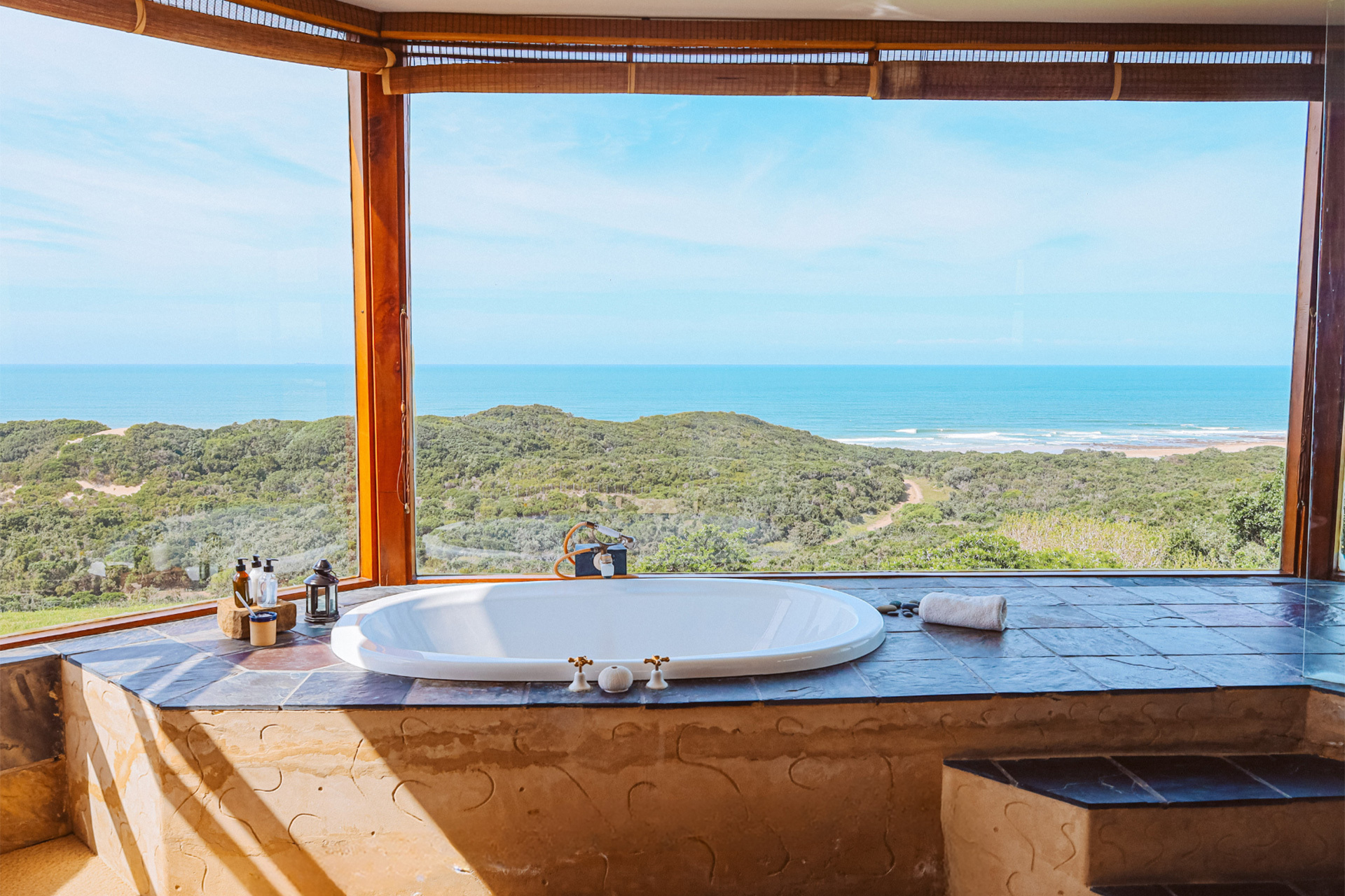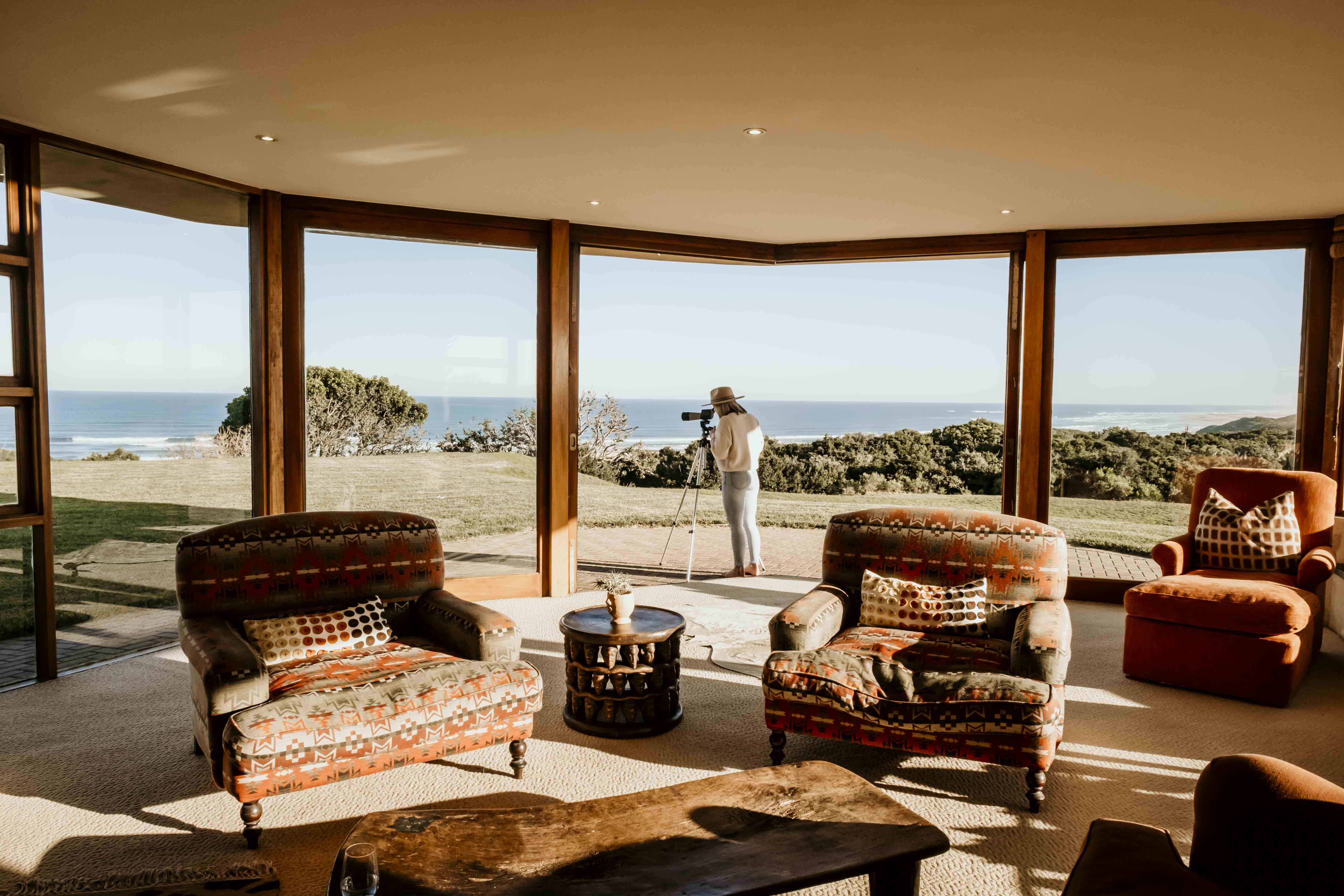 The villa is located in the Eastern Cape, set within 680 acres of private coastal forest and offering 2 km of privately accessed beachfront with uninterrupted views of the Indian Ocean