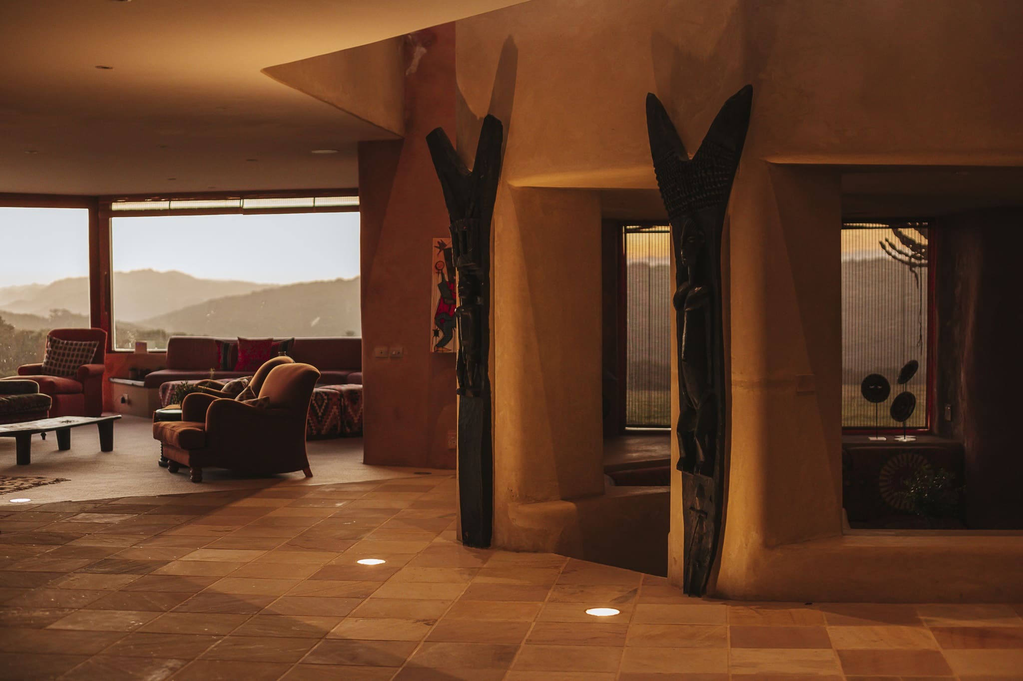 The villa offers multiple expansive living areas spread across a sculptural, organic layout. Shared spaces include a dramatic 270° ocean-facing lounge, a separate sunken lounge, a TV room, and open-air courtyards that connect the villa seamlessly to its coastal surroundings.