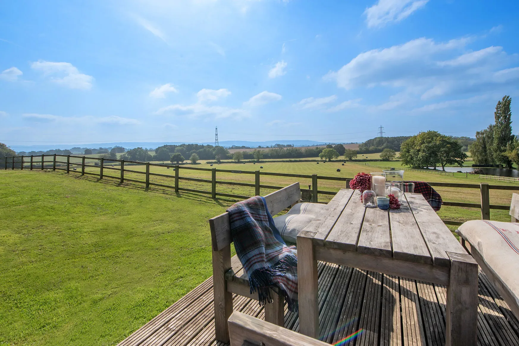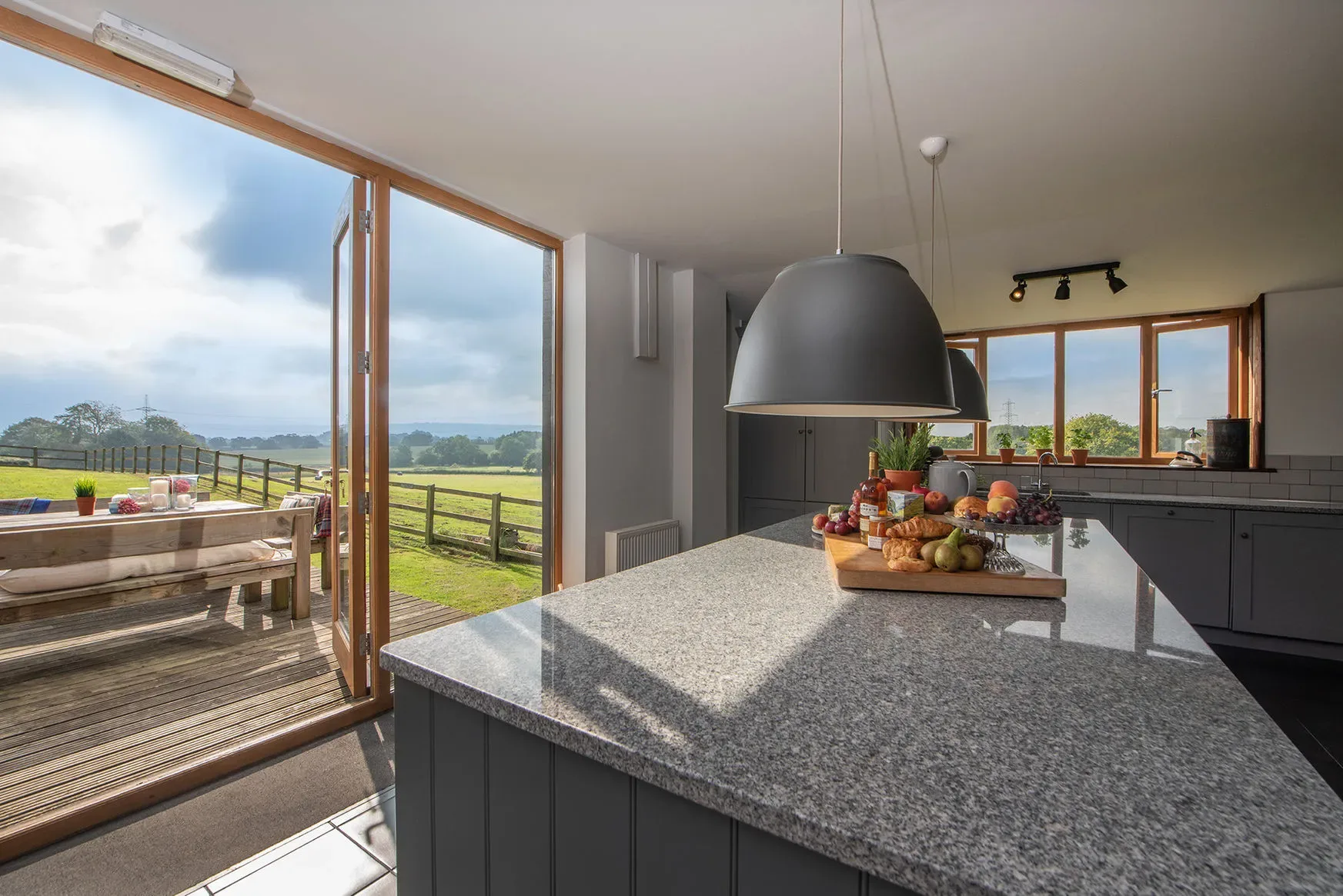 Outdoor amenities include a large decked area, private garden, huge covered picnic and barbecue area, sun loungers, and sensational countryside views. A fire pit can be provided on request.