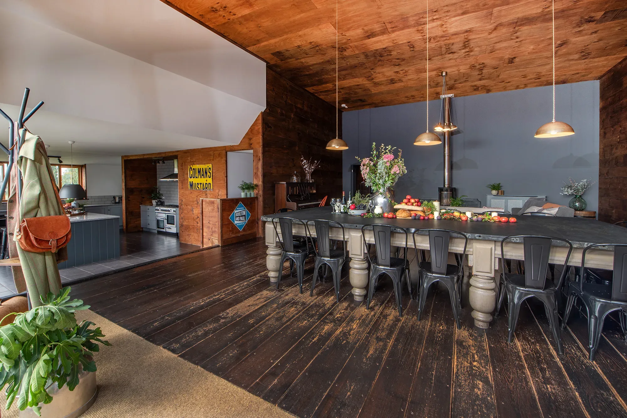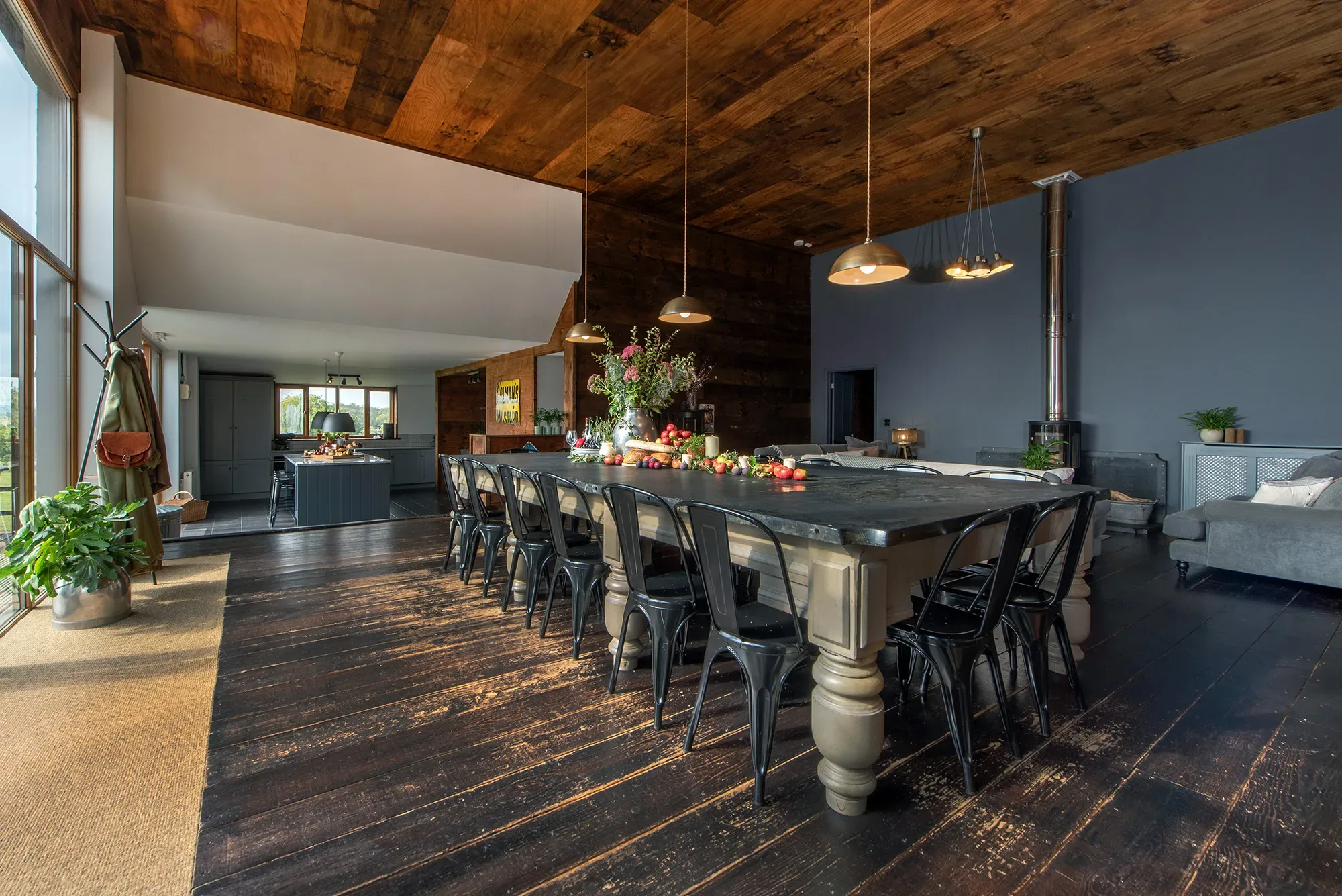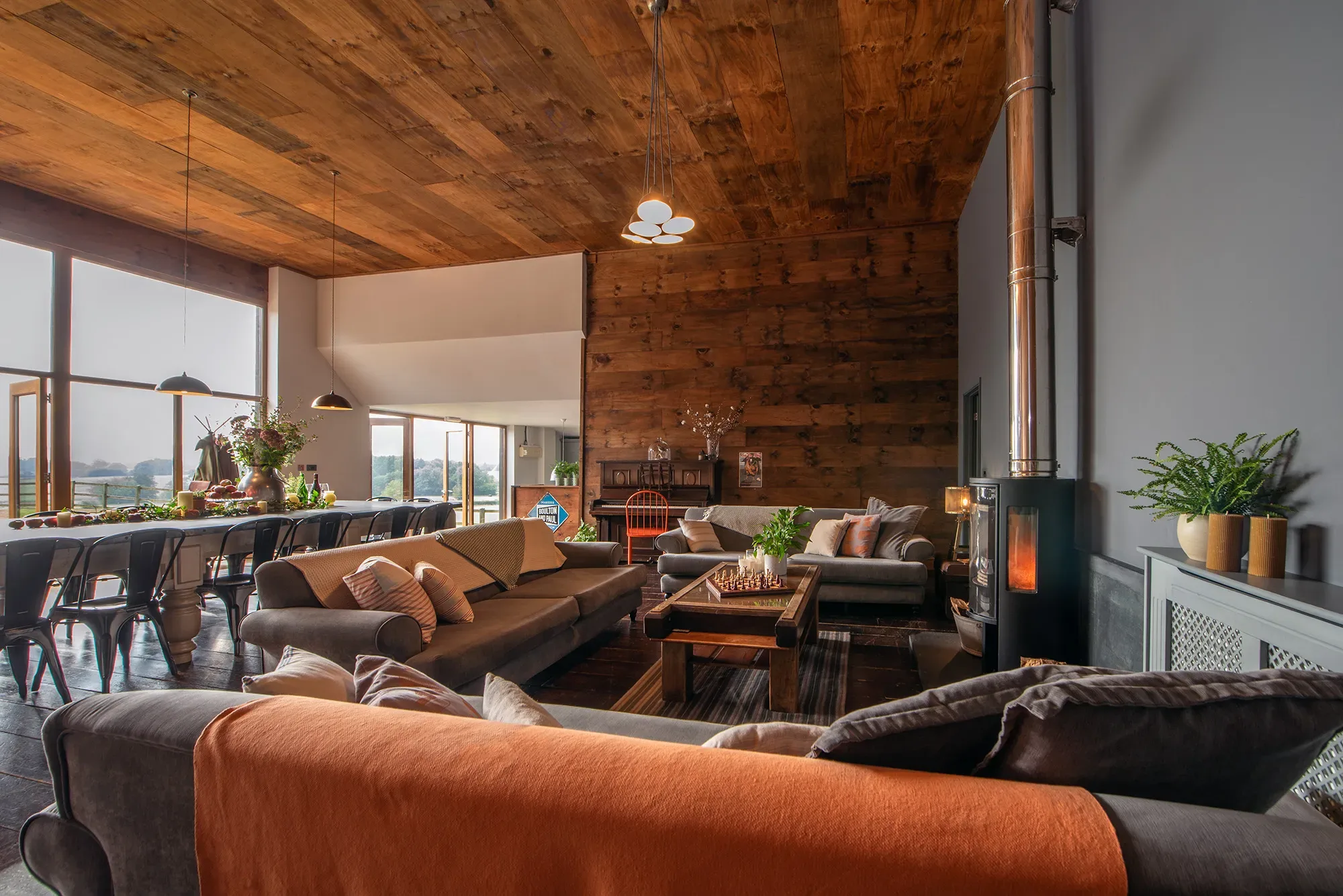 Set in the Somerset countryside, The Shed is a relaxed and well-designed retreat created with group stays in mind. Surrounded by rolling West Country landscapes, the house combines generous communal spaces with a peaceful rural setting, making it easy to slow down and enjoy time together. A large open living area sits at the heart of the home, warmed by a log burner and framed by far-reaching views across fields and countryside.