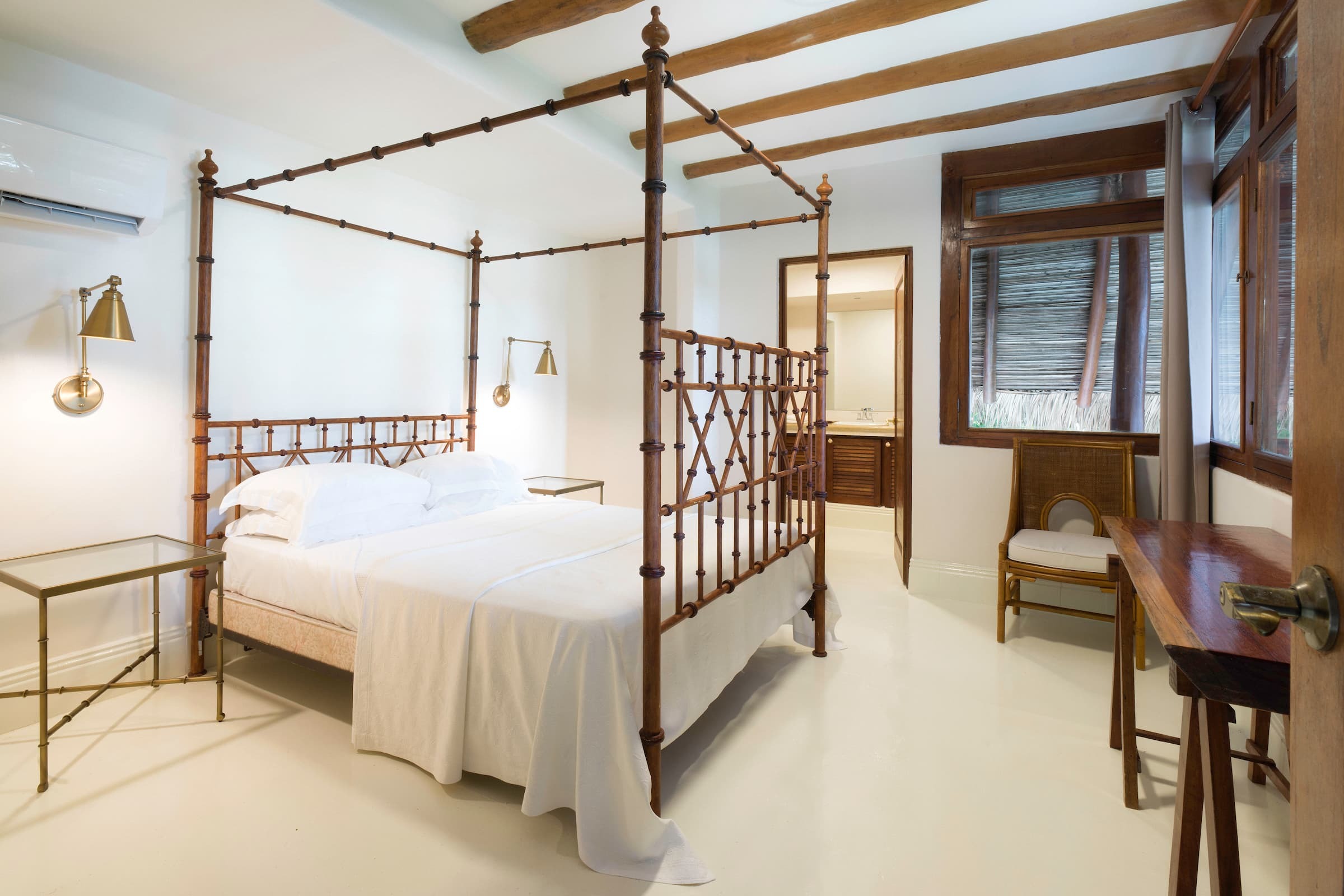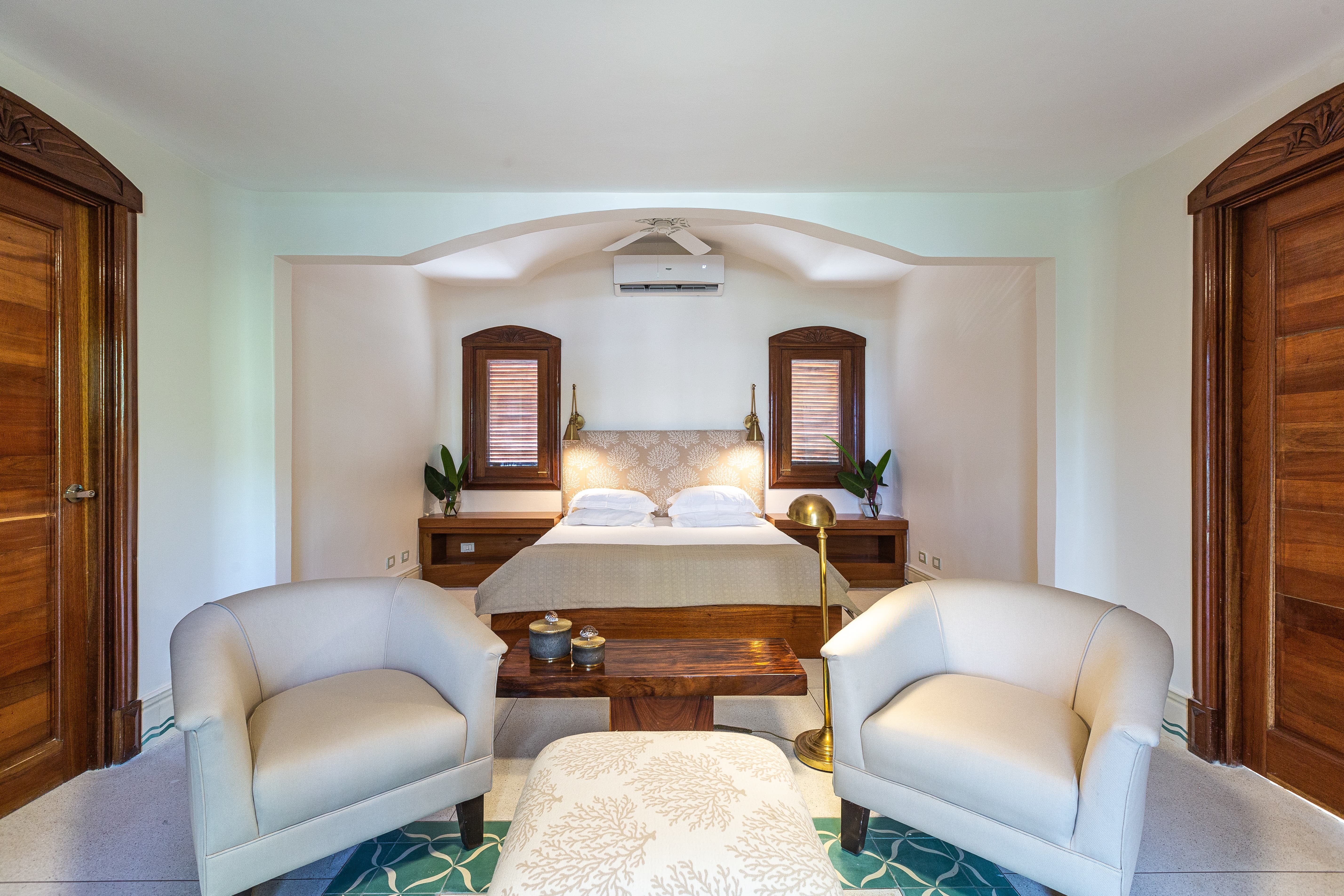 The estate accommodates up to sixteen guests across four private guest ranchos, each containing two bedrooms arranged across two floors. Ground floor master suites include king beds, comfortable sitting areas, dressing rooms, and spacious bathrooms featuring both indoor and outdoor showers. Upstairs bedrooms can be configured with either two twin beds or a king bed, offering flexible arrangements for families or groups travelling together. Daily housekeeping and laundry services are provided by the estate’s dedicated staff.